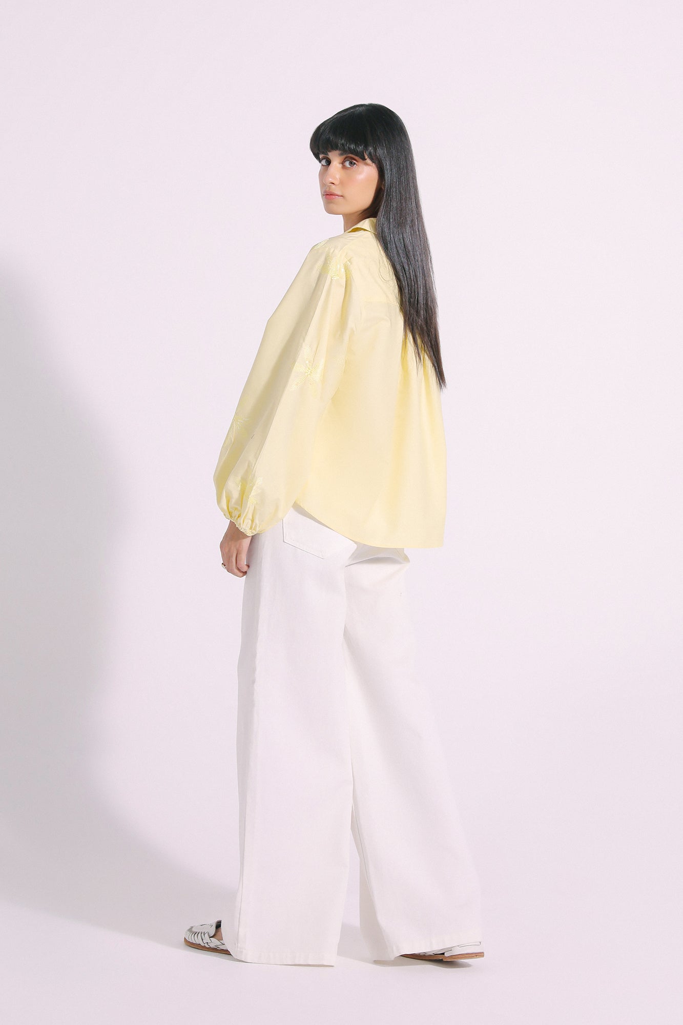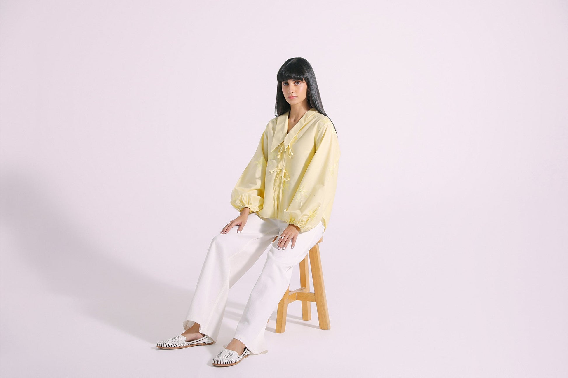 Introducing the perfect option for summer season; a graceful, elegant, and trendy top in bright yellow shade. Its contemporary silhouette features a collar neck and elasticated sleeves opening with draw strings at the front, creating a gleaming finish. Perfect for your wardrobe!