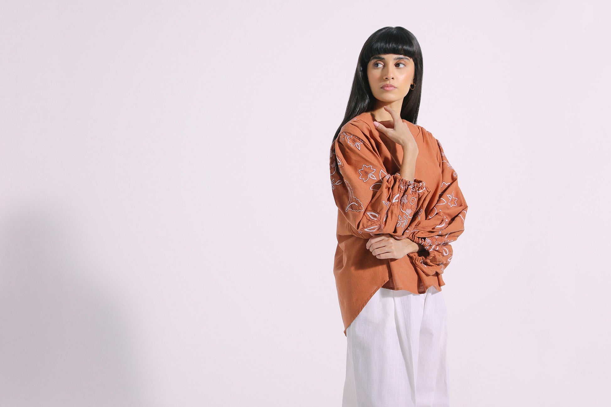 An enchanting composition is portrayed on this trendy top rendered in a captivating brown color. Crafted in a chic silhouette with gathers at shoulder and enhanced with elasticated sleeves opening, the trendy top is enriched with intricate floral embroidery at sleeves with contrasted ivory threads. This contemporary top is a perfect option to style at fun occasions this season.