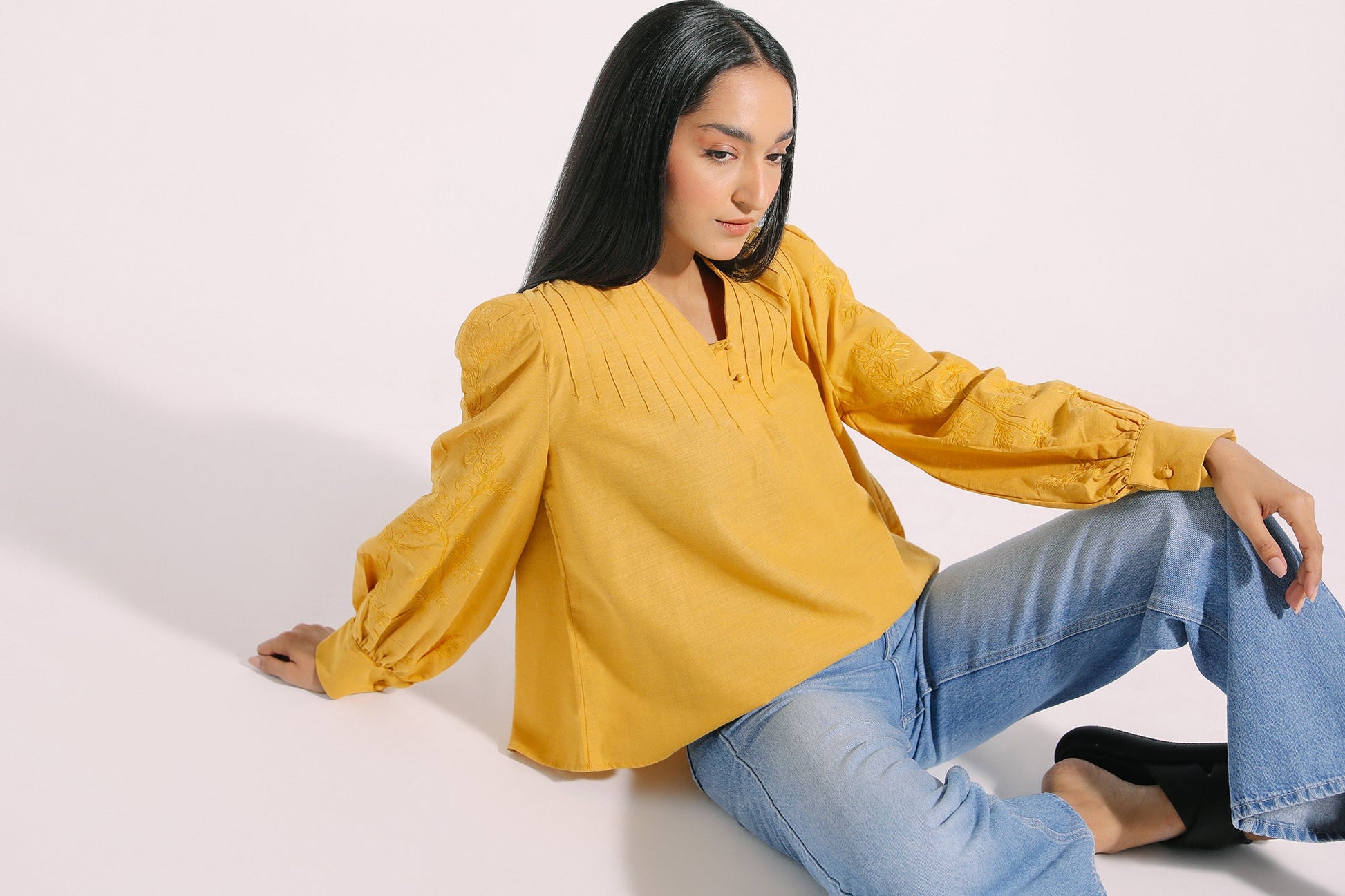 A chic and trendy design is portrayed on this contemporary peplum silhouette top illustrated in a gleaming mango yellow shade. Enriched with pleated design at front yoke and enhanced with cuffed sleeves, this elegant top is adorned with intricate embroidery at sleeves and is a must have to embrace the sassy look this season.