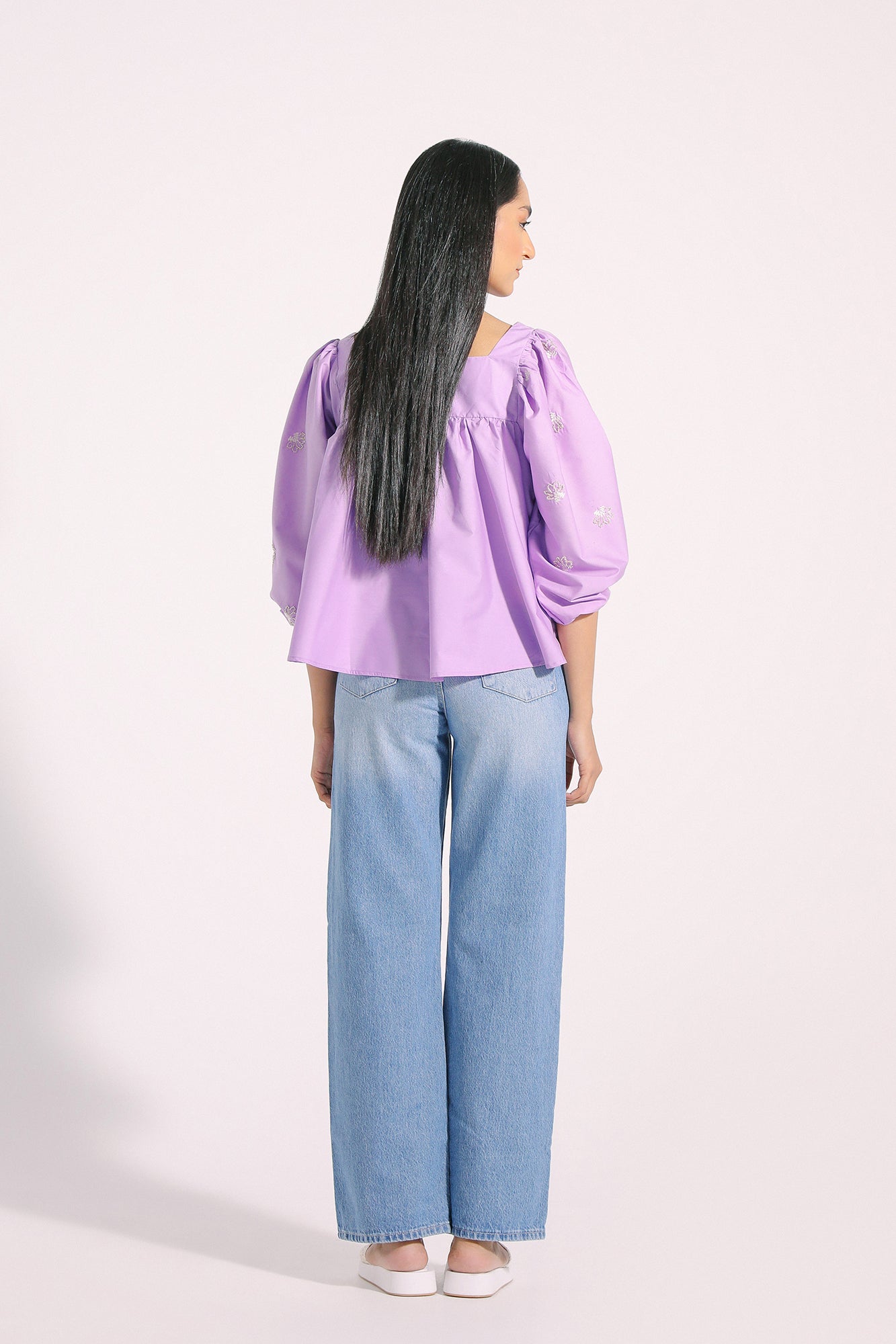 A classically chic design is layered over this trendy peplum top rendered in a majestic lilac shade. Adorned with gathers below yoke and at shoulders with elasticated opening and enriched with intricate floral embroidery, this trendy top is a statement piece to embrace at fun occasions.