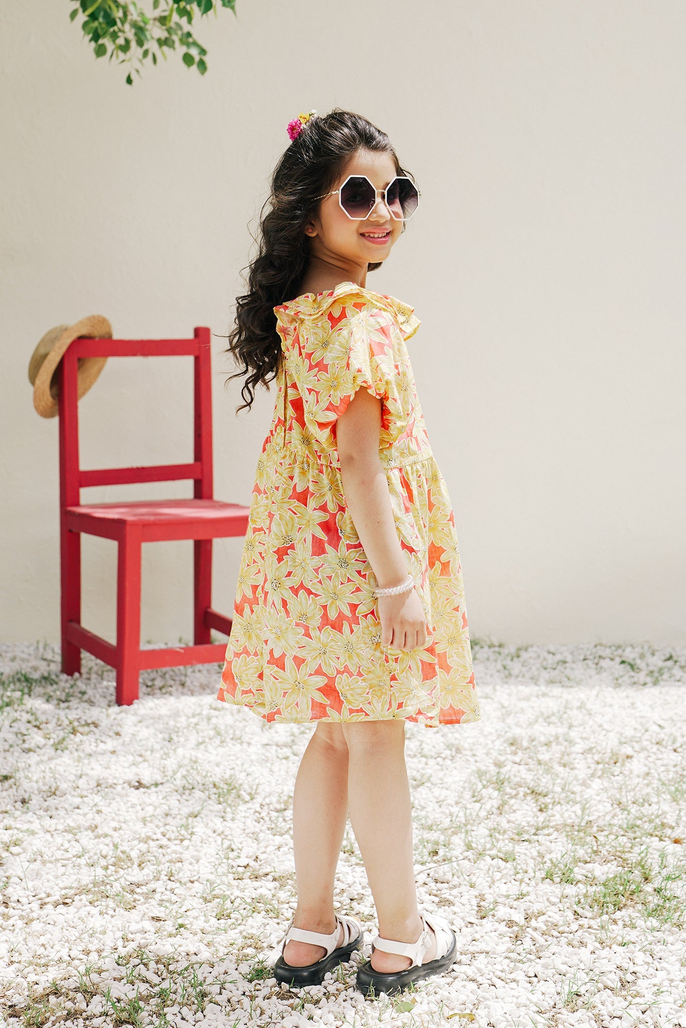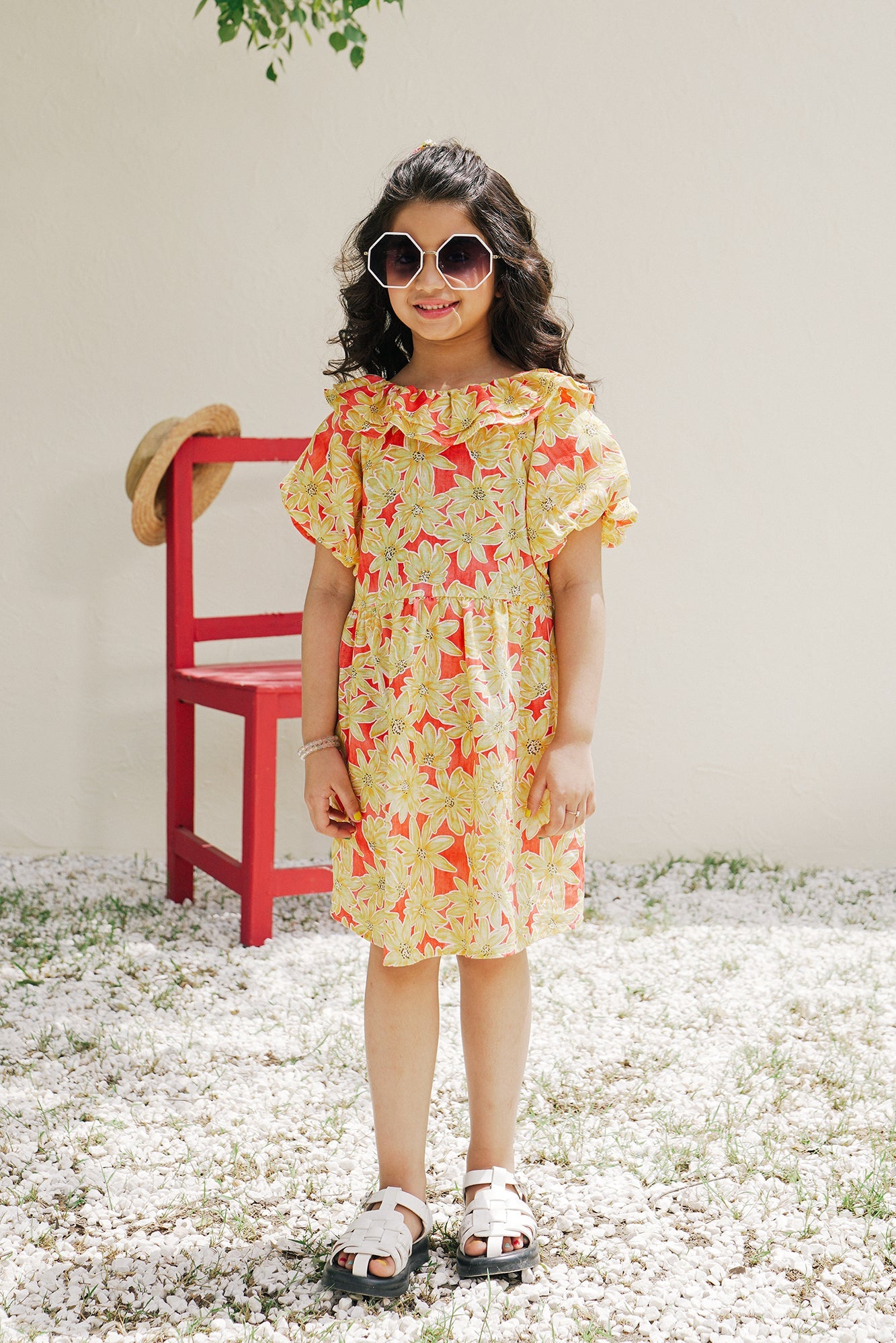 This graceful top is an elegant choice for kids fashion. Its deep red canvas and bright yellow floral prints create a contemporary silhouette perfect for summer parties. A must-have for little girls, featuring a frill at the neckline.