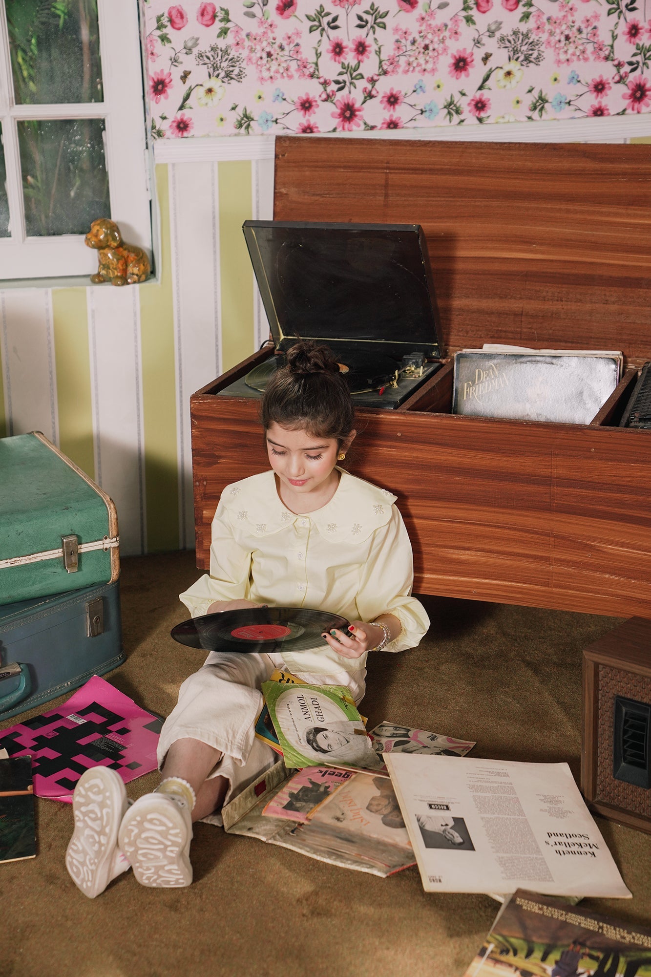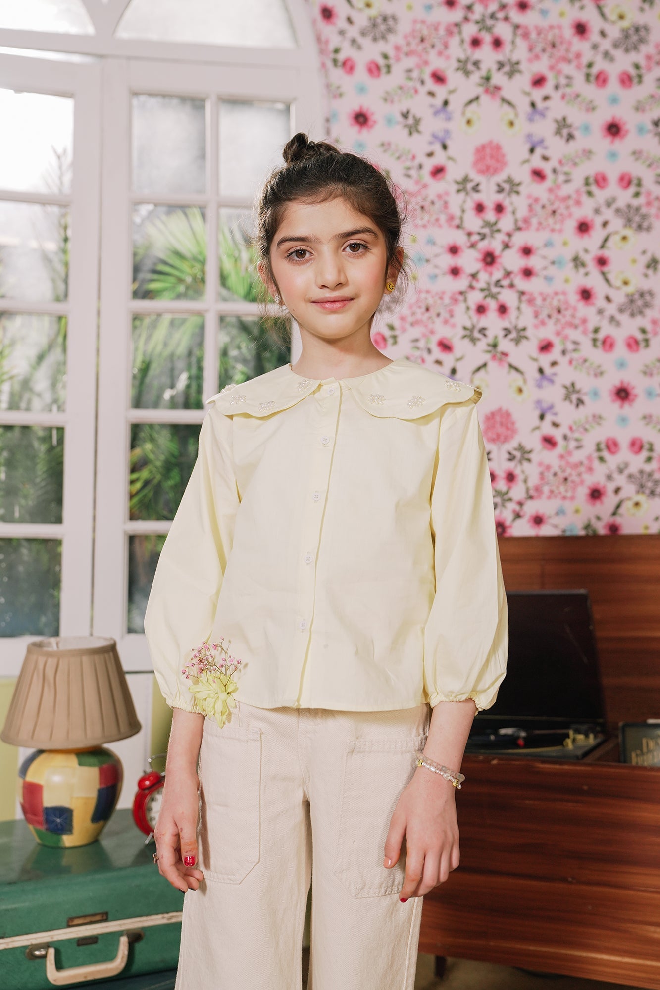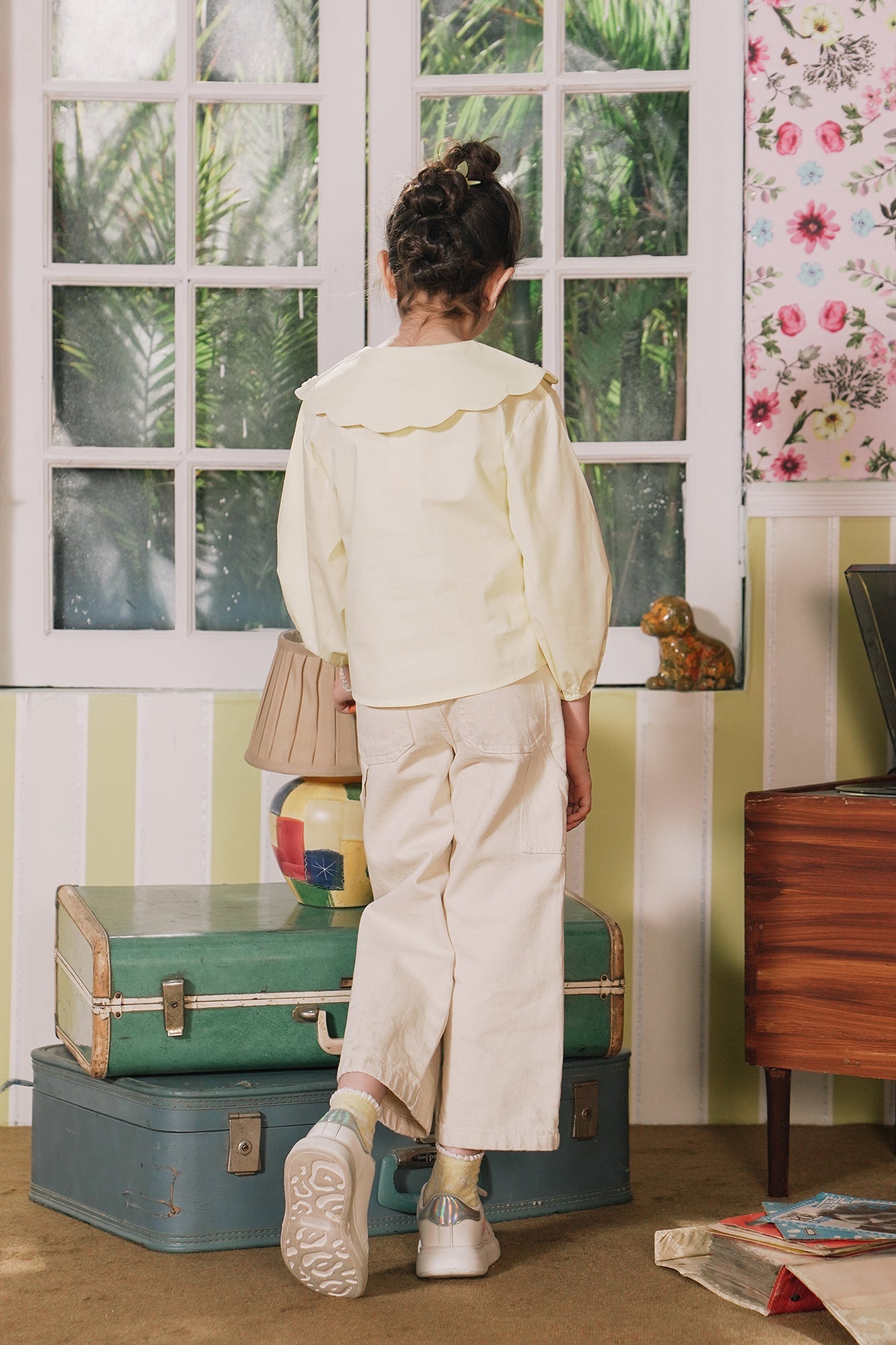 A classically chic design is portrayed on this graceful top rendered in yellow beige shade. It illustrates an elegant button down top beautifully adorned with peter pan collar with scalloped edges and enhanced with scintillating embellishments. Style this elegant outfit at day gatherings this season.