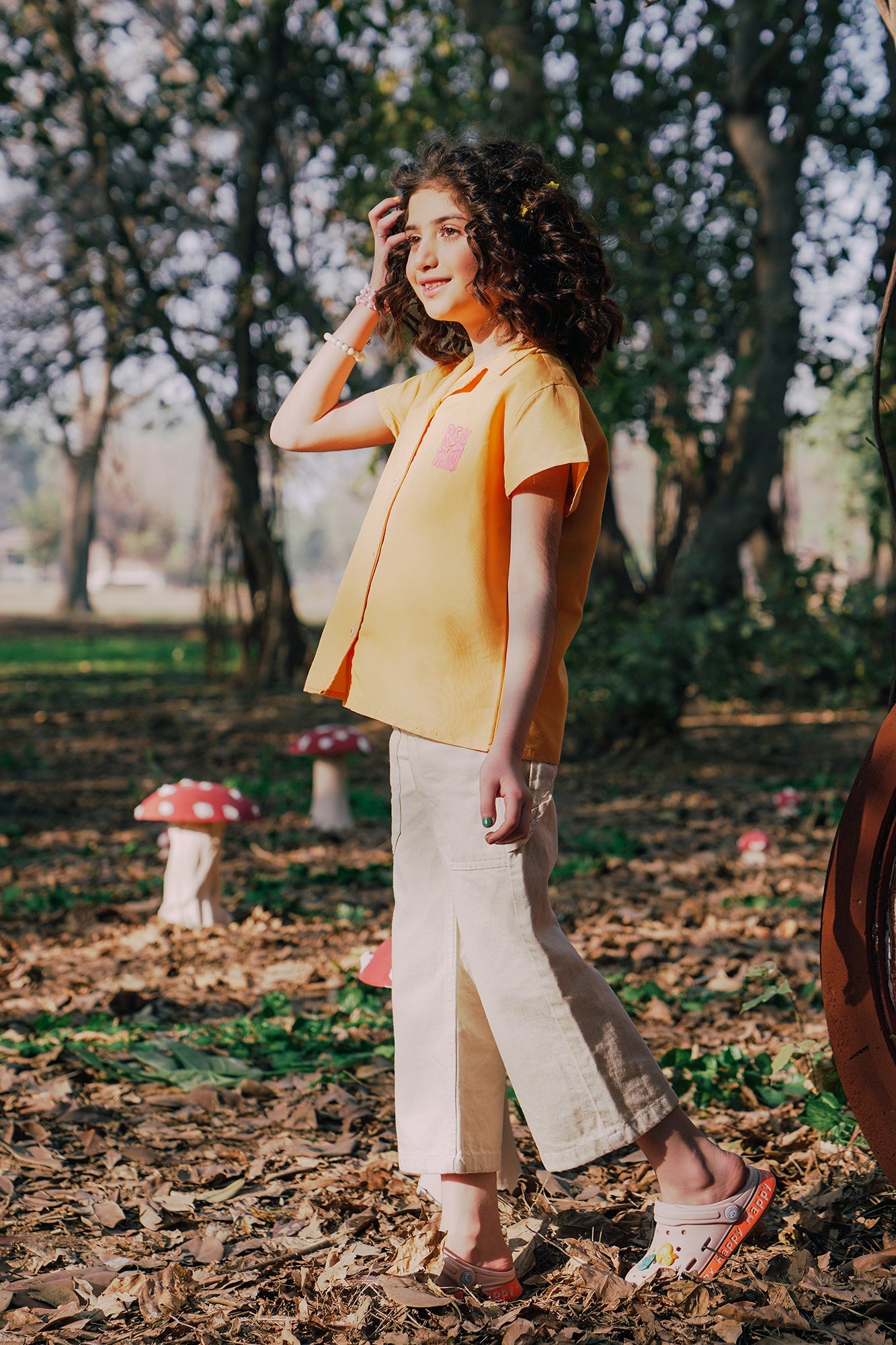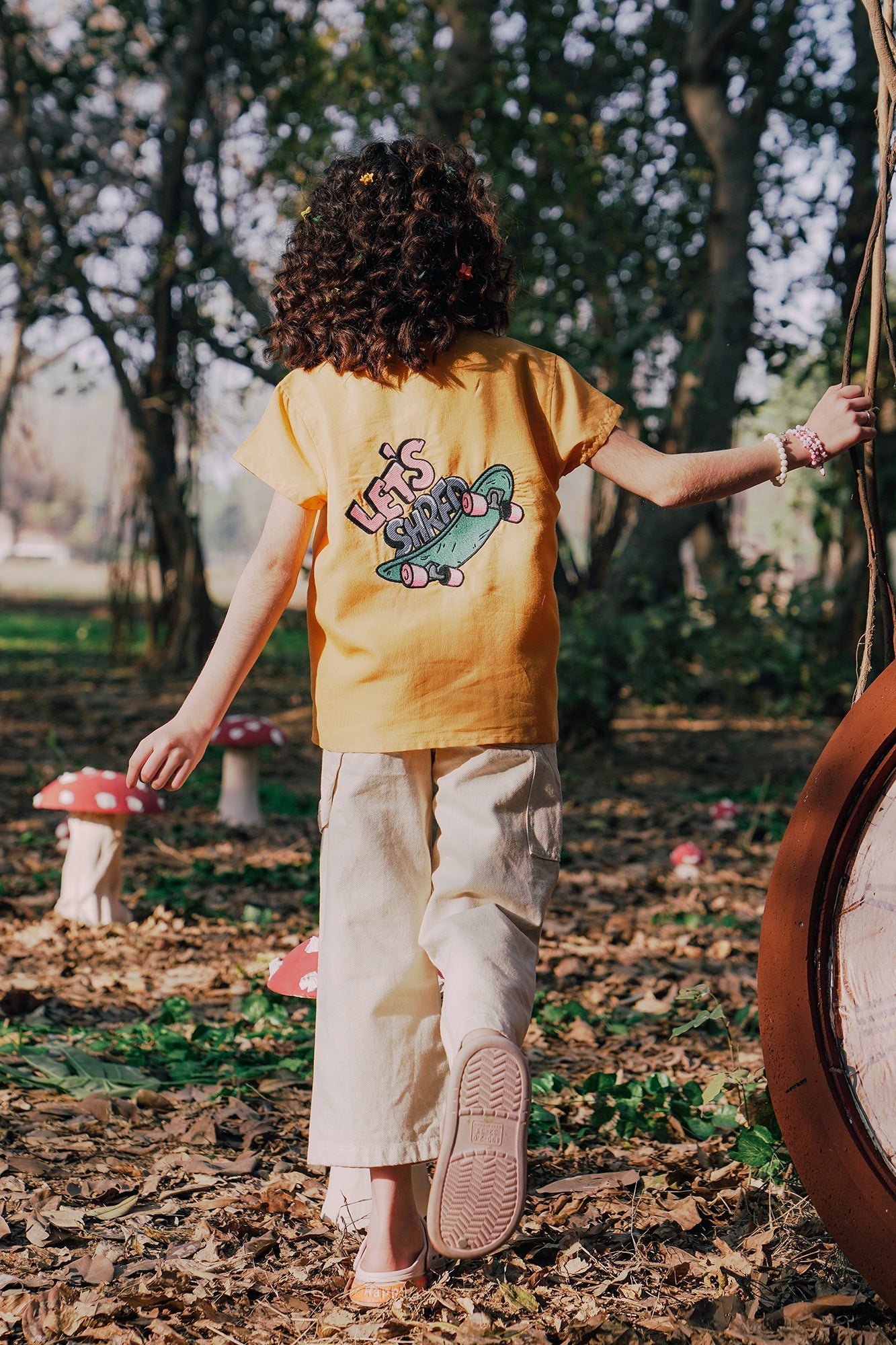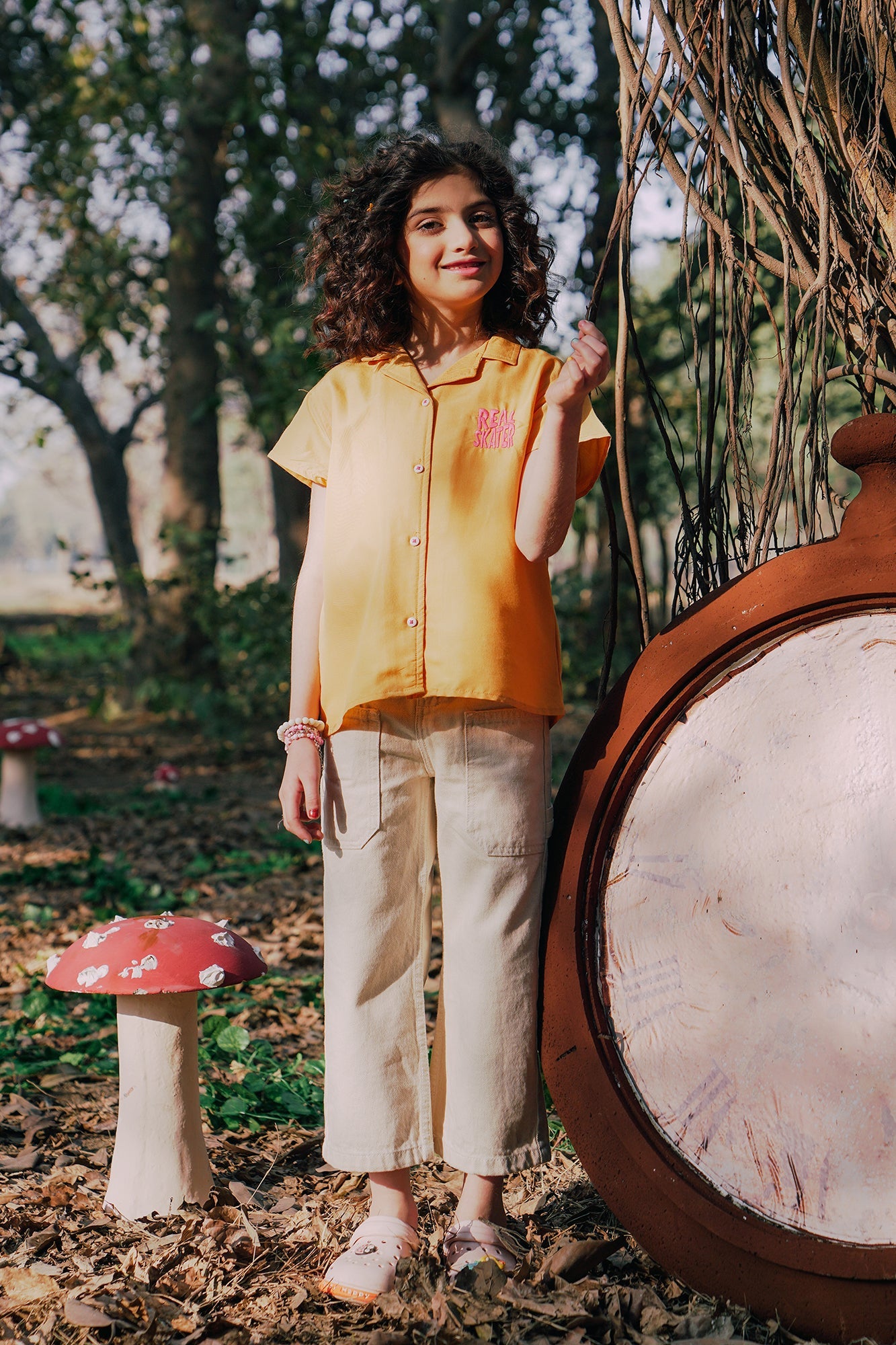 A chic yet contemporary design is portrayed on this trendy top rendered in a gleaming yellow shade. Crafted in an elegant button down silhouette, this exquisite shirt is enriched with quirky illustrations embroidered at front and back in appealing colors. Let your girls enjoy this summer season in this style statement outfit.