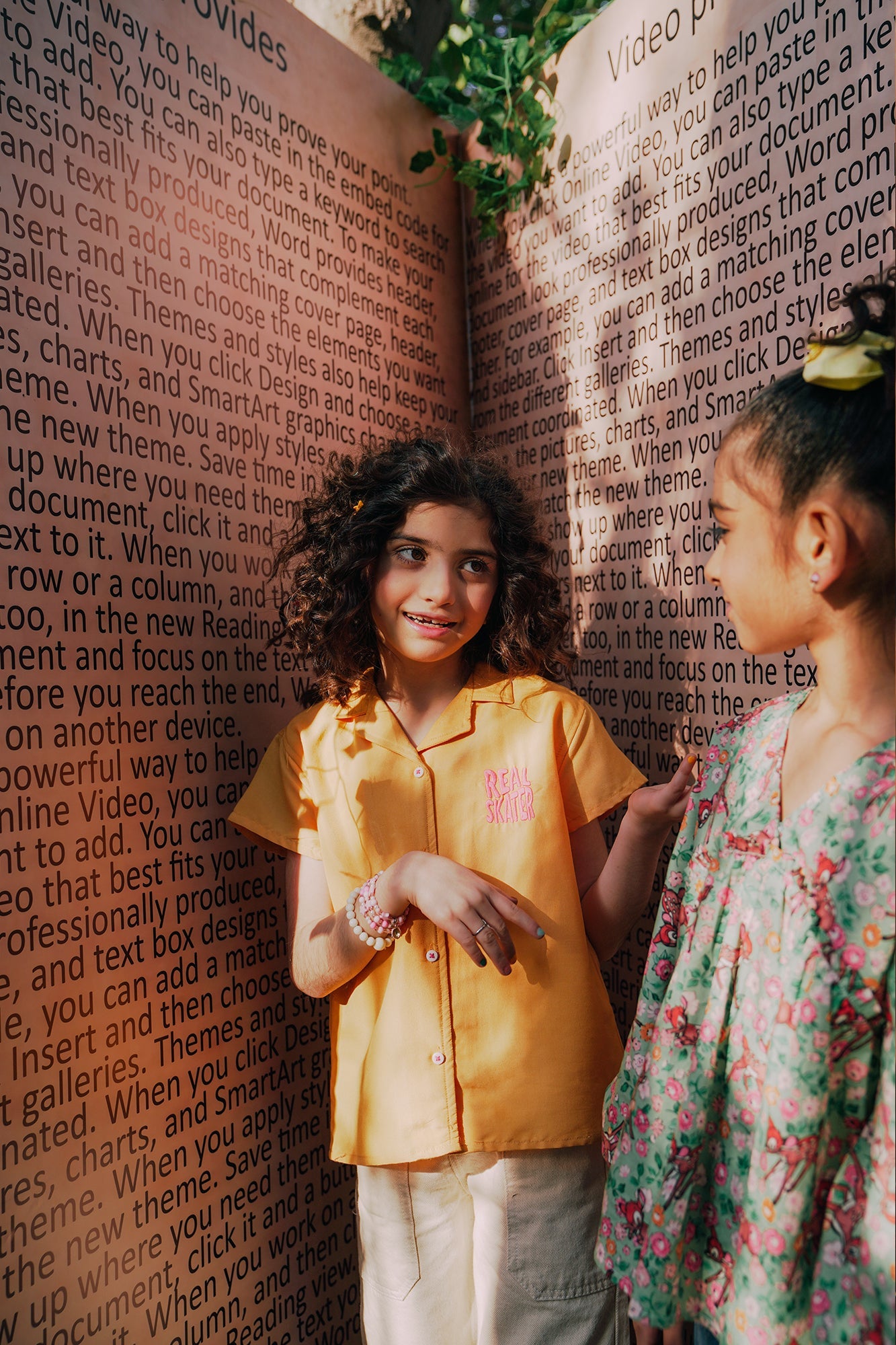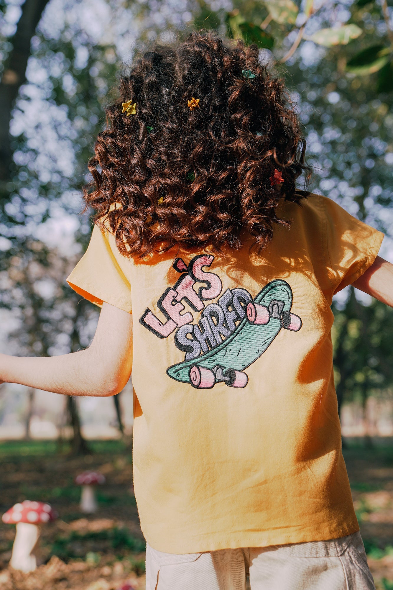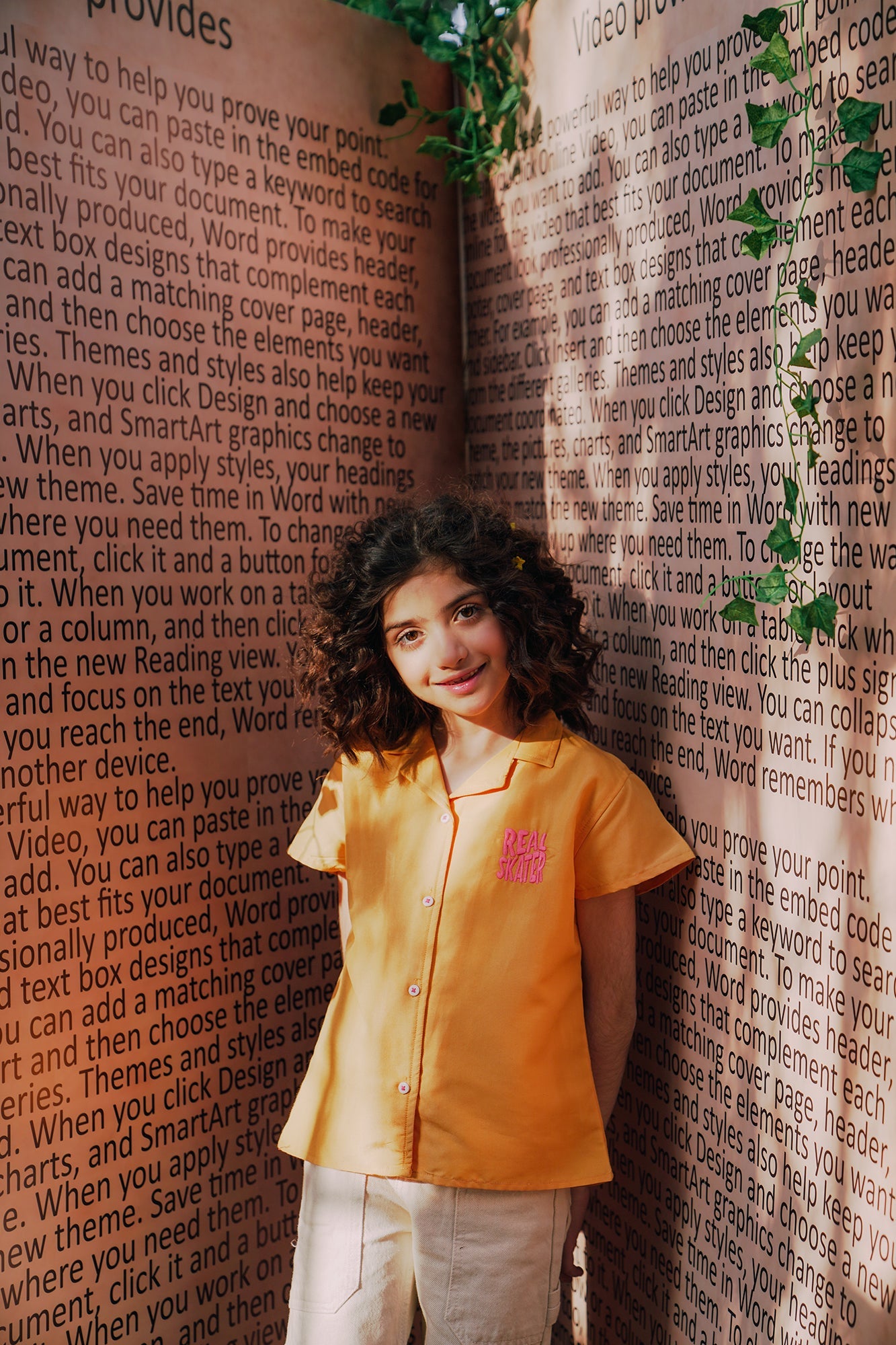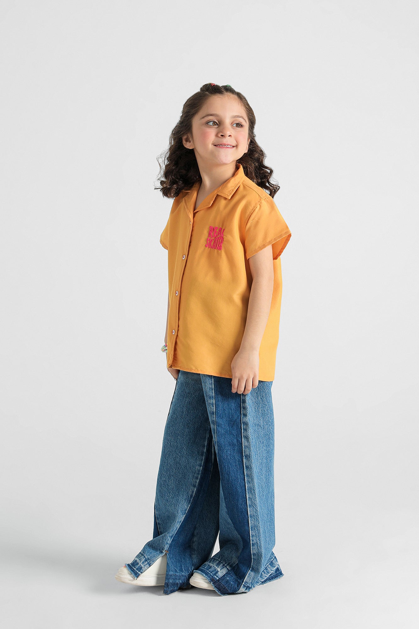 A chic yet contemporary design is portrayed on this trendy top rendered in a gleaming yellow shade. Crafted in an elegant button down silhouette, this exquisite shirt is enriched with quirky illustrations embroidered at front and back in appealing colors. Let your girls enjoy this summer season in this style statement outfit.