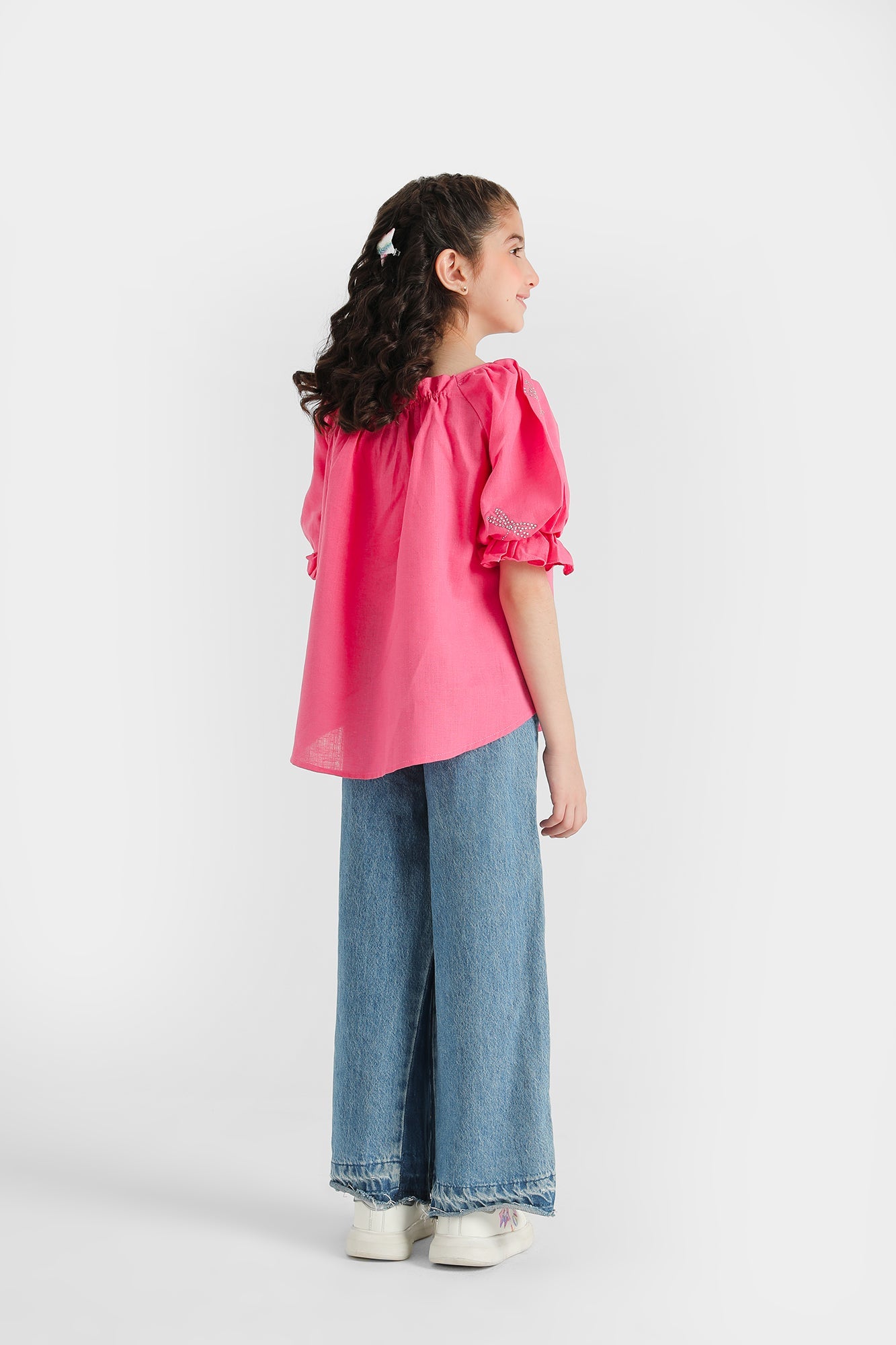 A classically chic design is portrayed on this graceful top rendered in bubblegum shade. It illustrates an elegant peplum silhouette with gathers at neck and shoulders. Beautifully adorned with scintillating beads illustrating flies, style this trendy outfit at day gatherings this season.