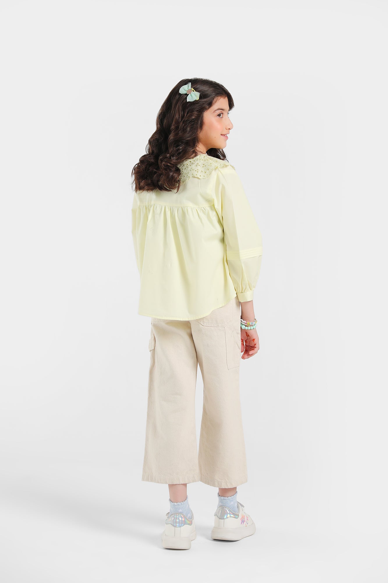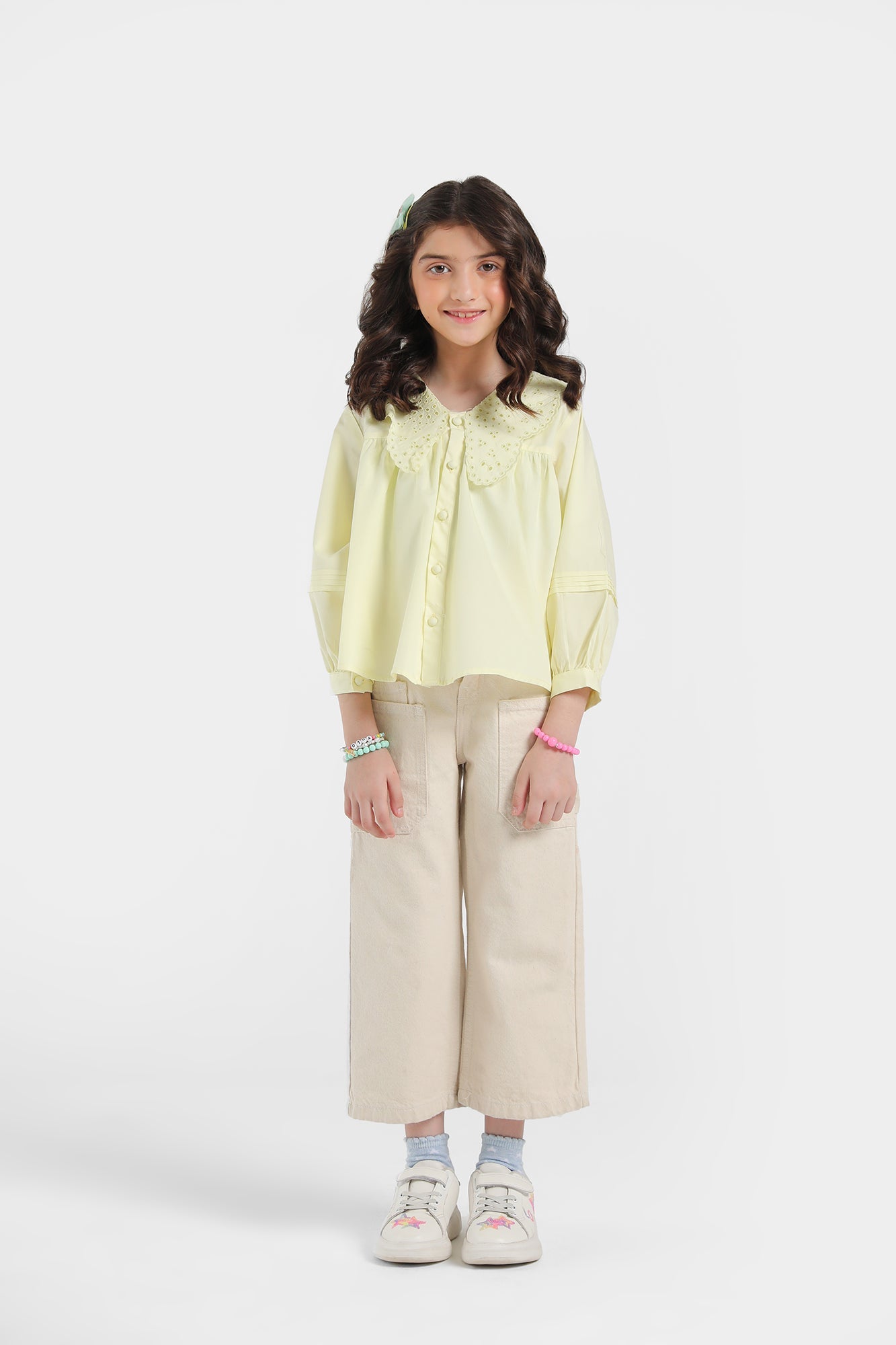 This enchanting top combines classic elegance with modern design elements. Its button-down style is perfect for kids in yellow beige hue and enriched with intricate embroidery at neck frill. This top will be a stylish statement for any occasion.