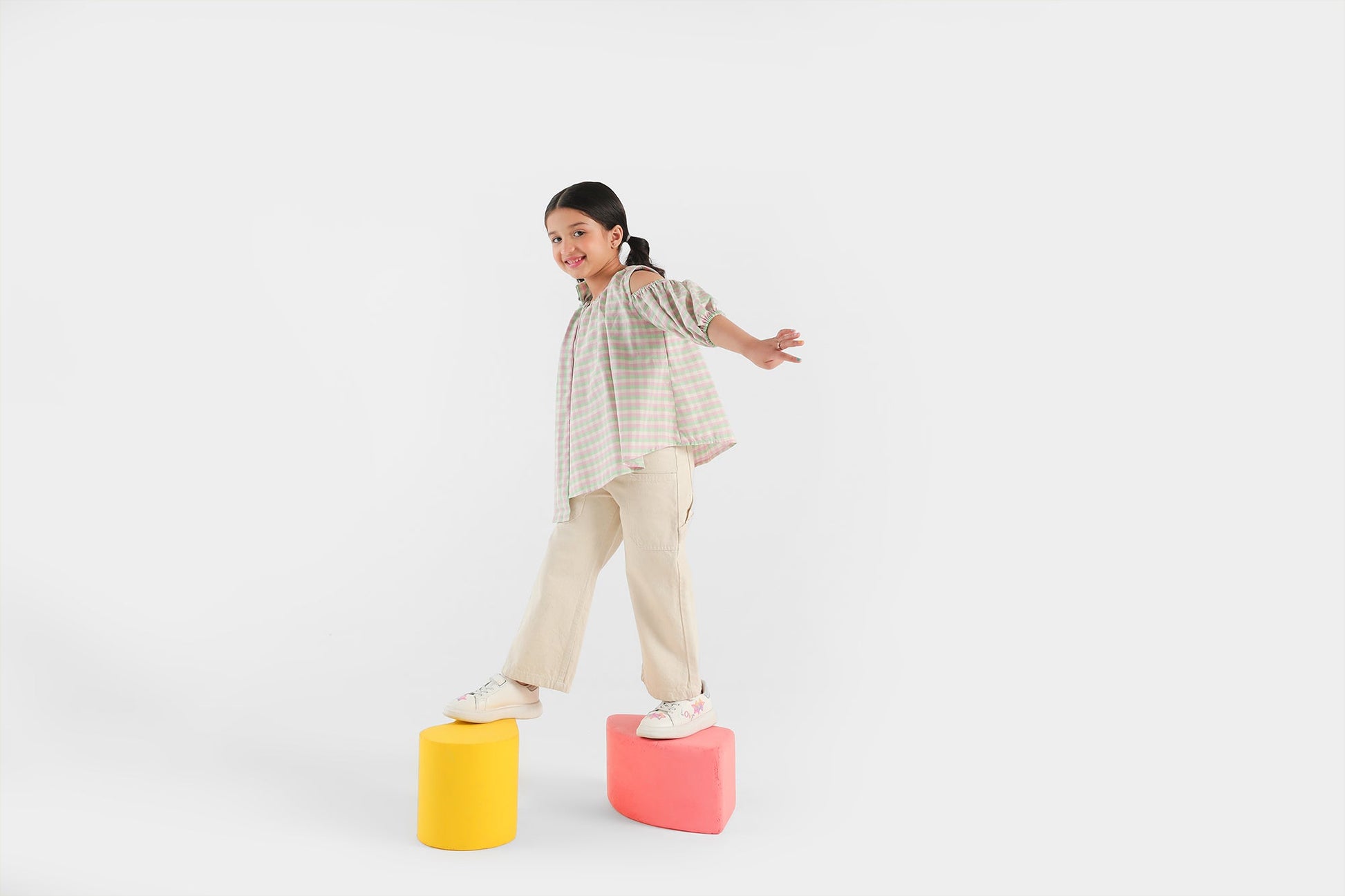 Make a statement with this trendy orchid-colored top. Featuring checkered prints blended with green tones, it features an experimental silhouette with cold shoulders and bow tie at the front. Be bold, be colorful, be stylish with this chic top to style this summer season.