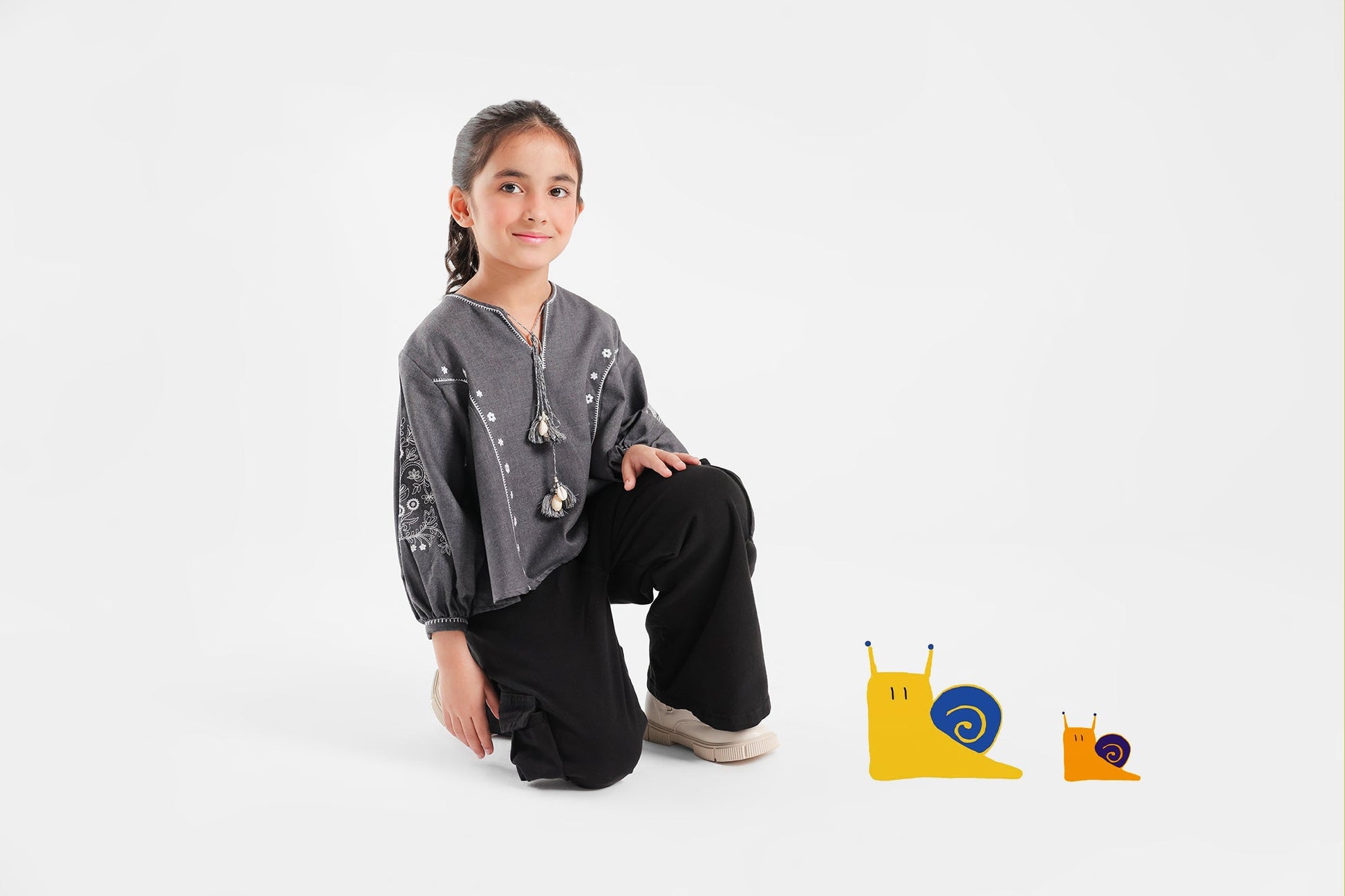 This enchanting top combines classic elegance with modern design elements. Its contemporary style is perfect for kids illustrated in an anthracite grey hue, while intricate floral designs embroidered in contrasted ivory hues add a stylish touch. Enhanced with dori and tassels at front neck, this top will be a trendy statement for any occasion.