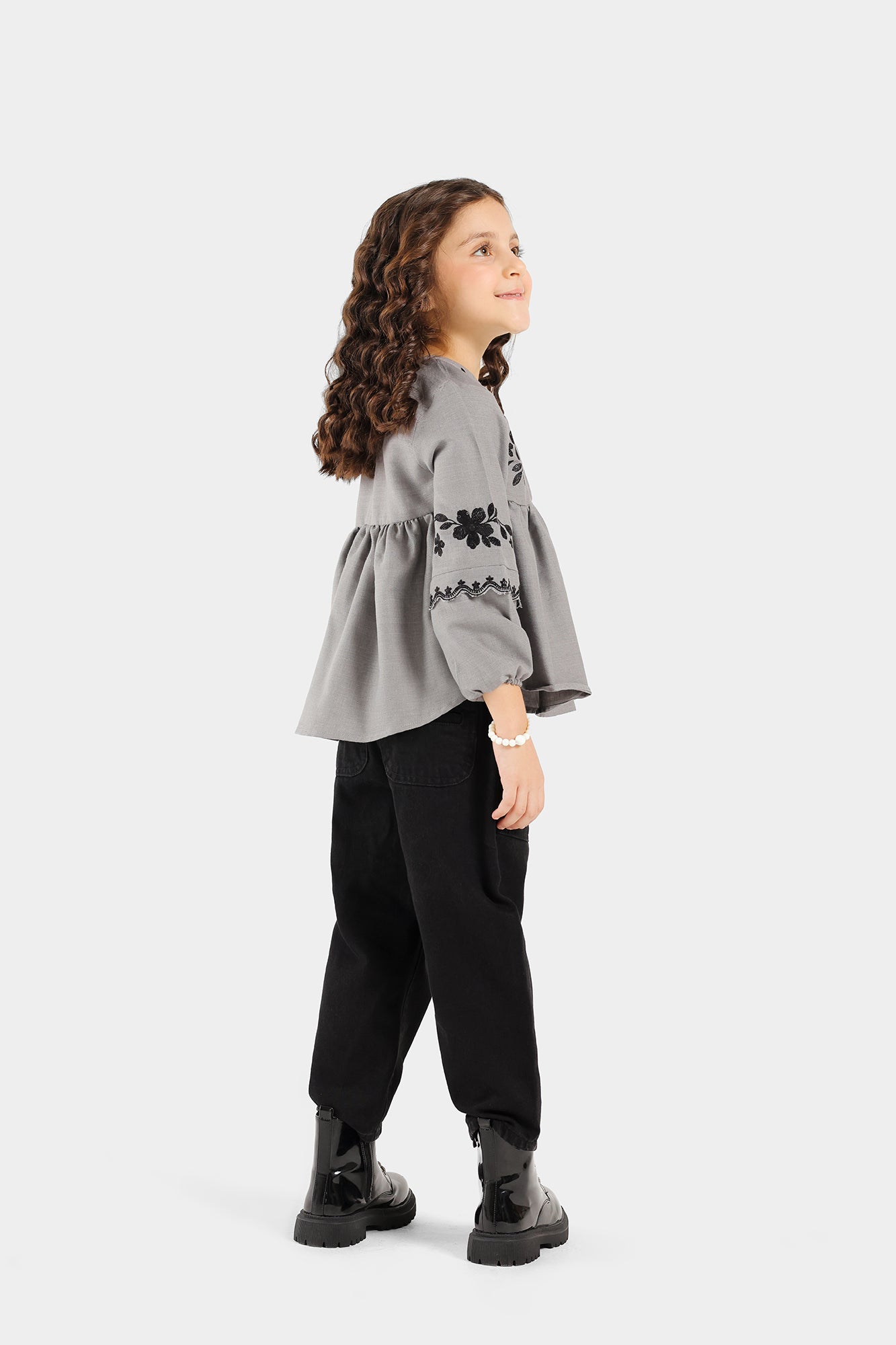 This enchanting top combines classic elegance with modern design elements. Its contemporary style is perfect for kids illustrated in a light grey hue, while intricate floral designs embroidered in contrasted black hues add a stylish touch. Enhanced with gathers below yoke and frill at sleeves, this top will be a trendy statement for any occasion.