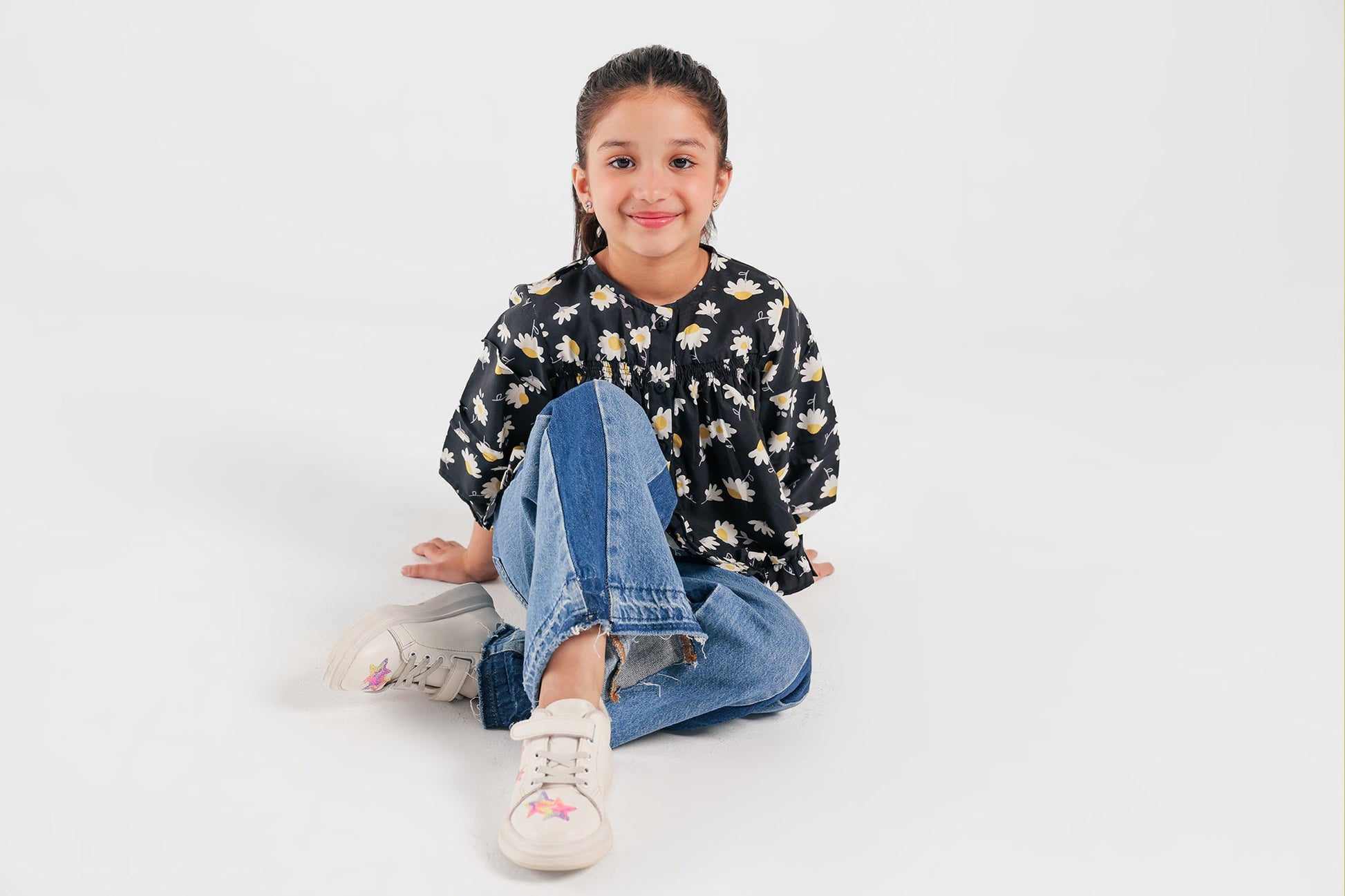 Introducing the gorgeous fusion outfit for girls. It features a button down top, in elegant black color, and a trendy silhouette with gathers. With adorable floral illustrations in vibrant hues, make any girl look fashionable and stylish in this trendy top!