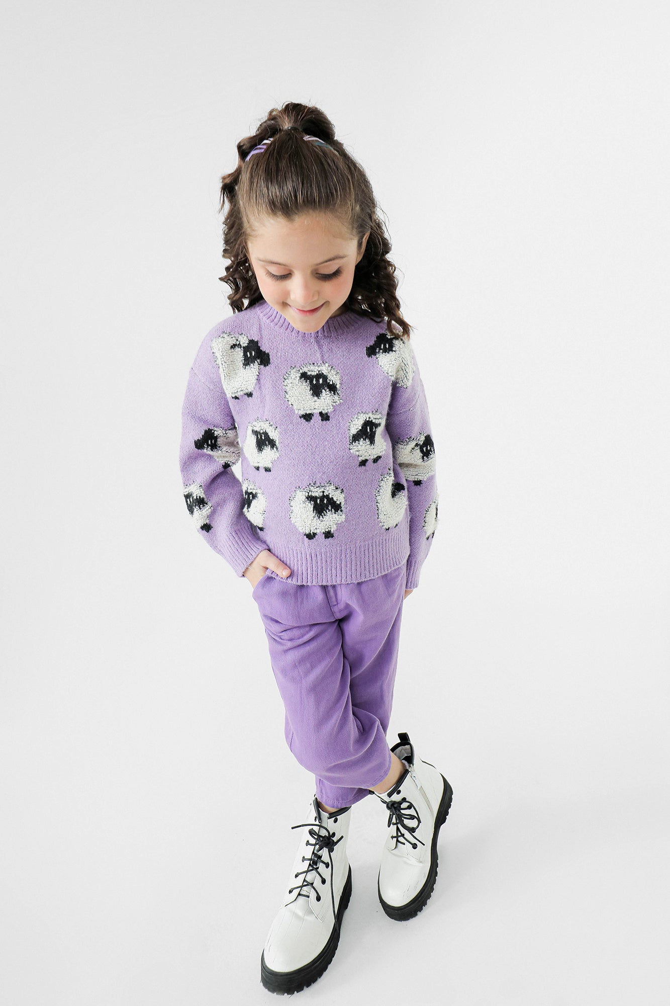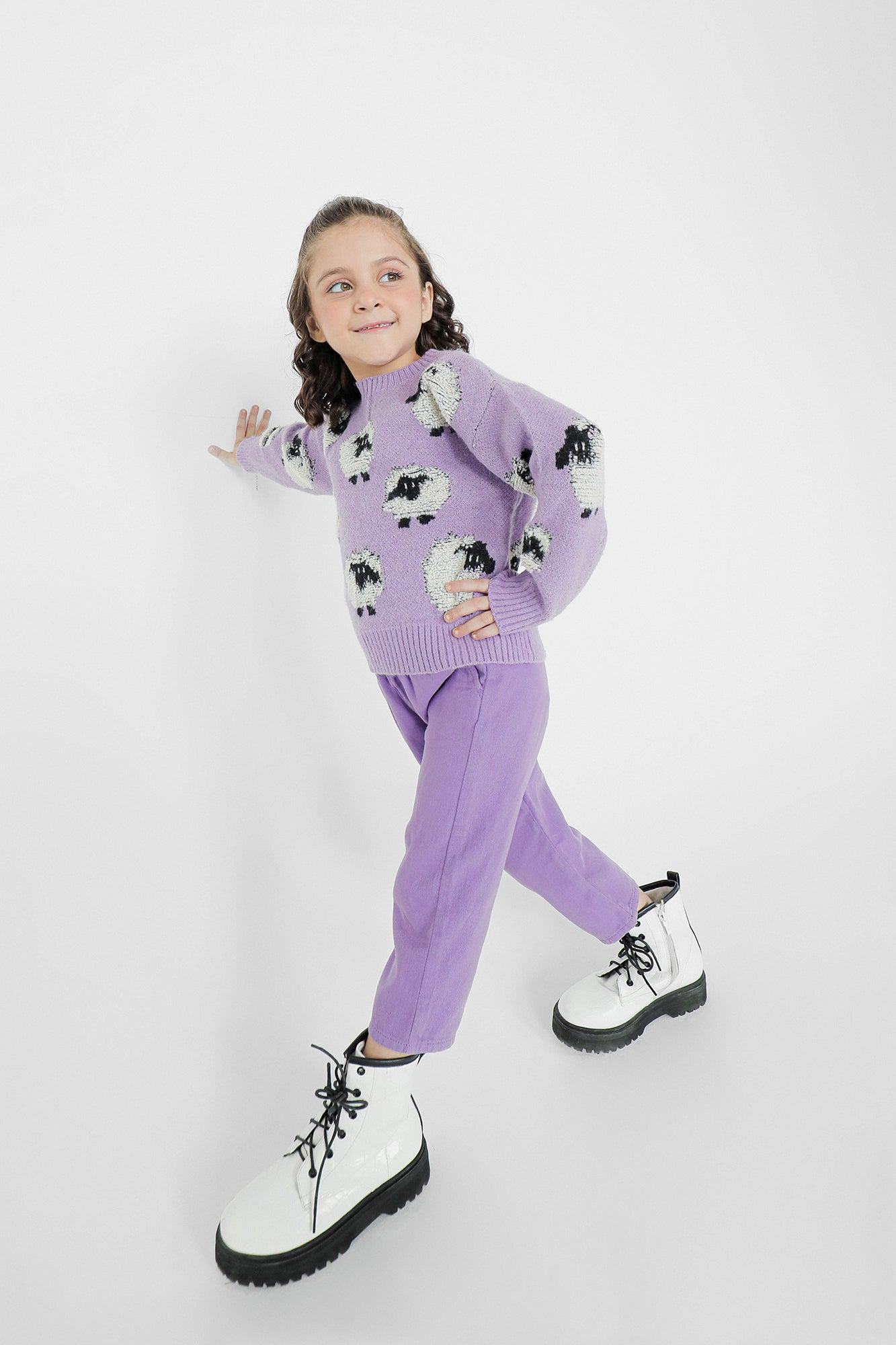An adorable composition is portrayed on this classy lilac sweater enriched with quirky cow illustrations depicted all over in contrasted white and black hues. Style this gorgeous sweater to fun parties this winter season.