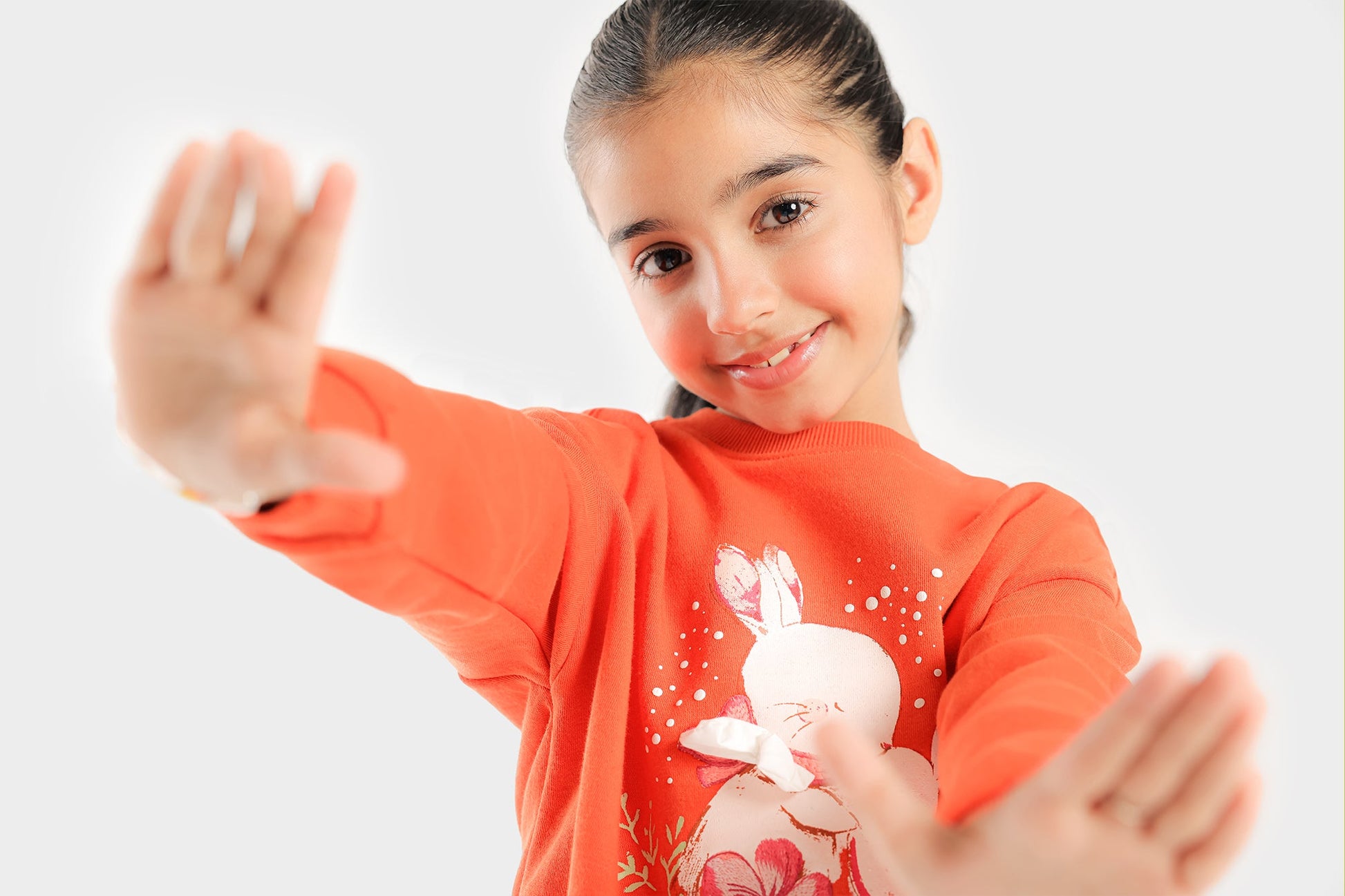 A classy yet elegant design is layered on this contemporary sweatshirt rendered in an appealing orange shade. It features a comfy silhouette and adorned with captivating illustrations printed at front. Let your girls look trendy in this statement sweatshirt to style this winter season.