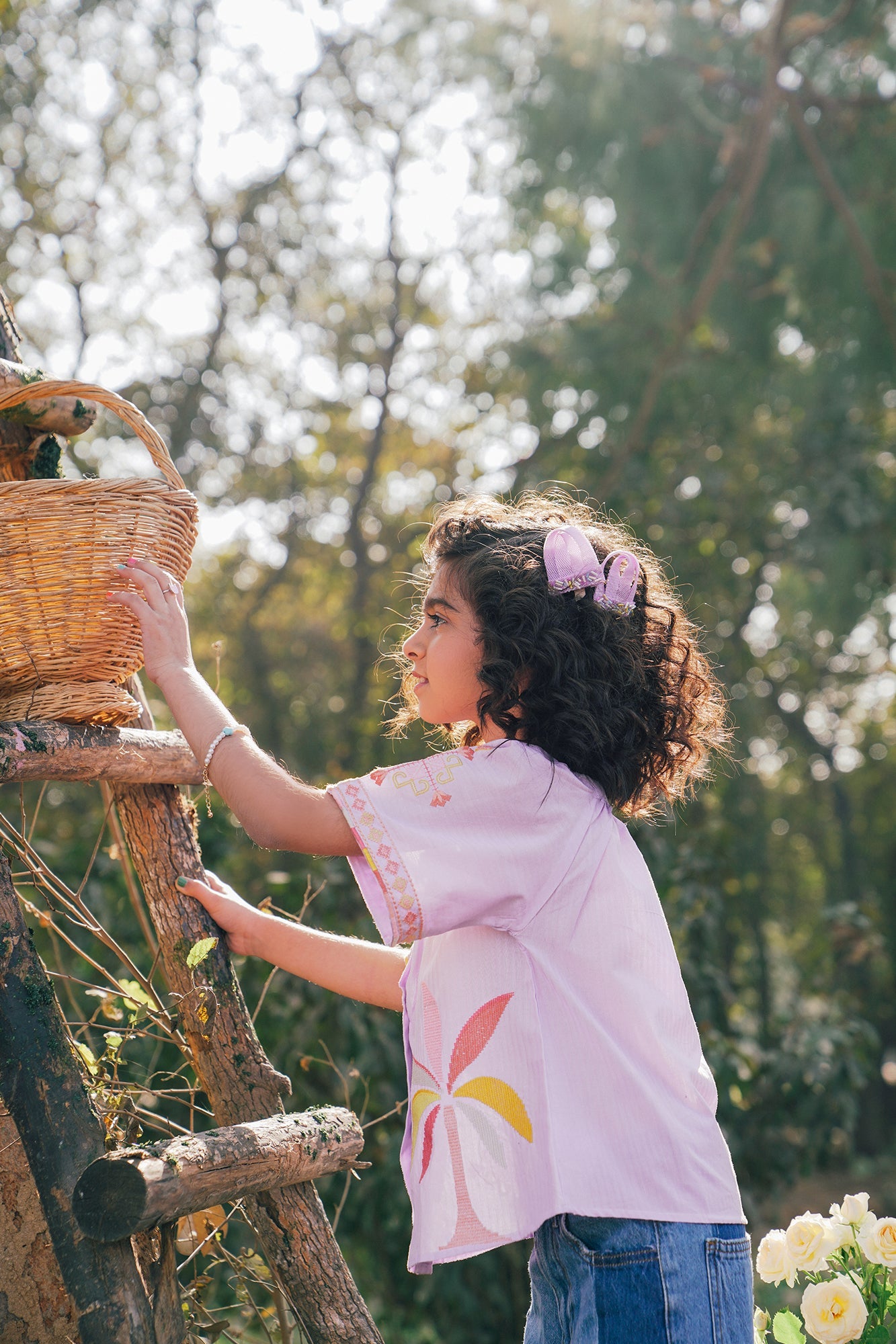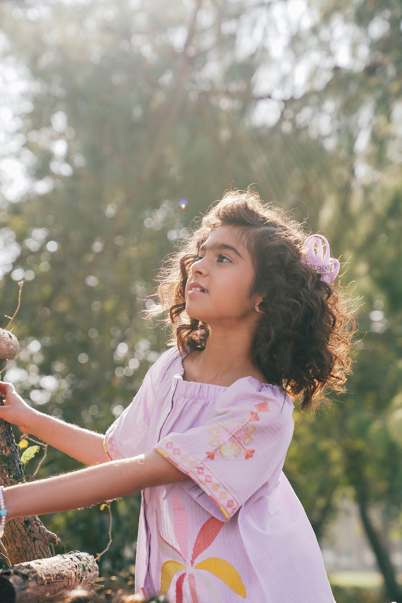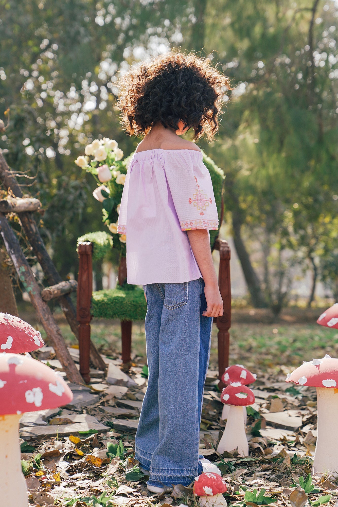 A gracefully elegant design is layered over this chic top rendered in pastel lilac shade. It features a classy button down silhouette with elasticated neckline. Beautifully enriched with intricate embroidery at front featuring floral designs in vibrant hues. Style this exquisite top at day gatherings this season.