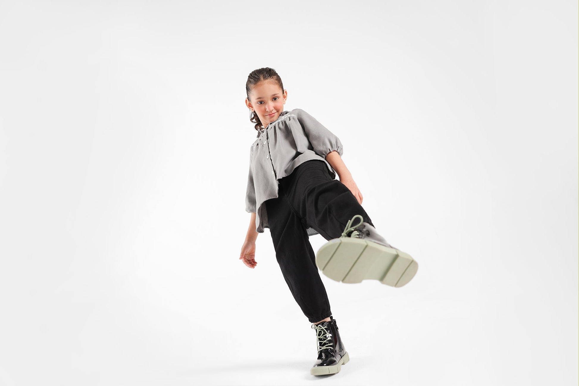 A fascinating design is layered over this trendy button down top rendered in a light grey shade. Adorned with gathers below yoke, this chic top is enriched with beautiful floral illustrations embroidered at front and sleeves in ivory hues. This statement top is a perfect option for your kids to style this pleasant season.