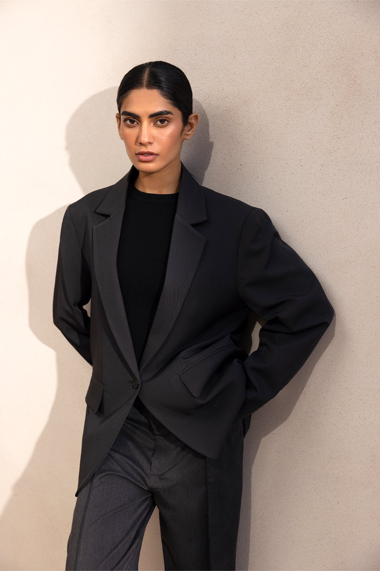 An elegant yet graceful design is portrayed on this trendy blazer rendered in a deep black shade. It features a stylish button down silhouette depicting a mesmerizing look to adorn at evening soirees this happening season.