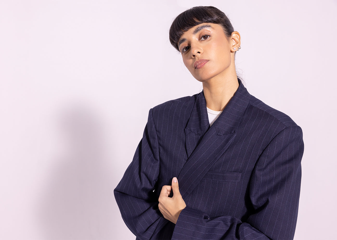An elegant yet graceful design is portrayed on this trendy blazer rendered in a classic blue shade. It features a stylish button down silhouette depicting a mesmerizing look with stripes in contrasted white hues. Style this statement blazer at evening soirees and look classy this happening season.