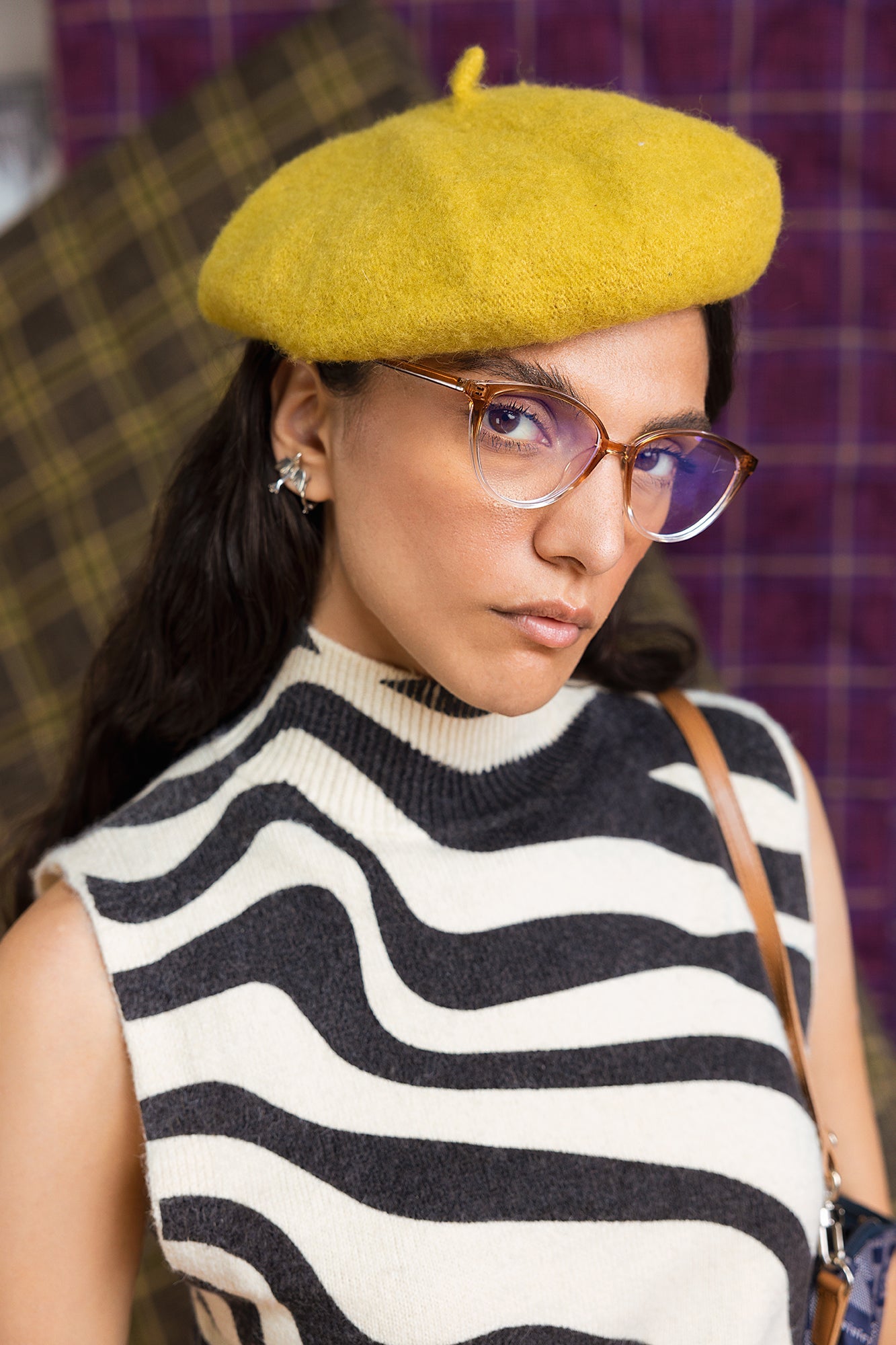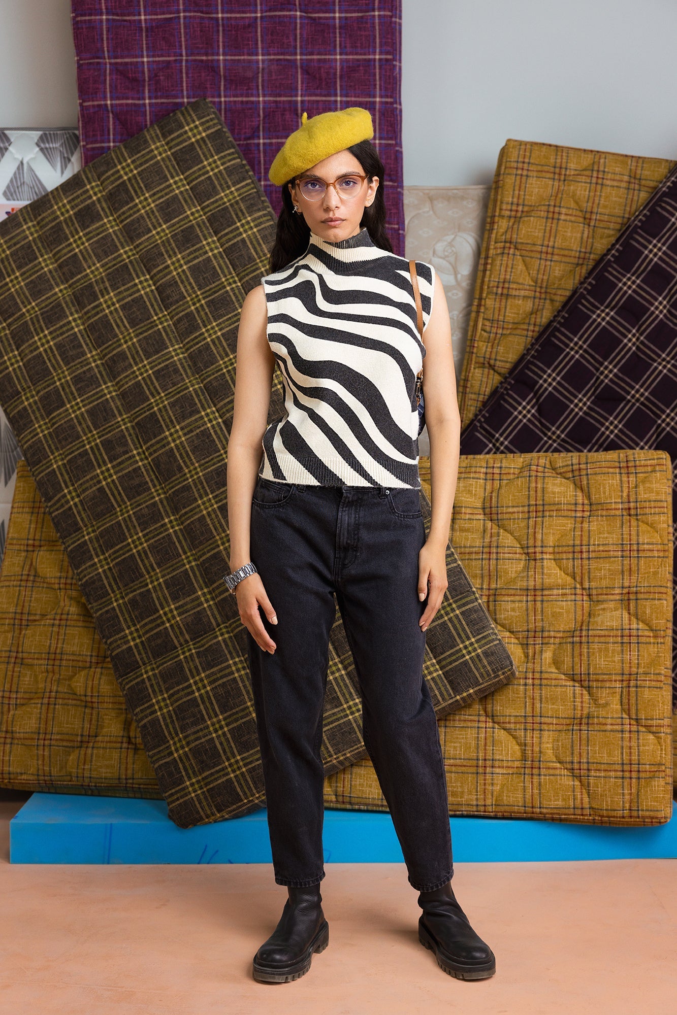 An appealing yet classic composition is portrayed on this creamy off white sweater gracefully crafted in a traditionally turtle neck sleeveless silhouette. A mood in itself with quirky stripes in contrasted black shade, this age old fashion inspired sweater is a perfect option to look trendy yet chic this winter season.