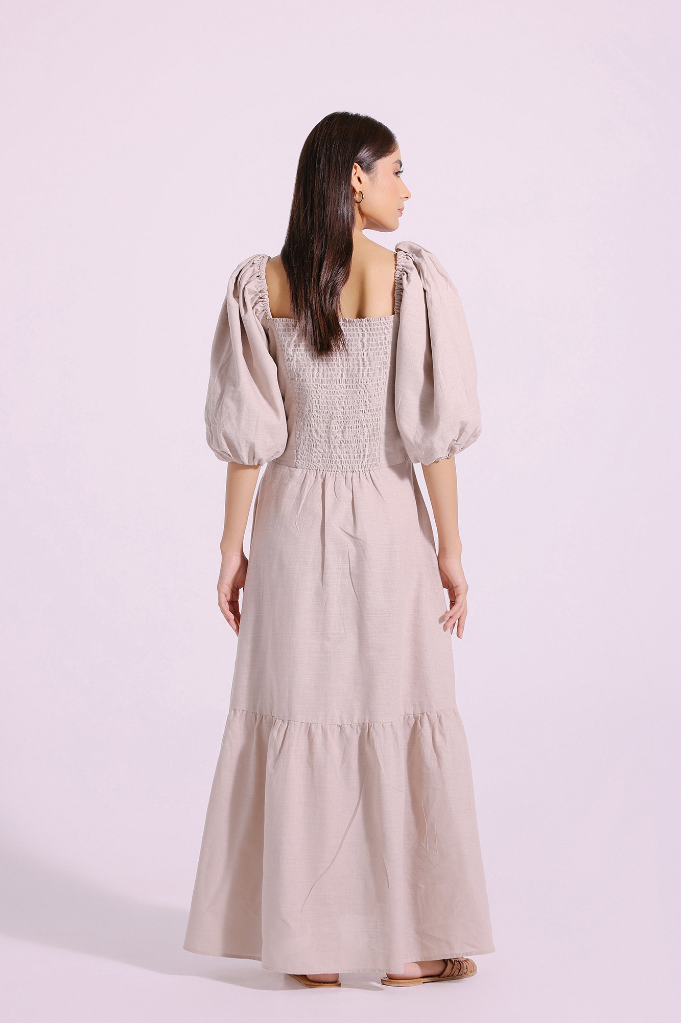 An aesthetically rich composition is layered over this trendy dress rendered in peanut shade. It is crafted in a contemporary silhouette with gathers. Beautifully enriched with intricate embroidery illustrating mesmerizing palm tree illustrations in vibrant hues, this radiant outfit is a great option to style at fun events this happening season.