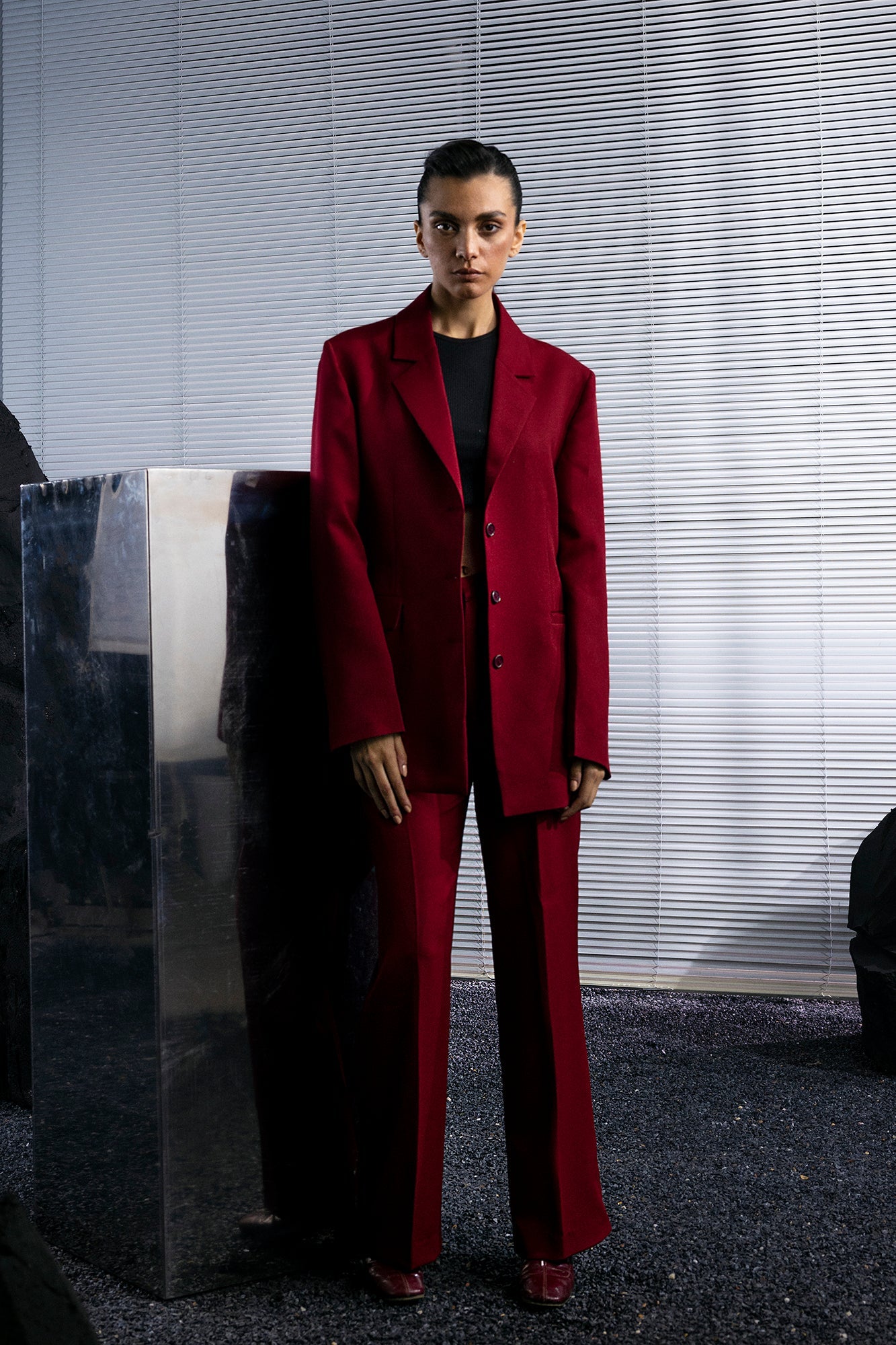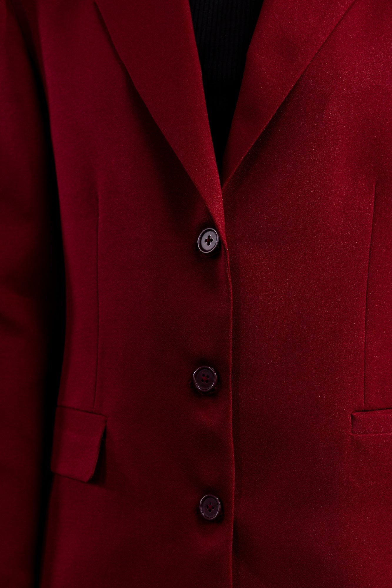 An elegant yet graceful design is portrayed on this trendy blazer rendered in deep maroon shade. It features a stylish button down silhouette depicting a mesmerizing look to adorn at evening soirees this happening season.