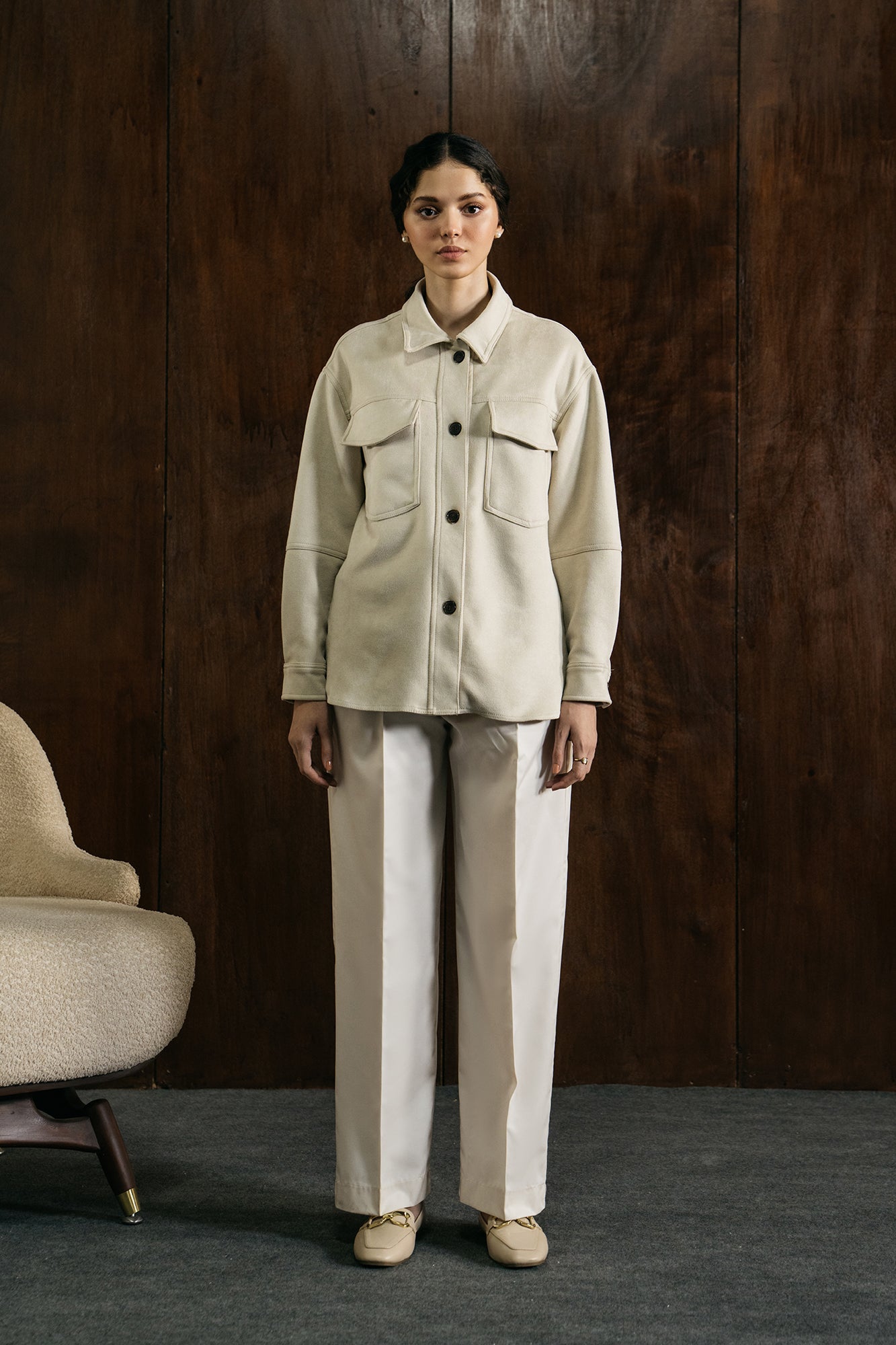 A classy yet chic design is portrayed on this elegant over shirt rendered in a creamy off white shade. It features a contemporary button down silhouette adorned with flap pockets at front making it a trendy shirt for winter gatherings.