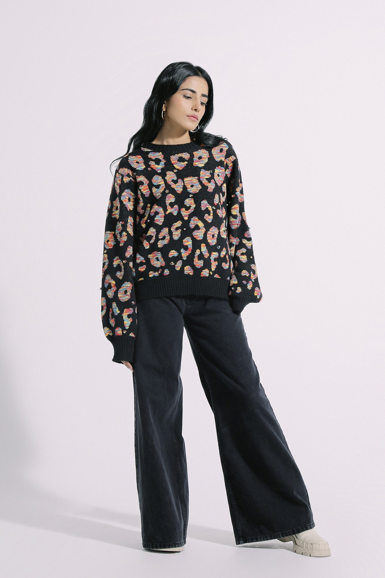 A dreamy composition is portrayed on this jet black sweater gracefully crafted in a chic silhouette with ribbed neck and sleeves opening. Designed with animal patterns in vibrant hues and enhanced with dazzling beads, this divine sweater is a great option to stay warm and look elegant this winter season.