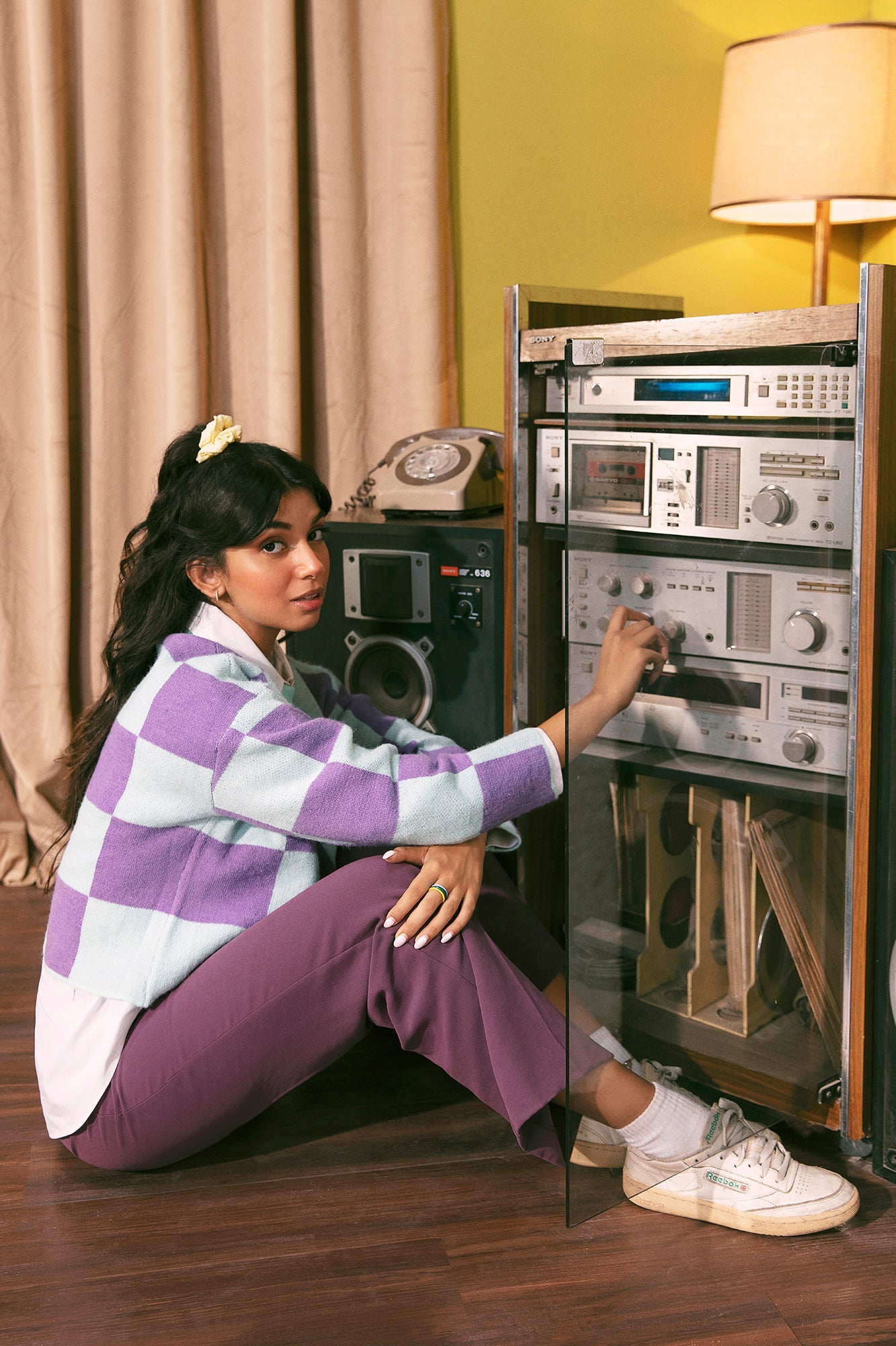 A captivating composition is layered over this classic lilac sweater gracefully crafted in a trendy cropped silhouette. Adorned with color block boxes at front in contrasted light blue hues and enhanced with heart silhouette knitted designs, this exquisite sweater is a perfect option to style like at fun occasions this winter season.