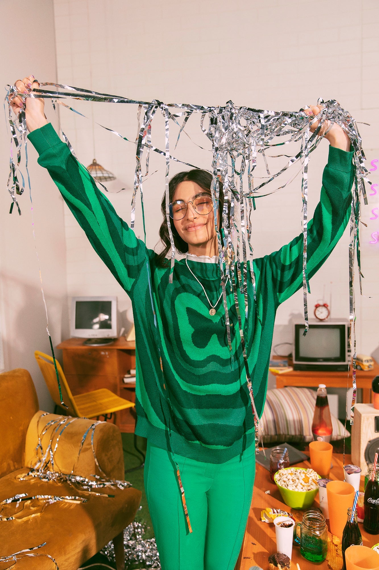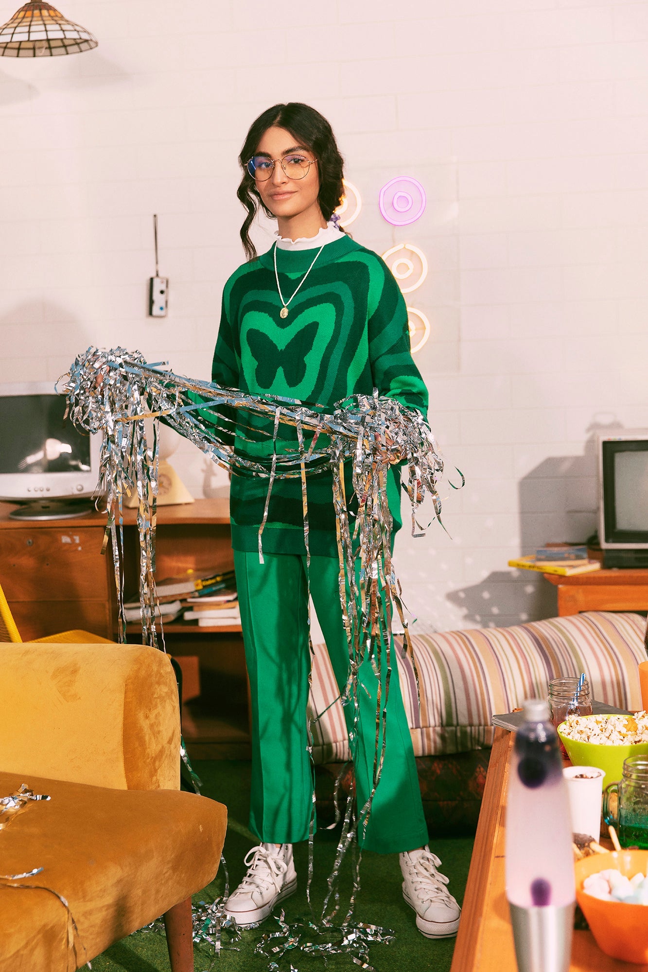 A dreamy composition is portrayed on this bright green sweater gracefully crafted in a chic silhouette with elasticated neck and sleeves opening. Designed with butterfly silhouette at center with striped patterns in light and dark tones of green, this divine sweater is a great option to stay warm and look elegant this winter season.