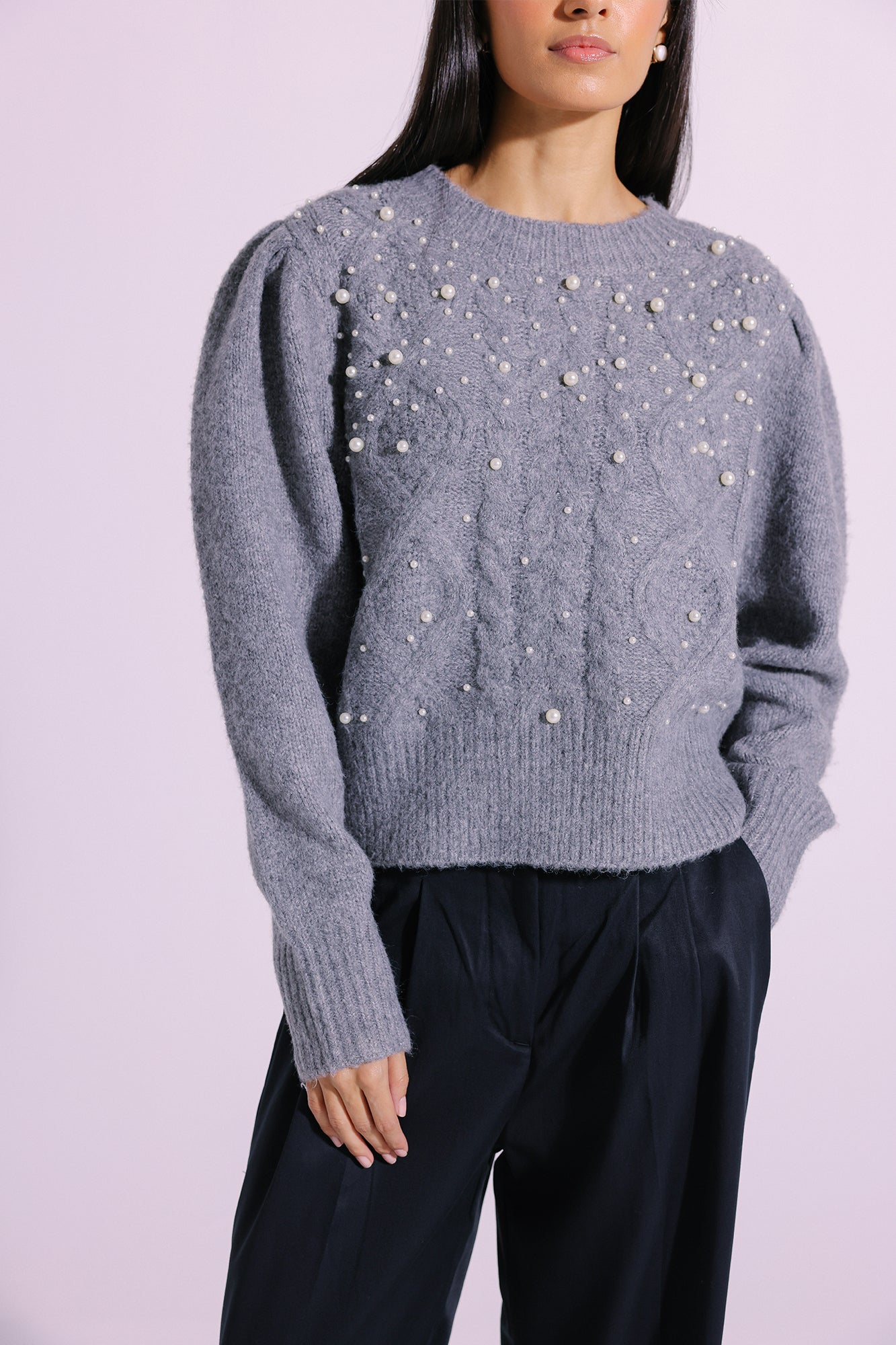 Look graceful in this mesmerizing sweater rendered in a pale grey shade. It illustrates a trendy silhouette with gathers at shoulders and adorned with braided design at front. Beautifully embellished with beads in pearl white shade, this statement sweater is a must-have to style this winter season.