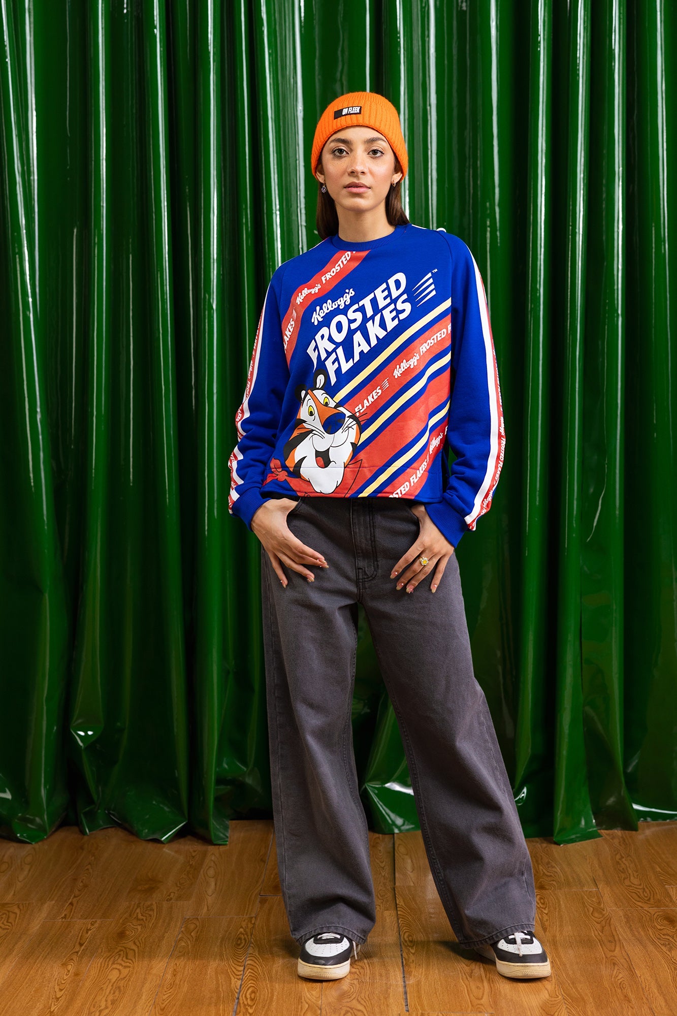 A fashion forward design is layered over this artistic sweatshirt rendered in an appealing cobalt blue shade. Crafted in a trendy silhouette with a slit at bottom sides and enriched with captivating illustrating in vibrant hues, this radiant sweatshirt is a style statement to embrace at fun gatherings with friends.