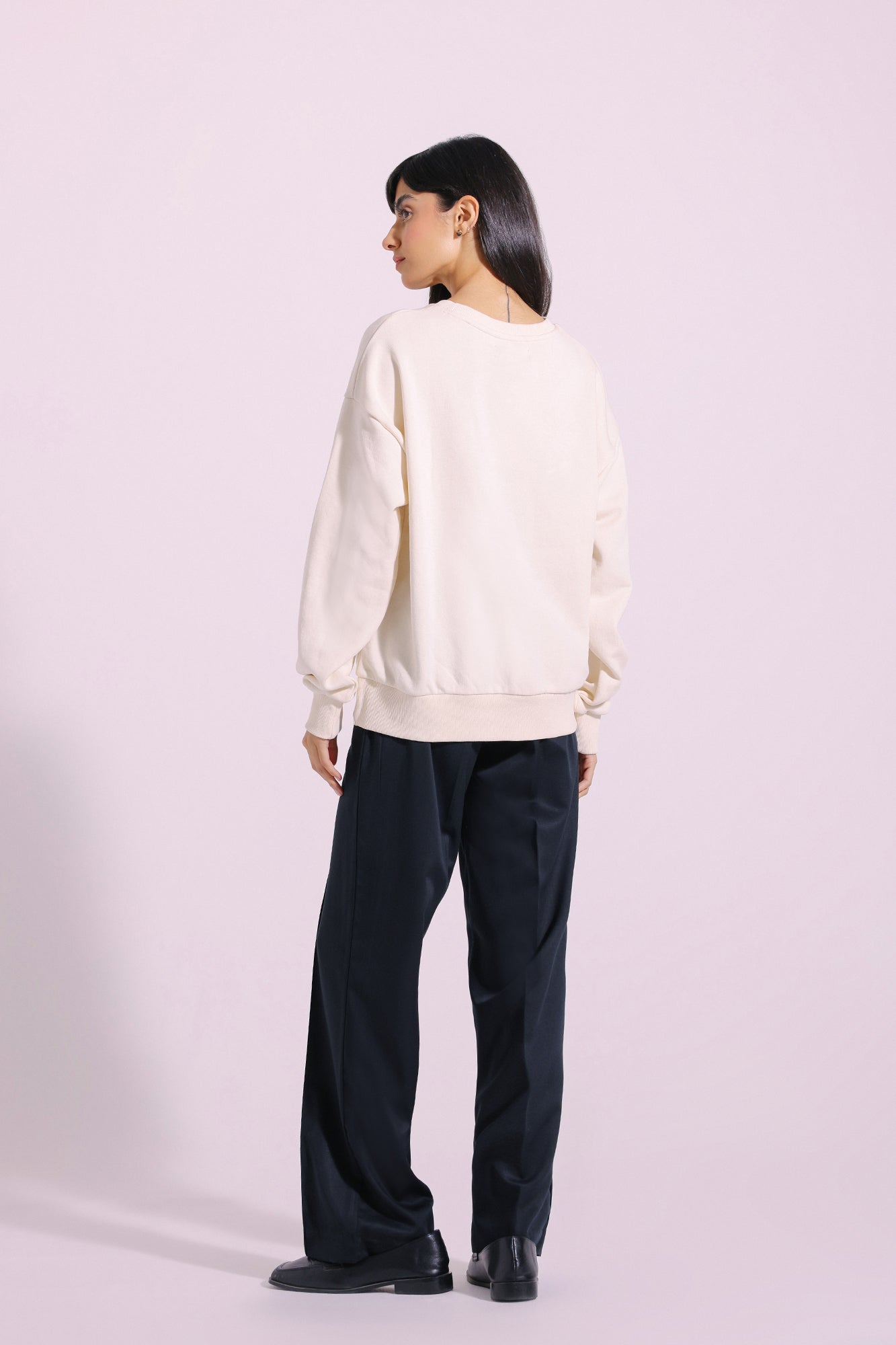 A mesmerizing dreamy off white sweatshirt crafted in a trendy silhouette with round neck is beautifully adorned with figurative illustrations embroidered at front in deep hues. Style this contemporary sweatshirt at casual events and make a statement this winter season.