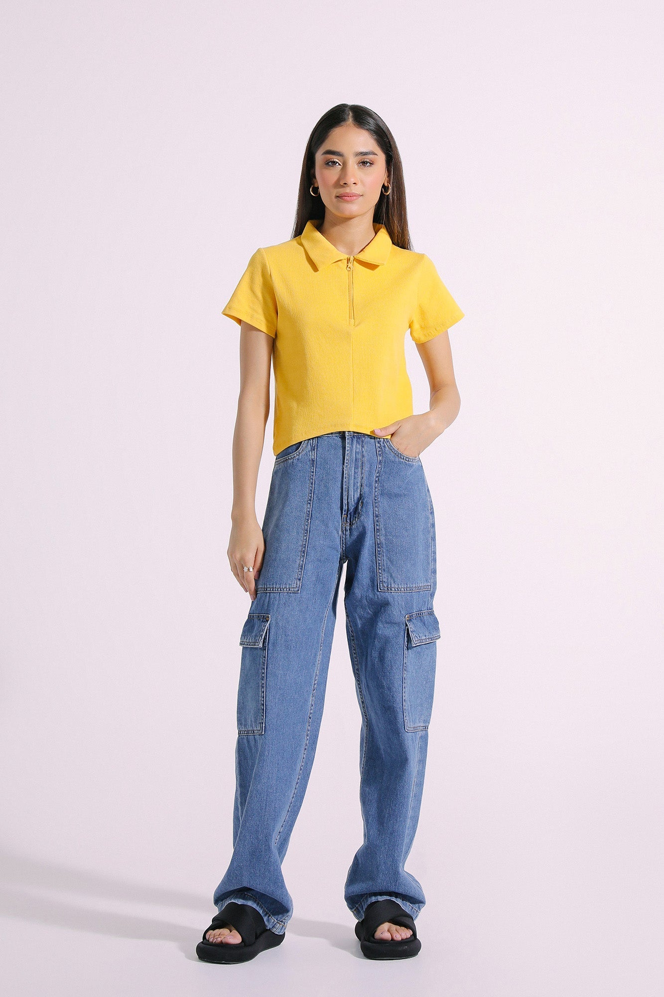 A classy yet elegant composition is portrayed on this solid top rendered in a gleaming lemon yellow shade. Crafted in a trendy silhouette with zip at front collar neck, this contemporary summer top is a perfect option for everyday events.