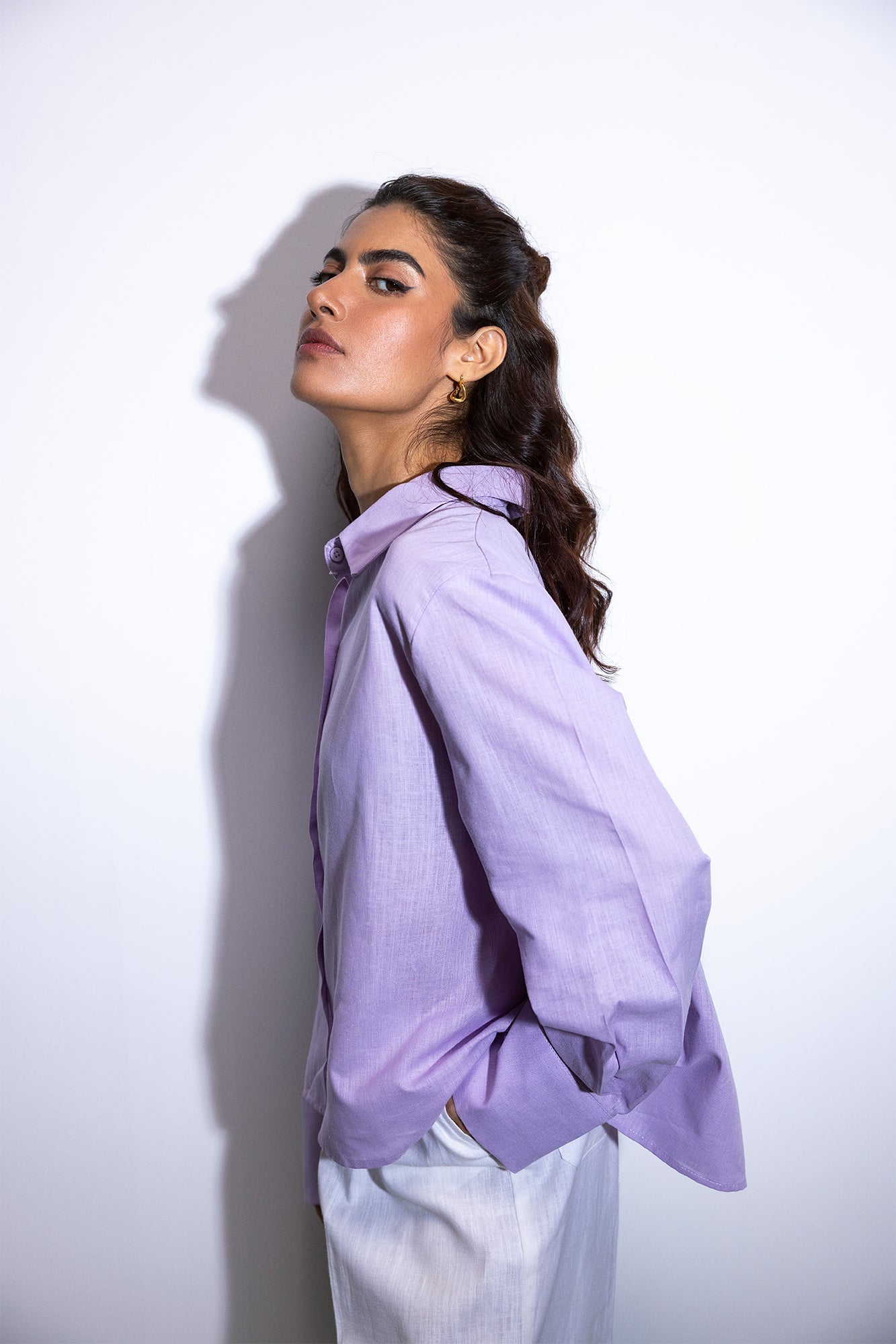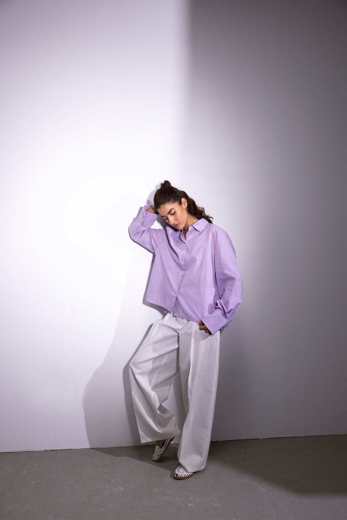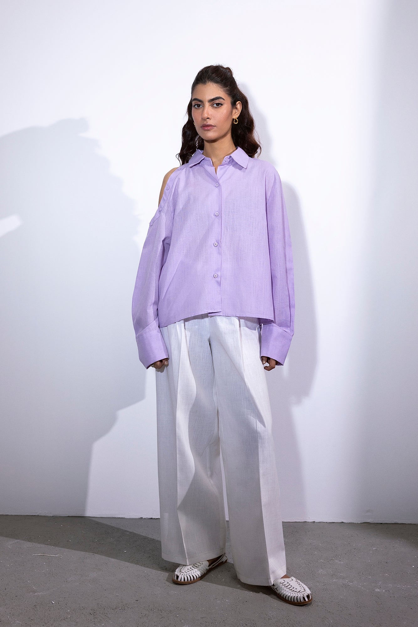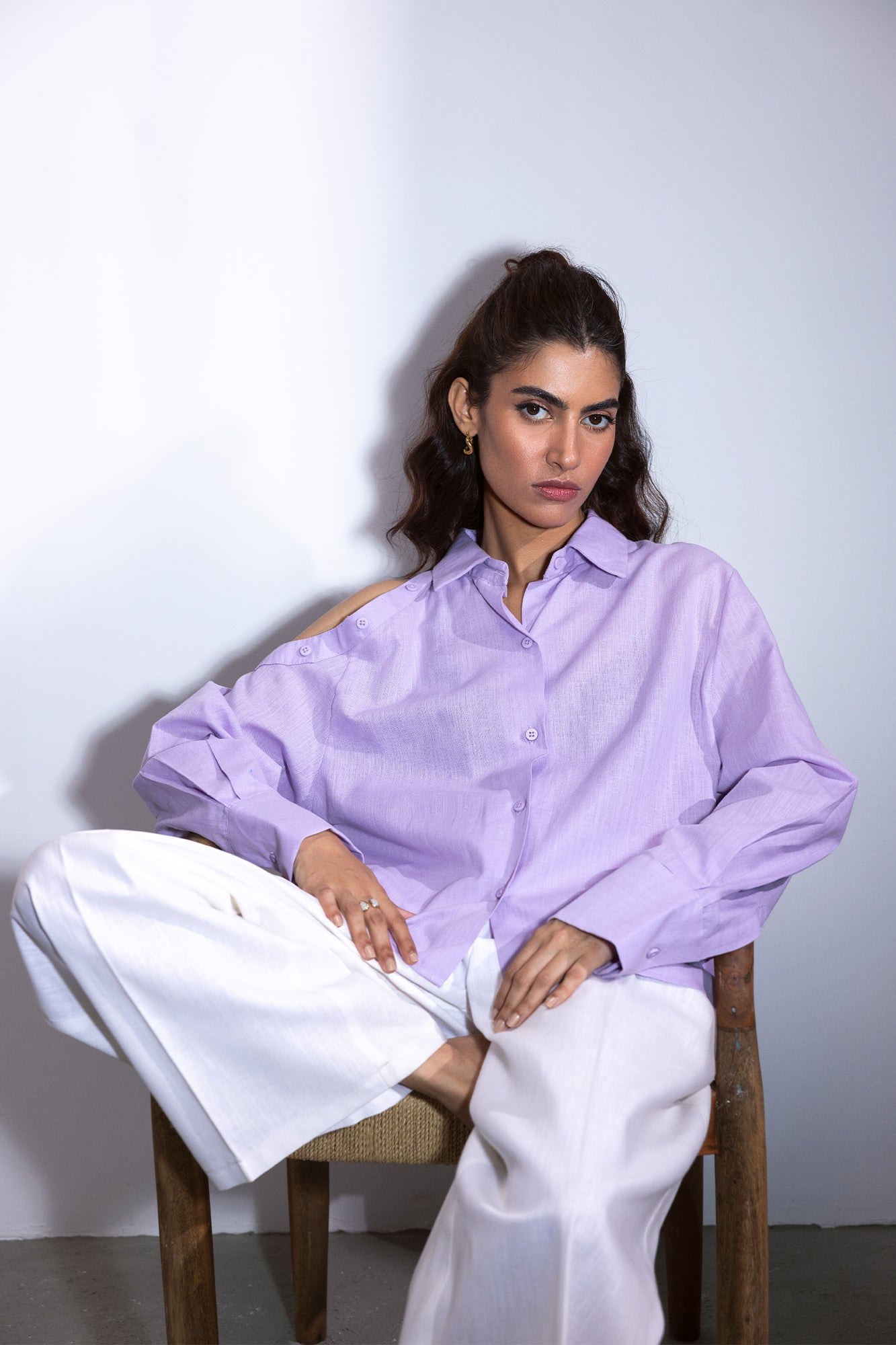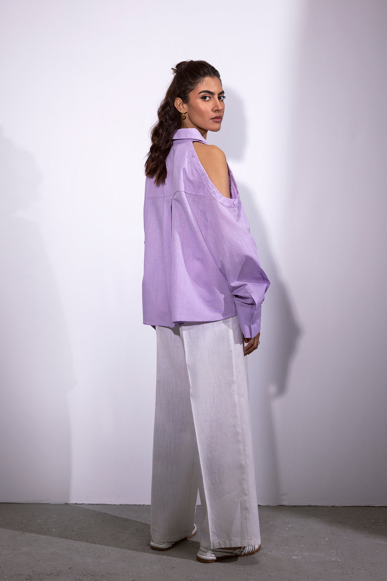 A classy yet elegant design is portrayed on this contemporary button down top rendered in a majestic pastel lilac shade. Crafted in a trendy silhouette with cold shoulders, this contemporary top is a great option for casual gatherings.