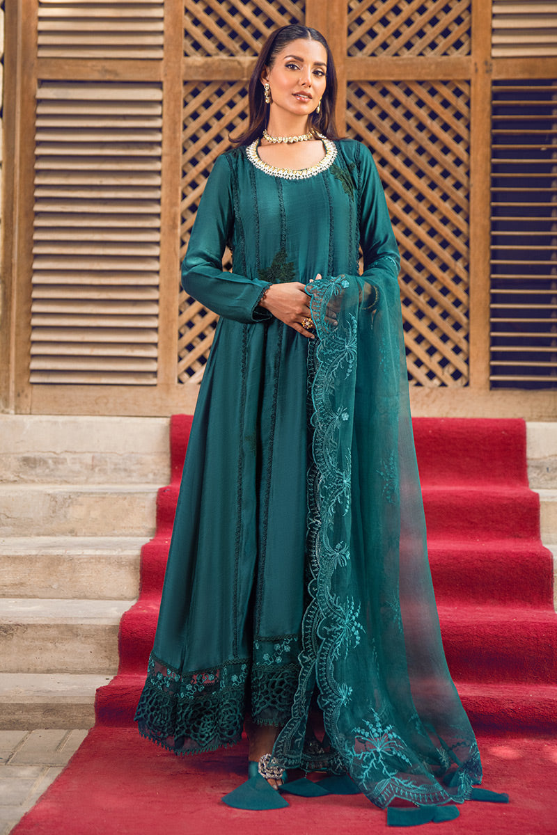 This kalidar ensemble is a masterpiece, with its luxurious pure silk kalidar silhouette radiating elegance. Its beauty lies in its simplicity, yet it's elevated by a handworked neckline featuring gold and silver embellishments. The front embroidery , delicate lace and organza trim on the daaman is meticulously crafted.