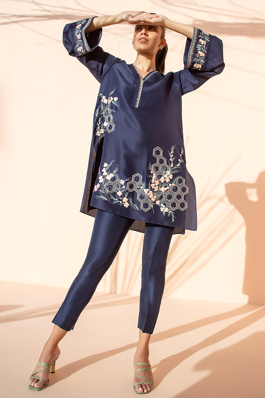 Turn heads in this striking co-ord set. The deep navy blue raw silk kurta exudes elegance and subtle sophistication. The color pops of embroidered floral and geometric patterns give depth to the ensemble.