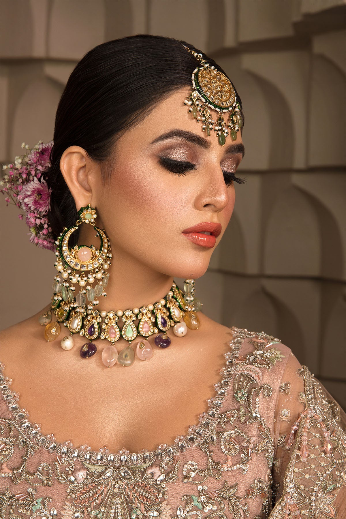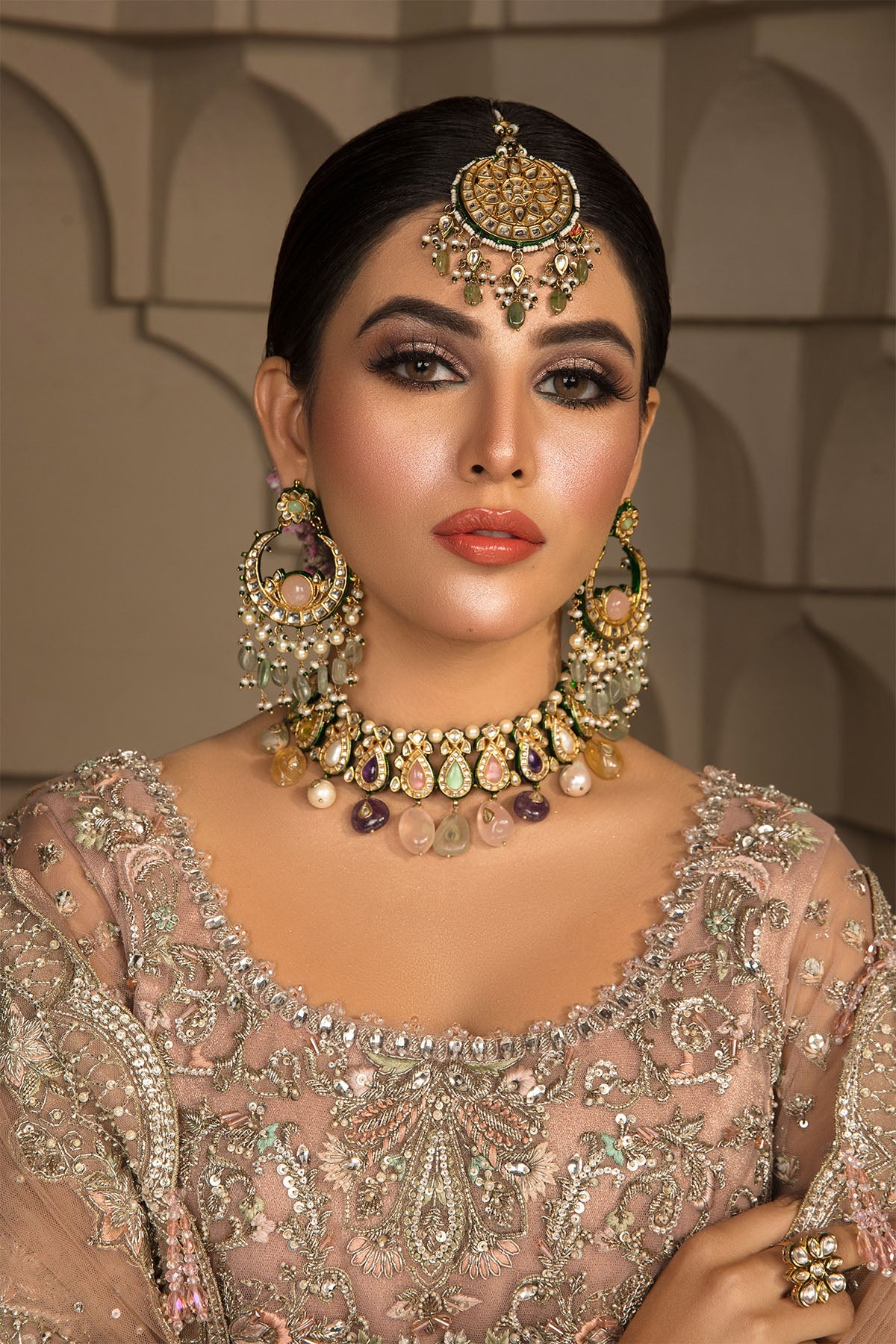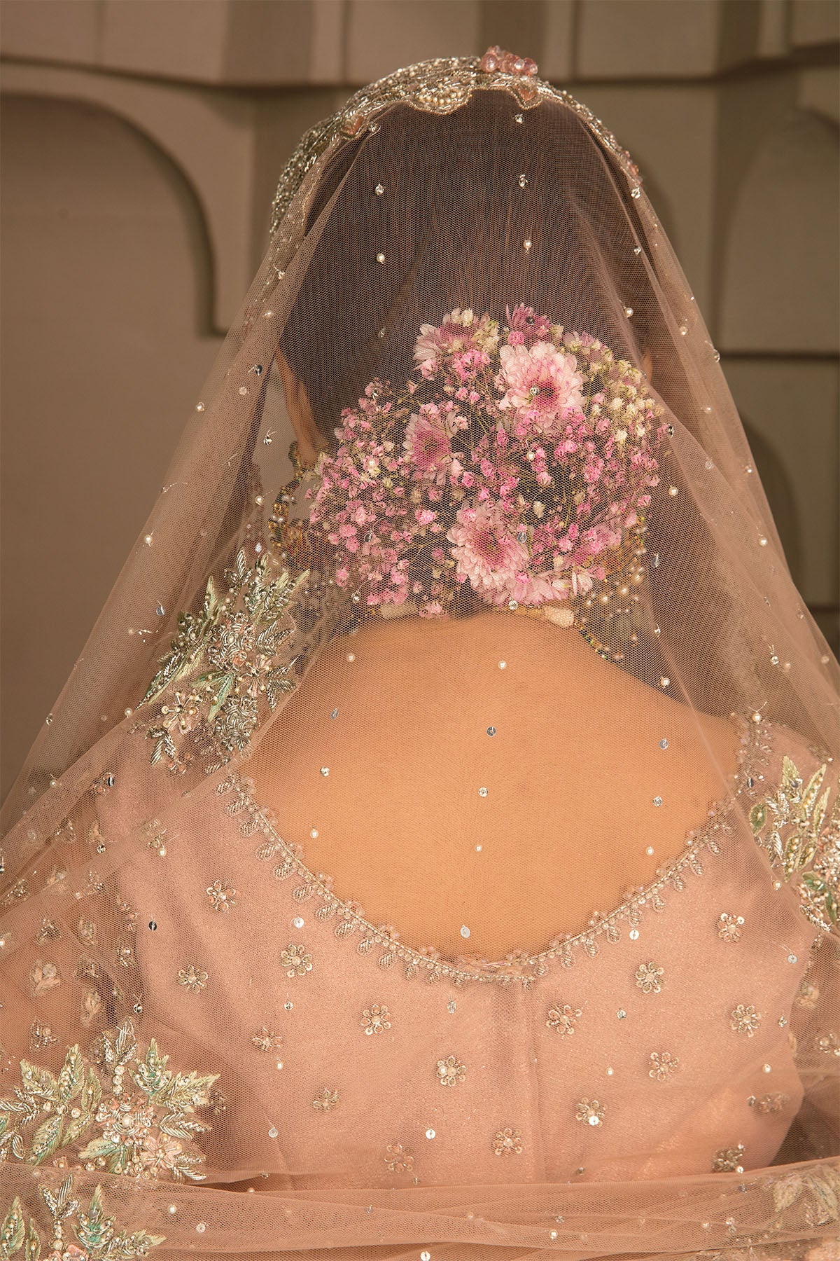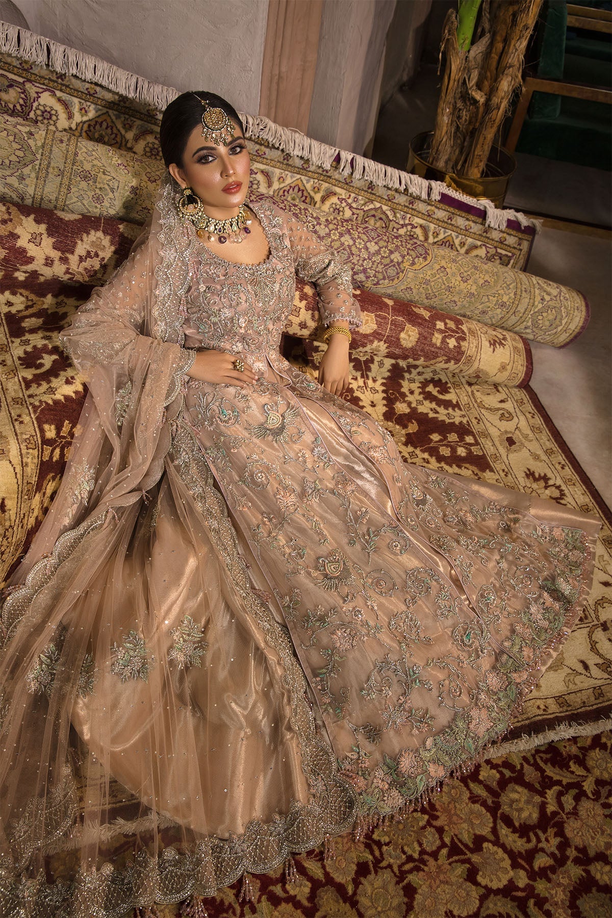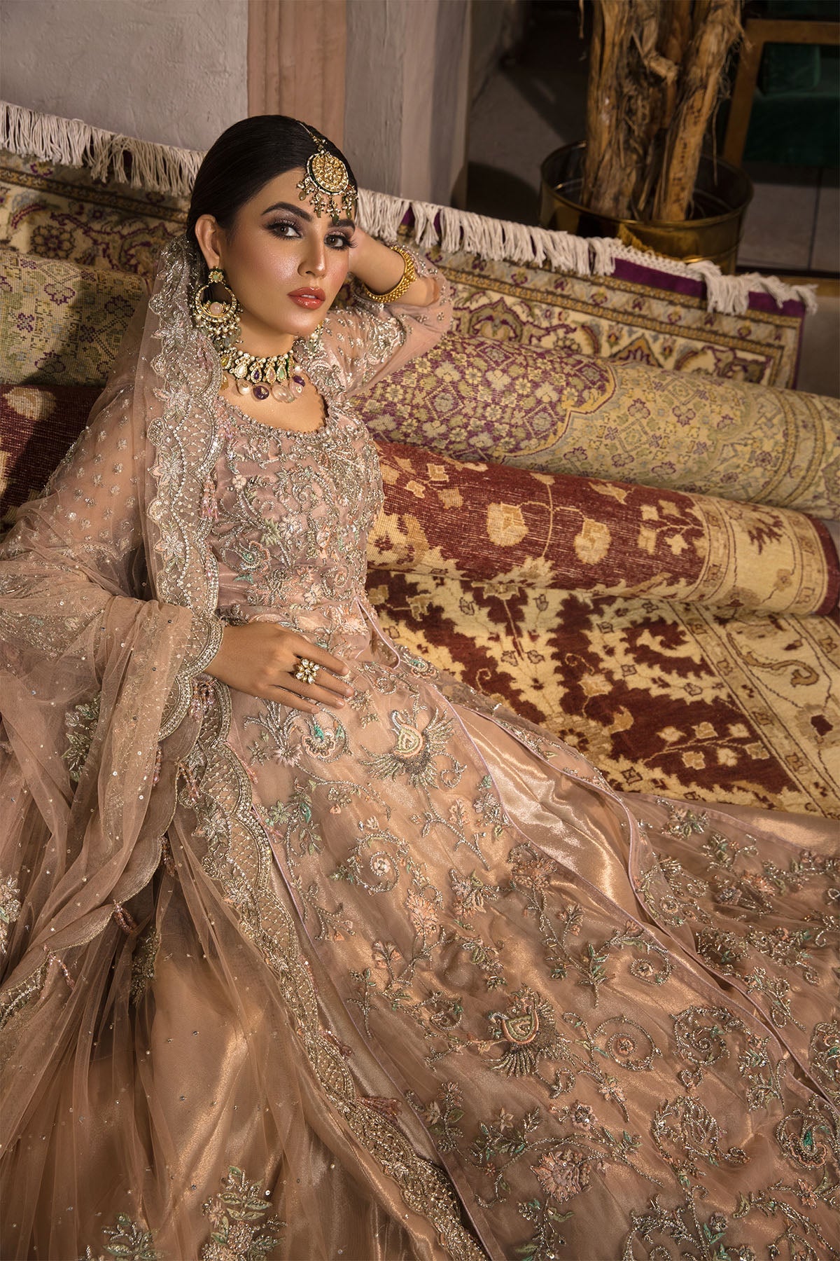 This blush pink drapey net gown is not only defined with a beautiful cut line. It is equally intricate and detailed with beautiful colourful floral patterns which are embellished with crystals, stones and kora dabka. It’s paired with heavy scallop dubbatta that gives it a complete look.