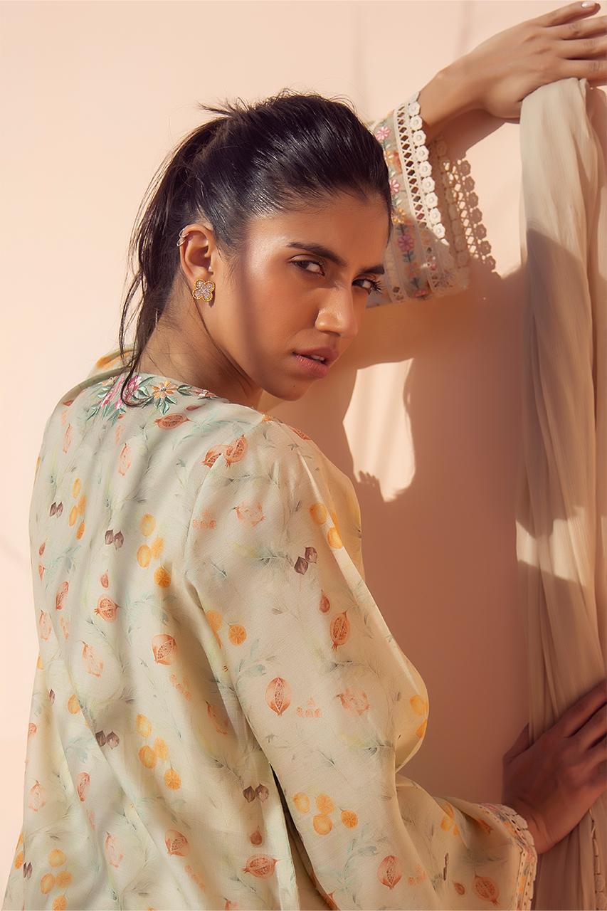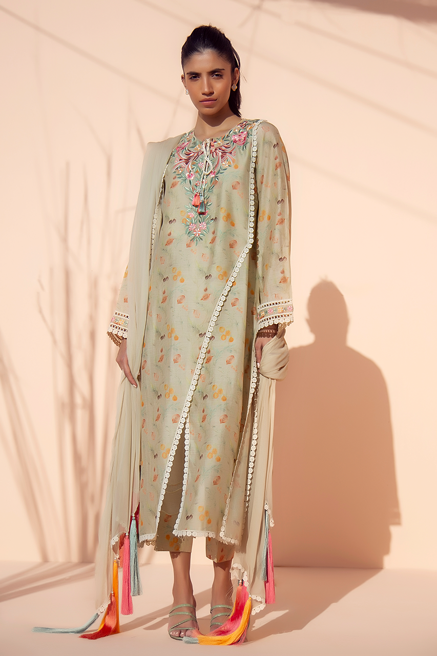 This celadon-colored khaddi silk kurta is printed with embroidered birds and foliage on the neckline that transform this piece into a muted wardrobe work of art. The co-ord printed trousers and colorful tassels hanging from the chiffon dupatta add a playful feel to the piece.