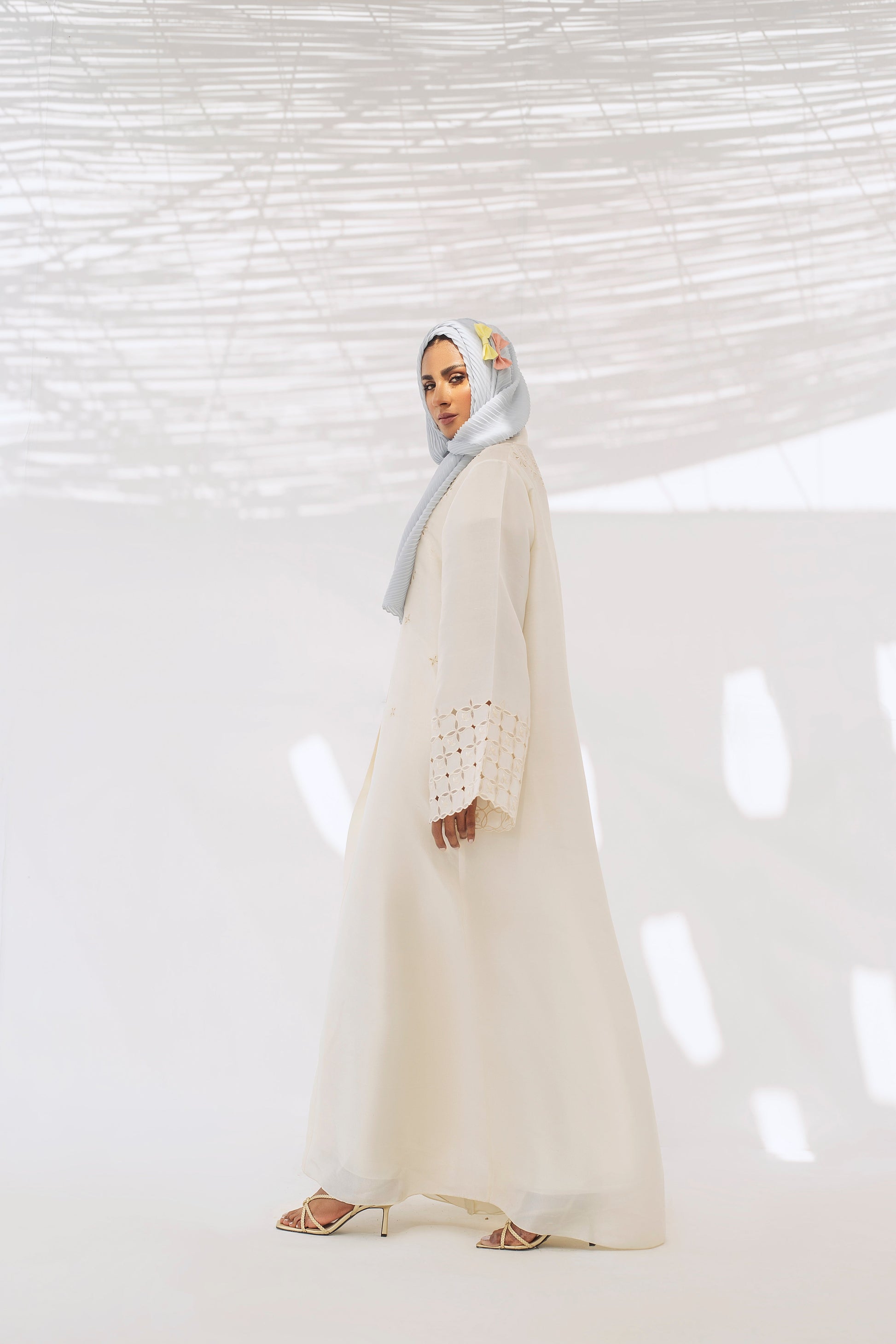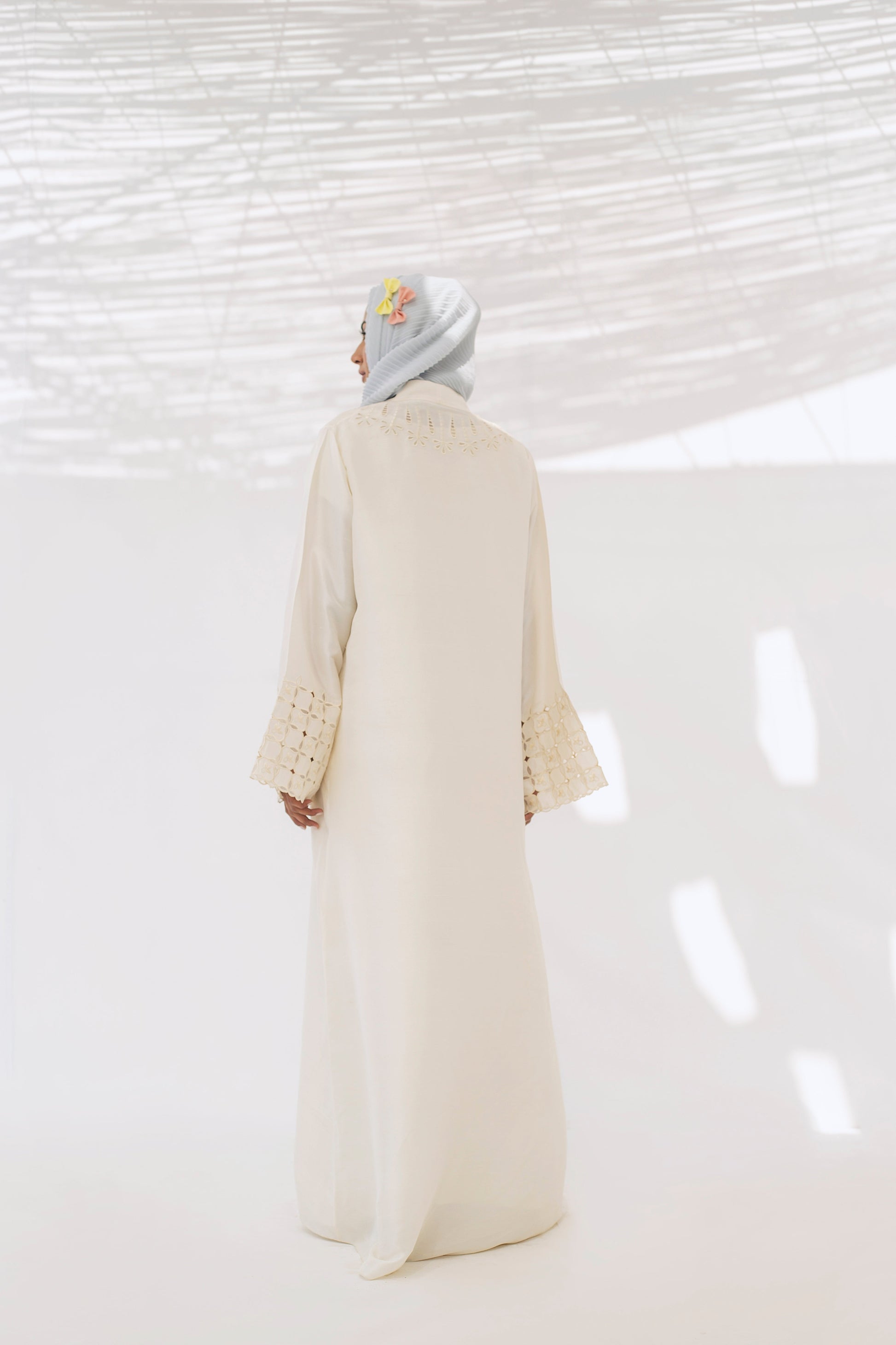 Bring a touch of elegance to your wardrobe with this cream raw silk abaya featuring a wide sleeve border with eyelet detailing. Transition it from day to evening with a pale blue pleated scarf.