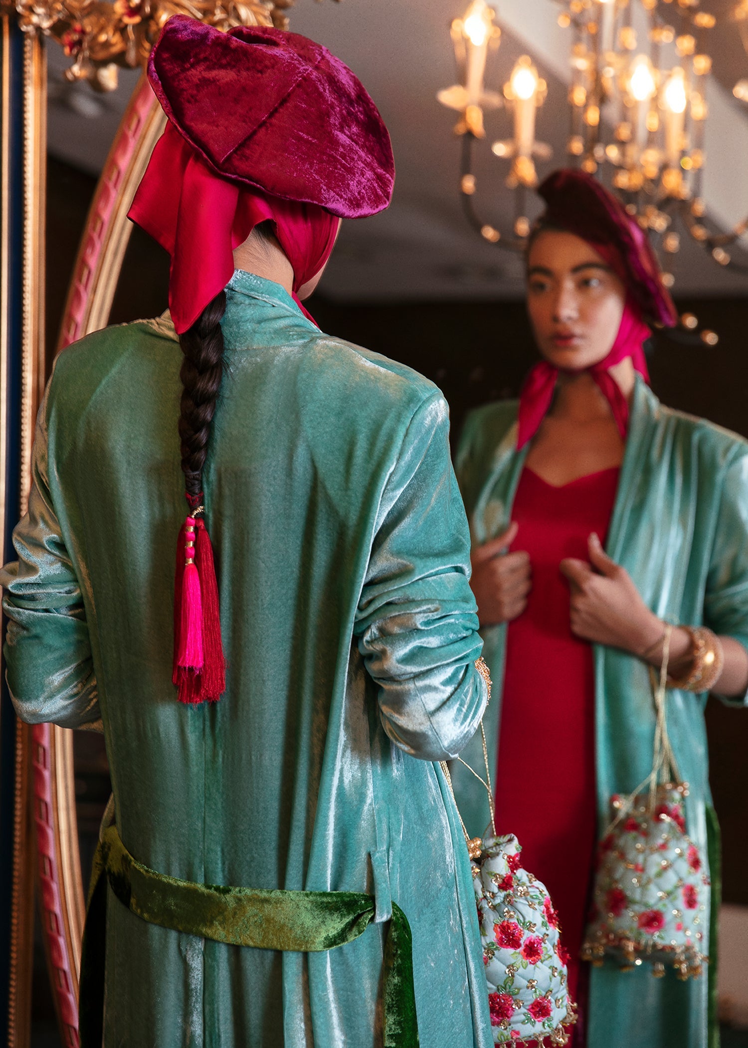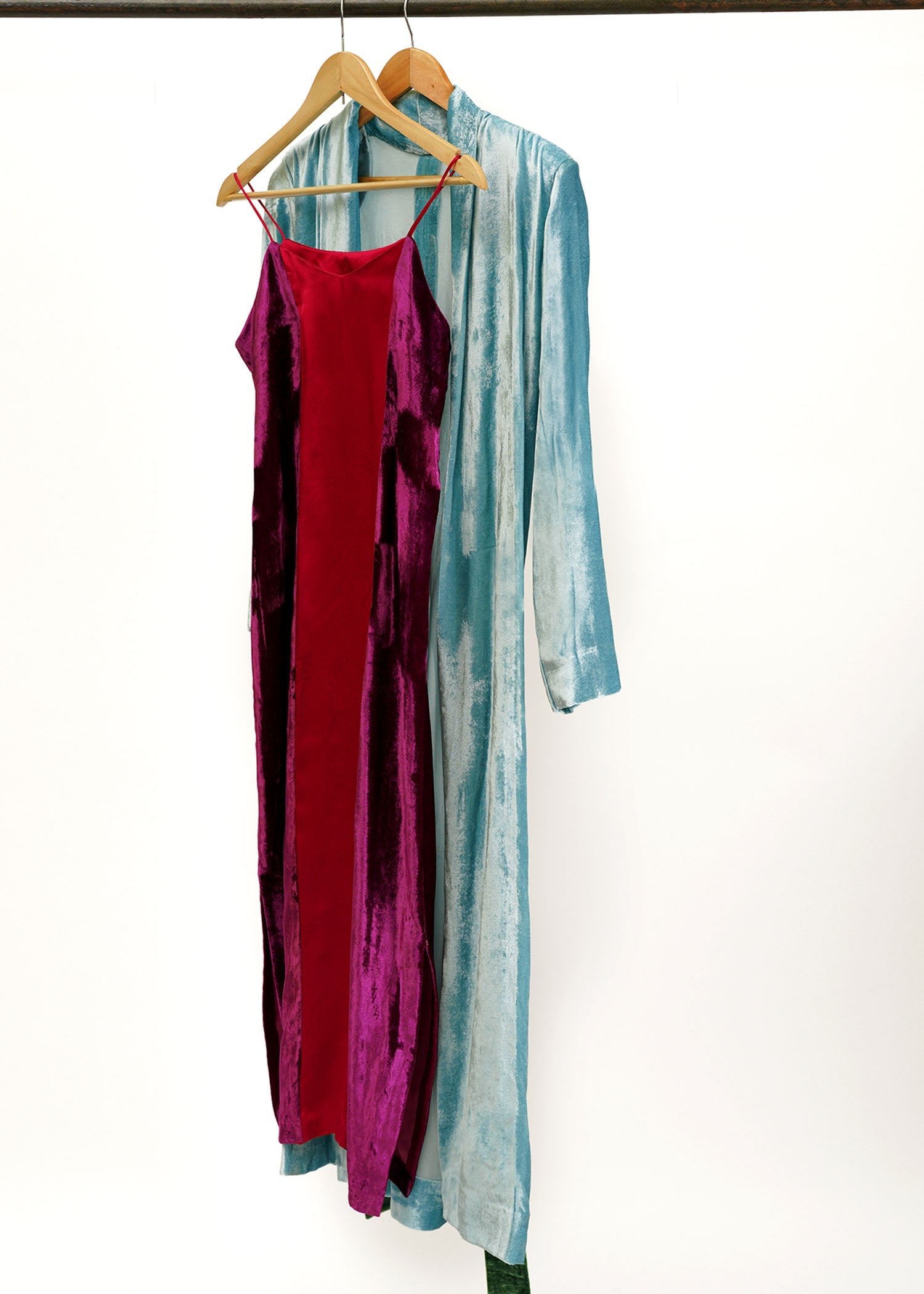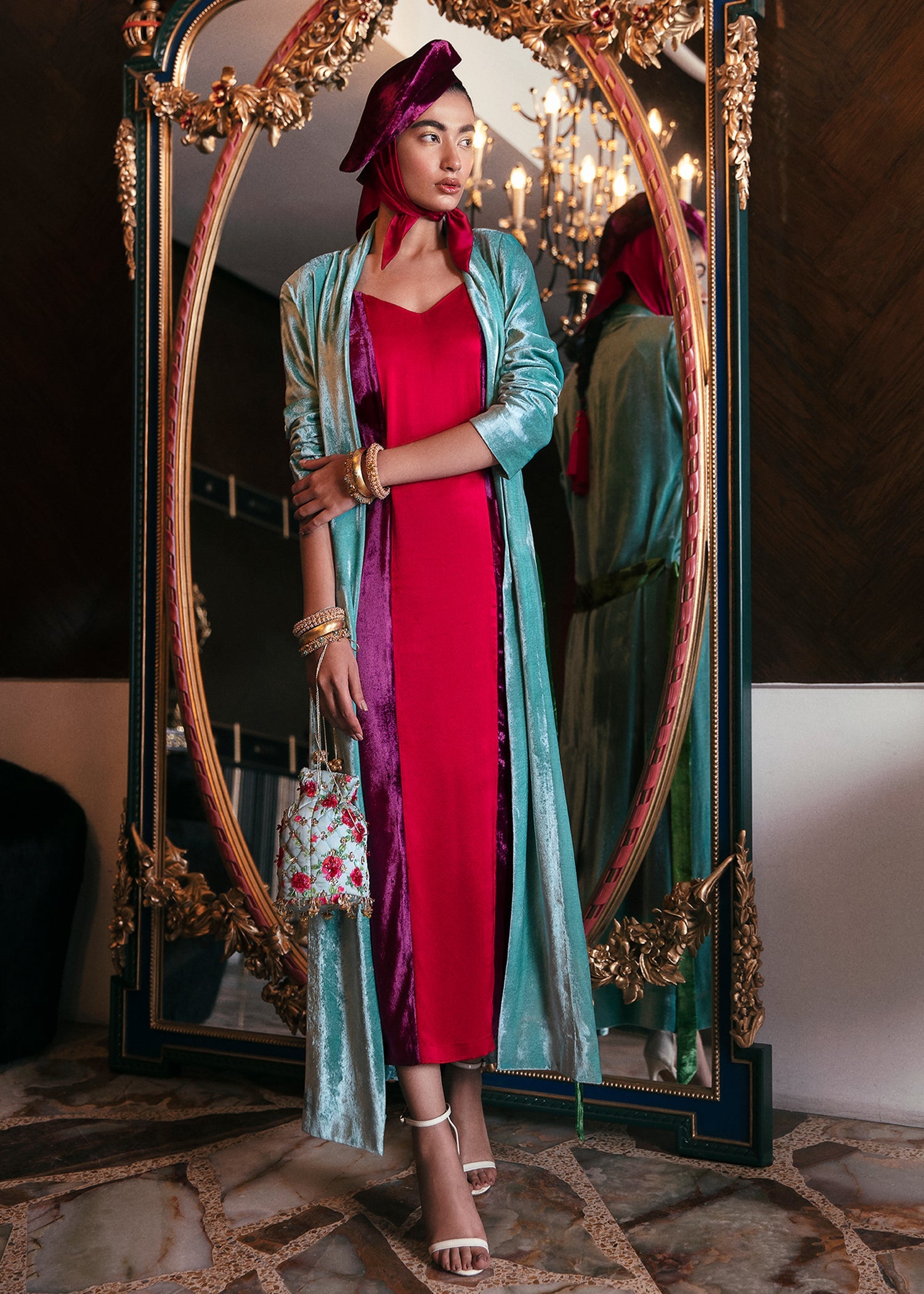 Color block slip dress in plum velvet and satin fuchsia panels paired with ice blue velvet shrug with shoulder paddings sets a statement vibe.