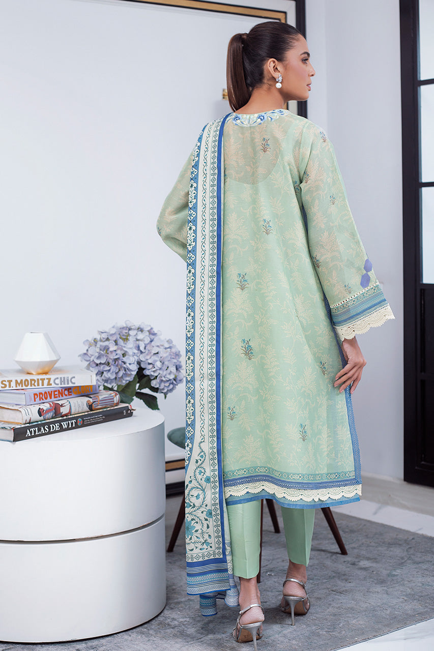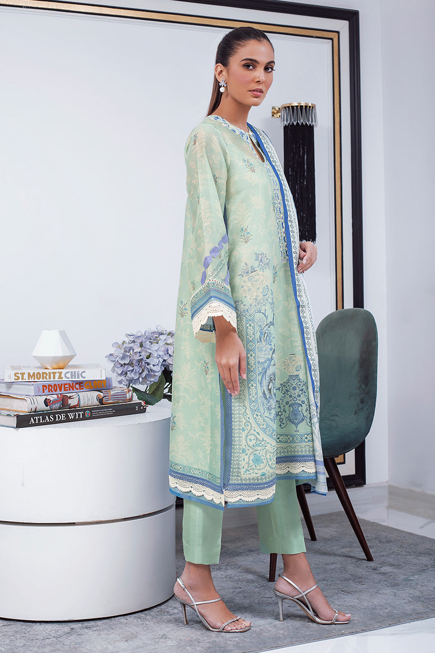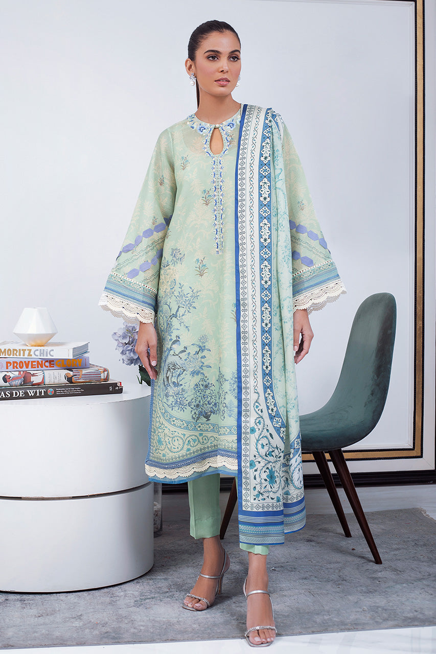 A sky blue cotton net digitally printed kurta with chinoiserie imagery features a keyhole neckline and lace detailing. It comes with a matching digitally printed silk dupatta and is paired with raw silk trousers.