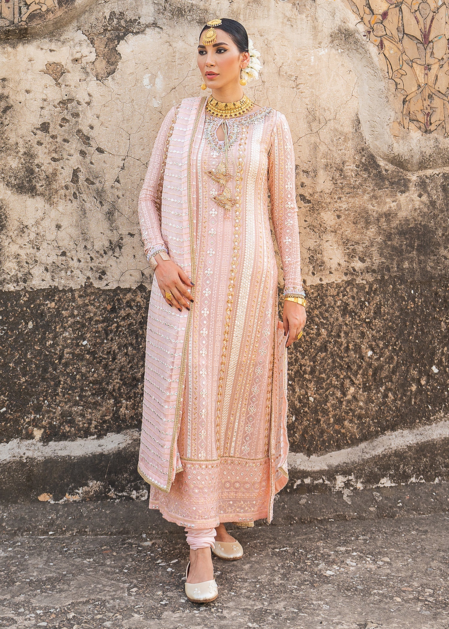 Sublime hues of pink are used to craft this work of art. Payal is set to steal your heart with its gorgeous chicken kaari shirt which showcases radiant hand embellished tassels on a finely embellished neckline and sleeves. PK raw silk chooridar and a chiffon chicken kaari dupatta elevate the allure of this ethereal number.