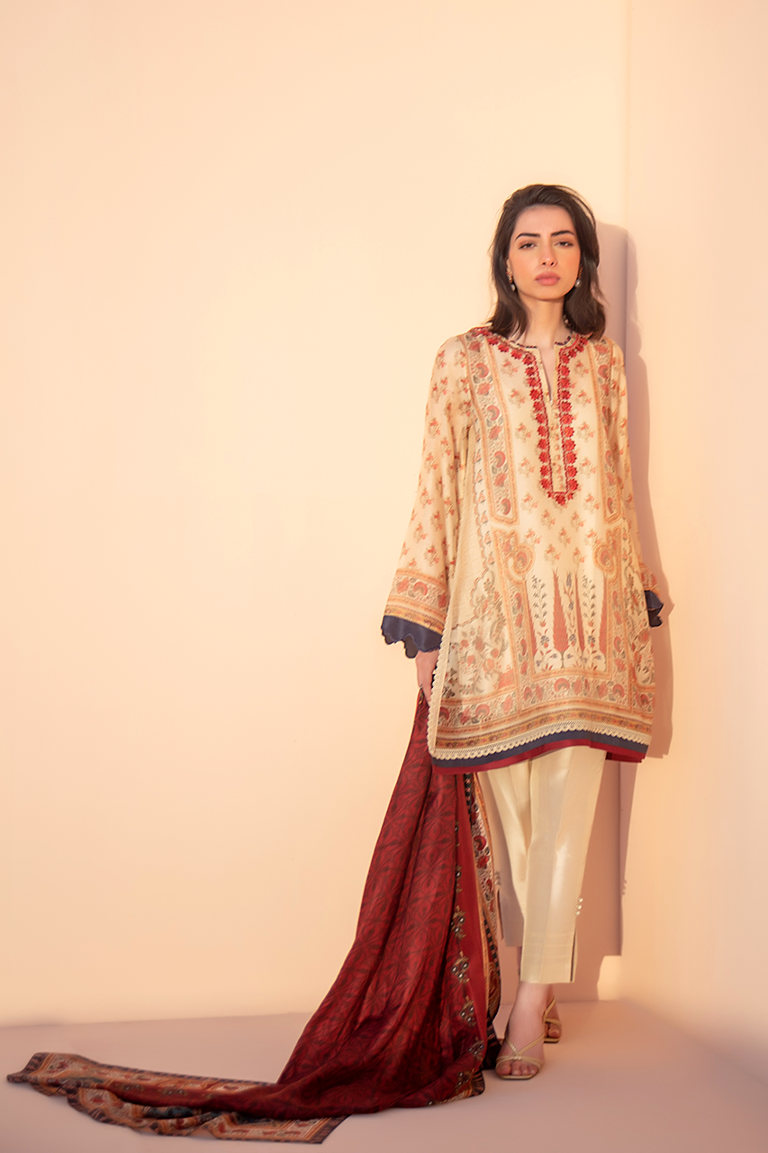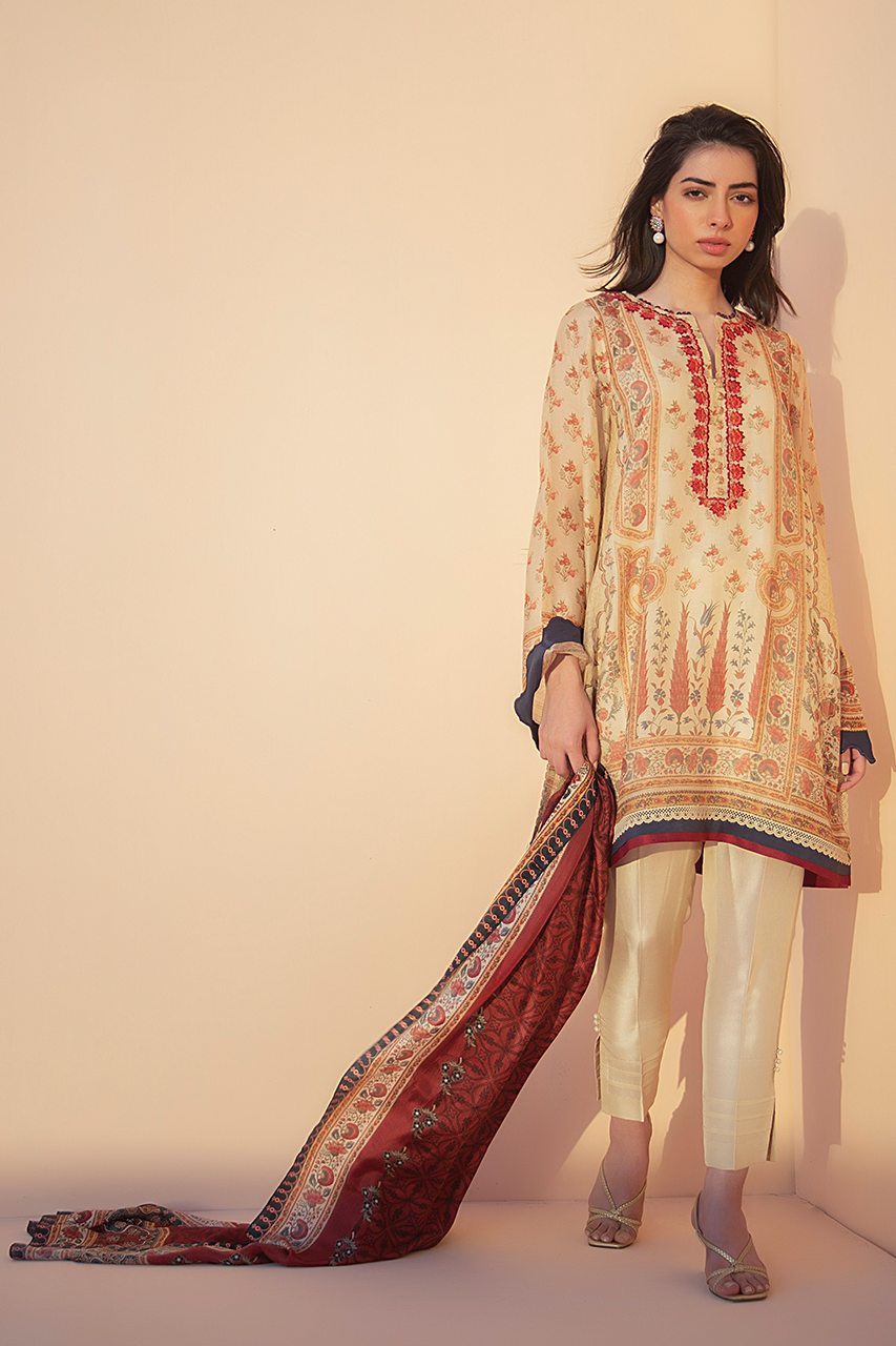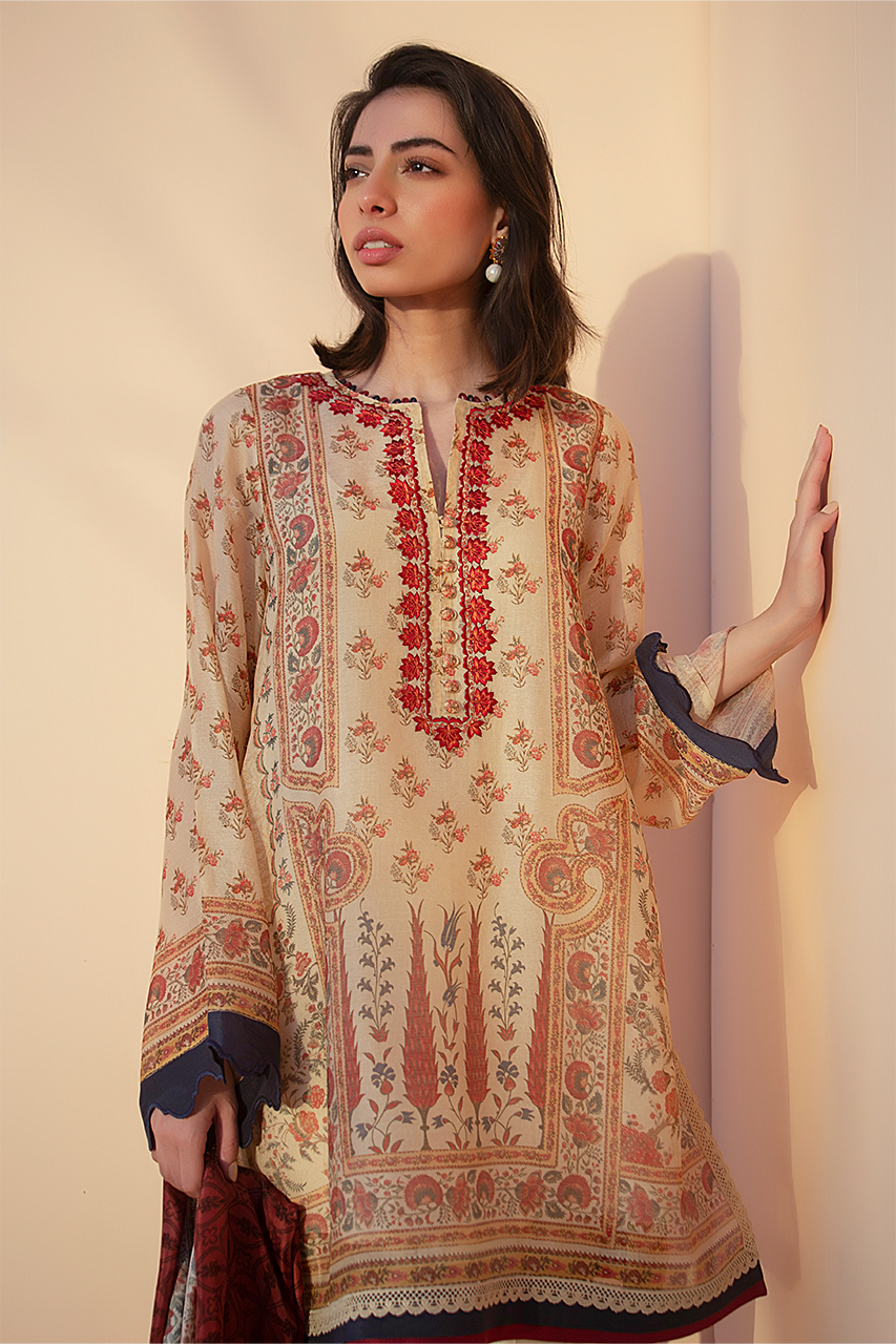 A camel printed cotton net kurta with floral and mughal imagery is paired with a contrasting deep vermillion printed silk dupatta. Paired with raw silk trousers.