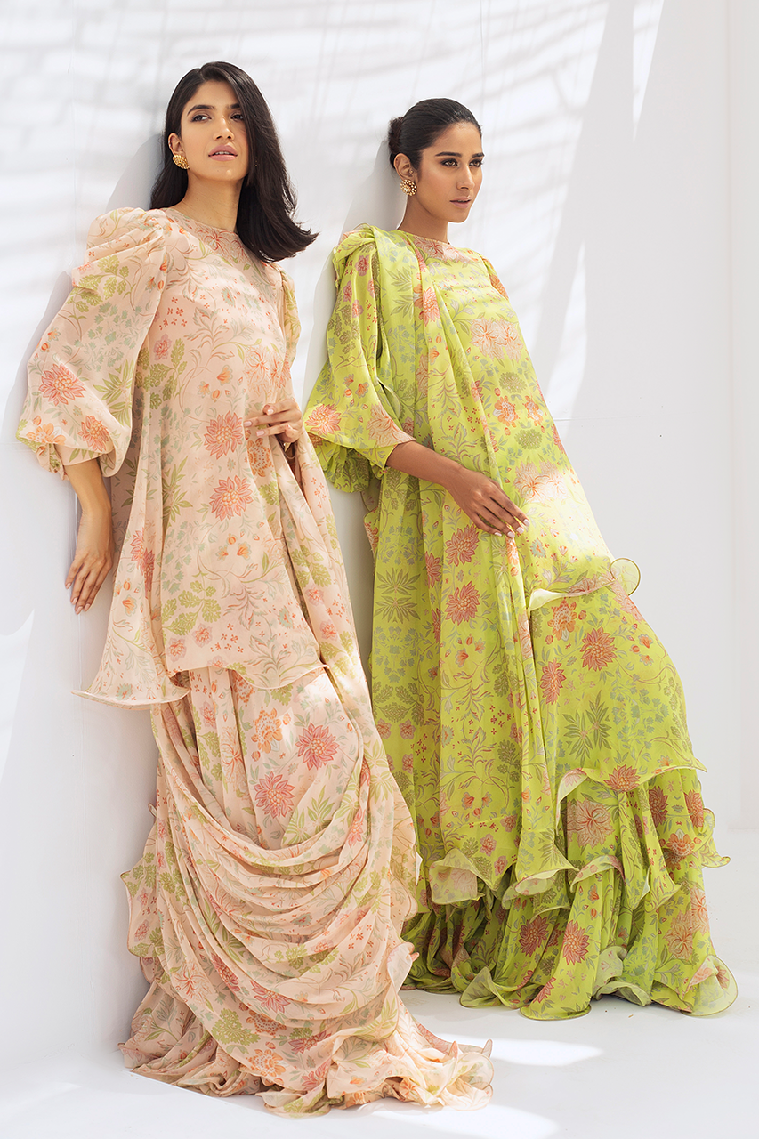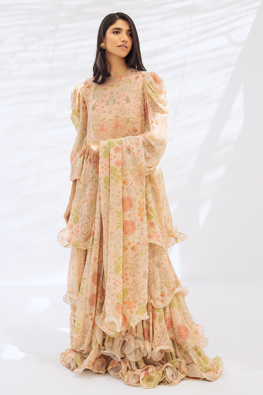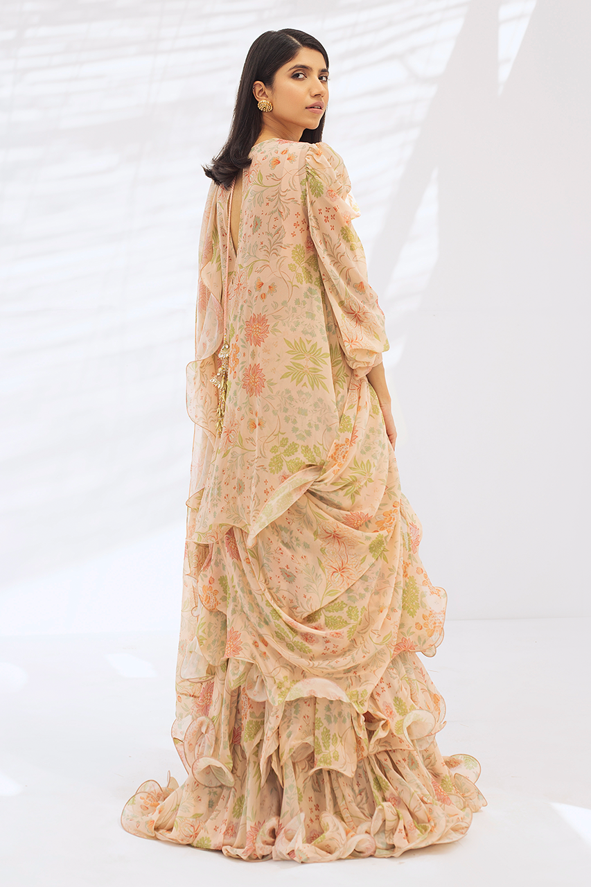 This peach floral printed georgette ruffled top and ruffled lehnga oozes drama and sophistication. It is paired with a matching draped dupatta.