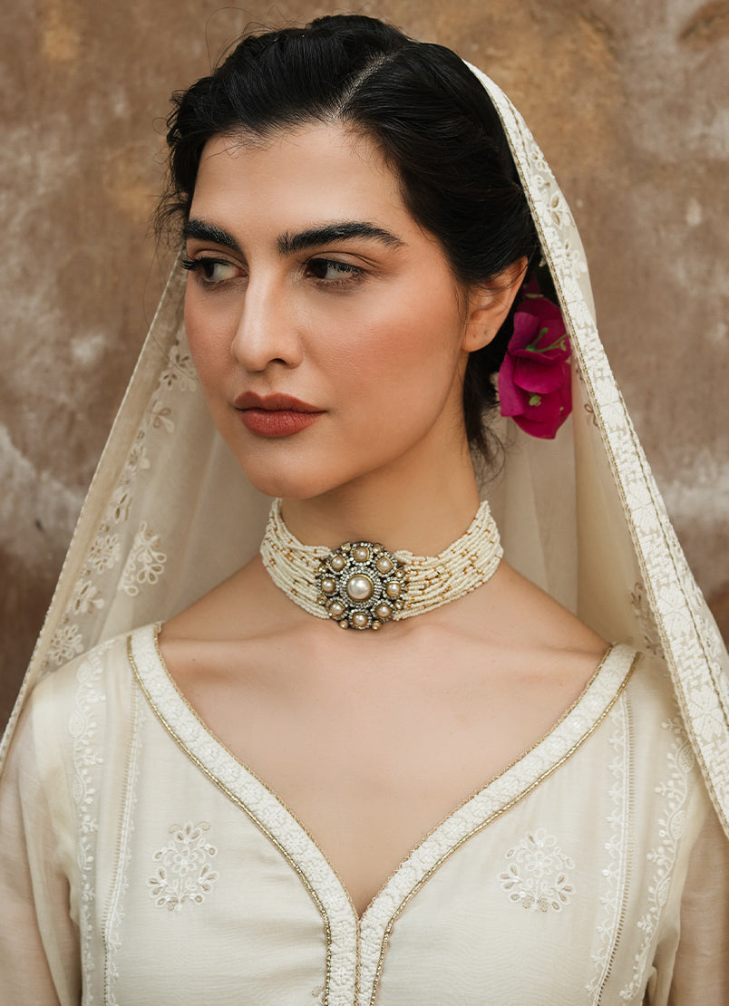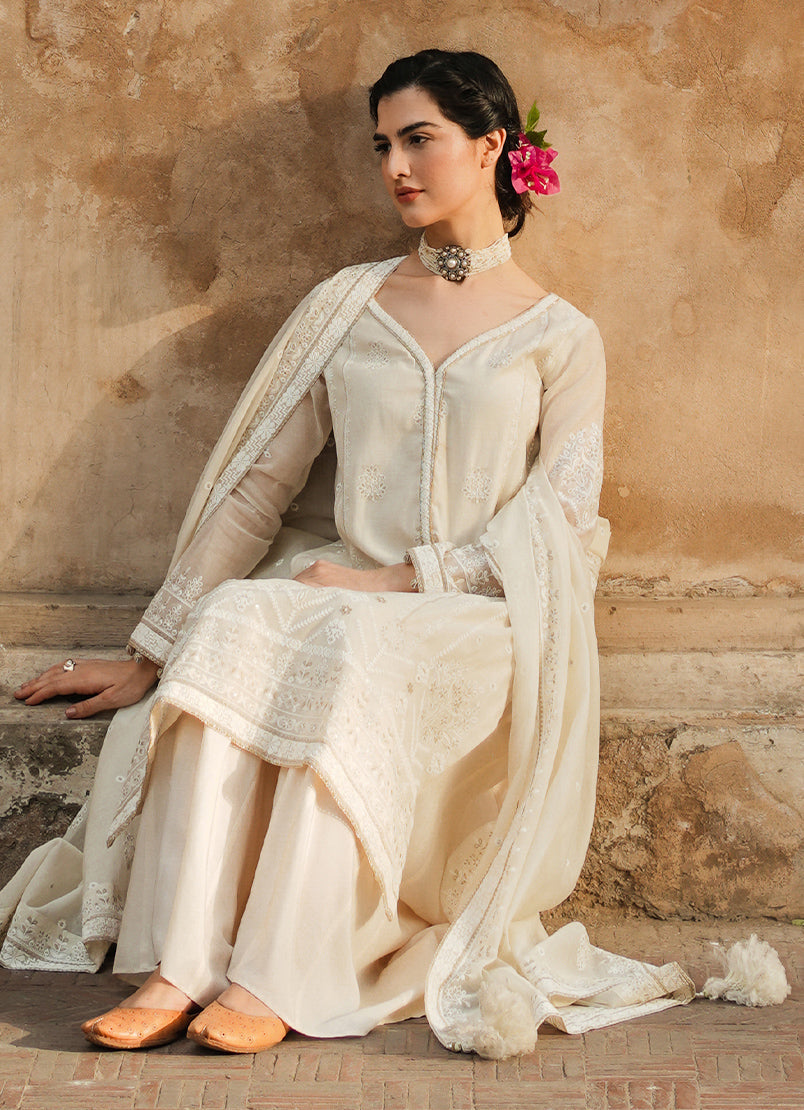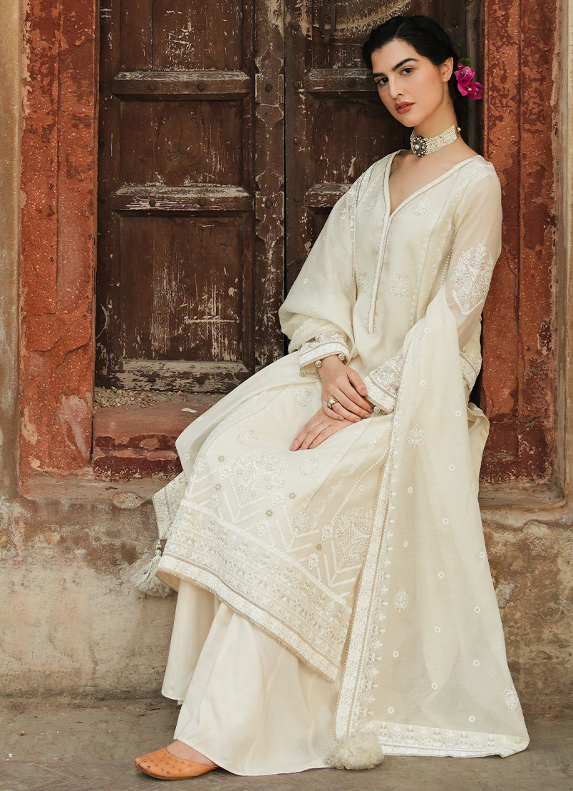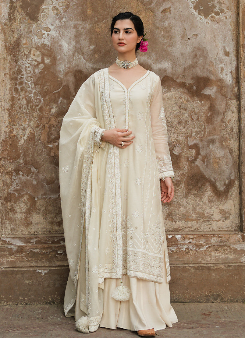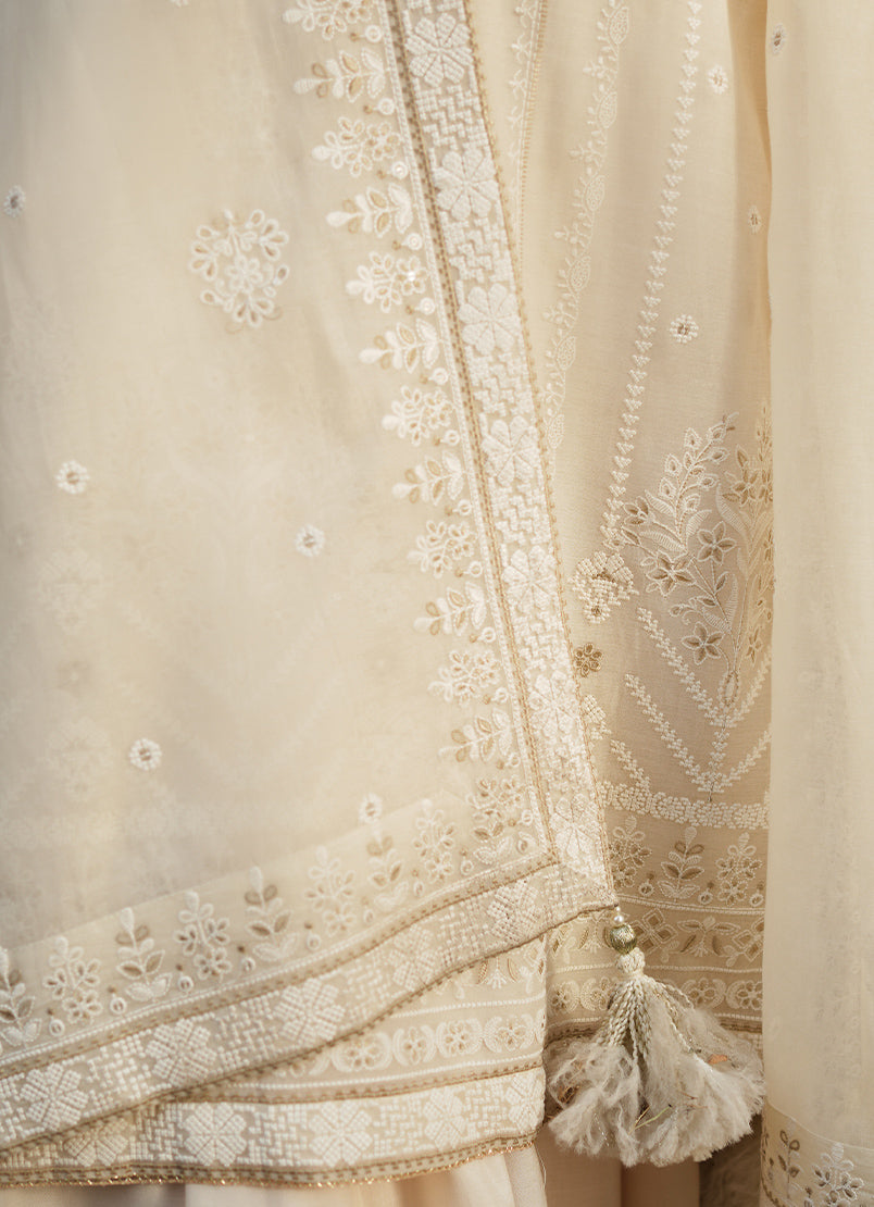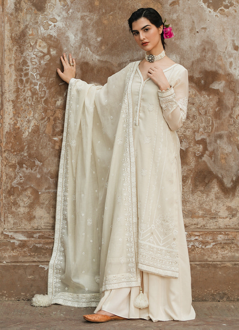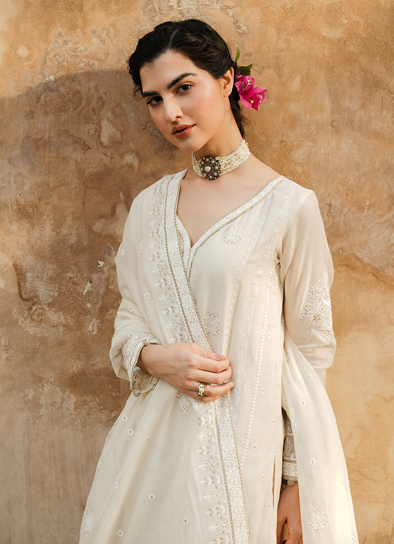Leyah, a 3-piece unstitched outfit, is a resplendent creation in Kora. The front and back panels bloom with embroidery, while the sleeves are accentuated by heavily adorned cuffs. Complemented by cotton silk trousers, and a pure Kora cotton dupatta featuring opulent borders, this unstitched suit is a splendid choice for any festive occasion.