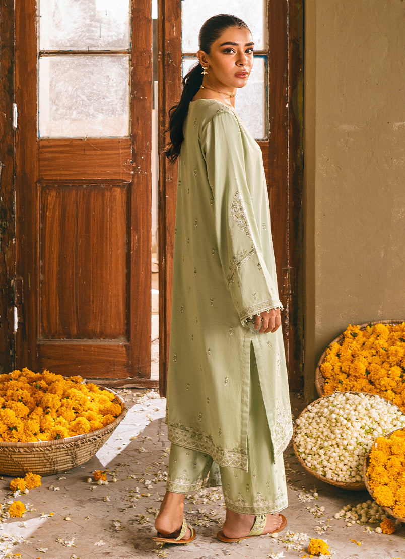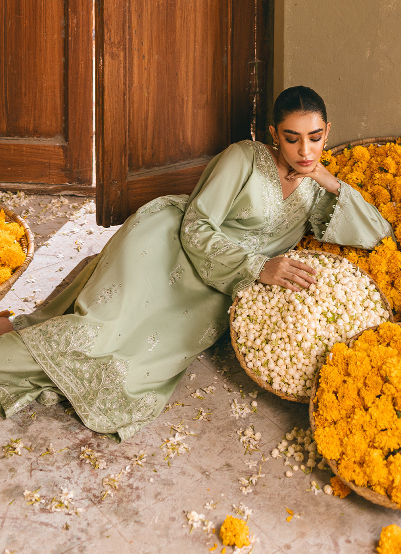 This timeless light olive co-ord set is rendered on premium cotton-satin fabric, which serves as the perfect canvas for this ensemble’s exquisite embroidery. It is further enriched with motifs that beautifully emphasize the neckline, daaman, and sleeves. The trousers feature intricate embroidery on the cuffs, adding to the grandeur of the entire outfit.