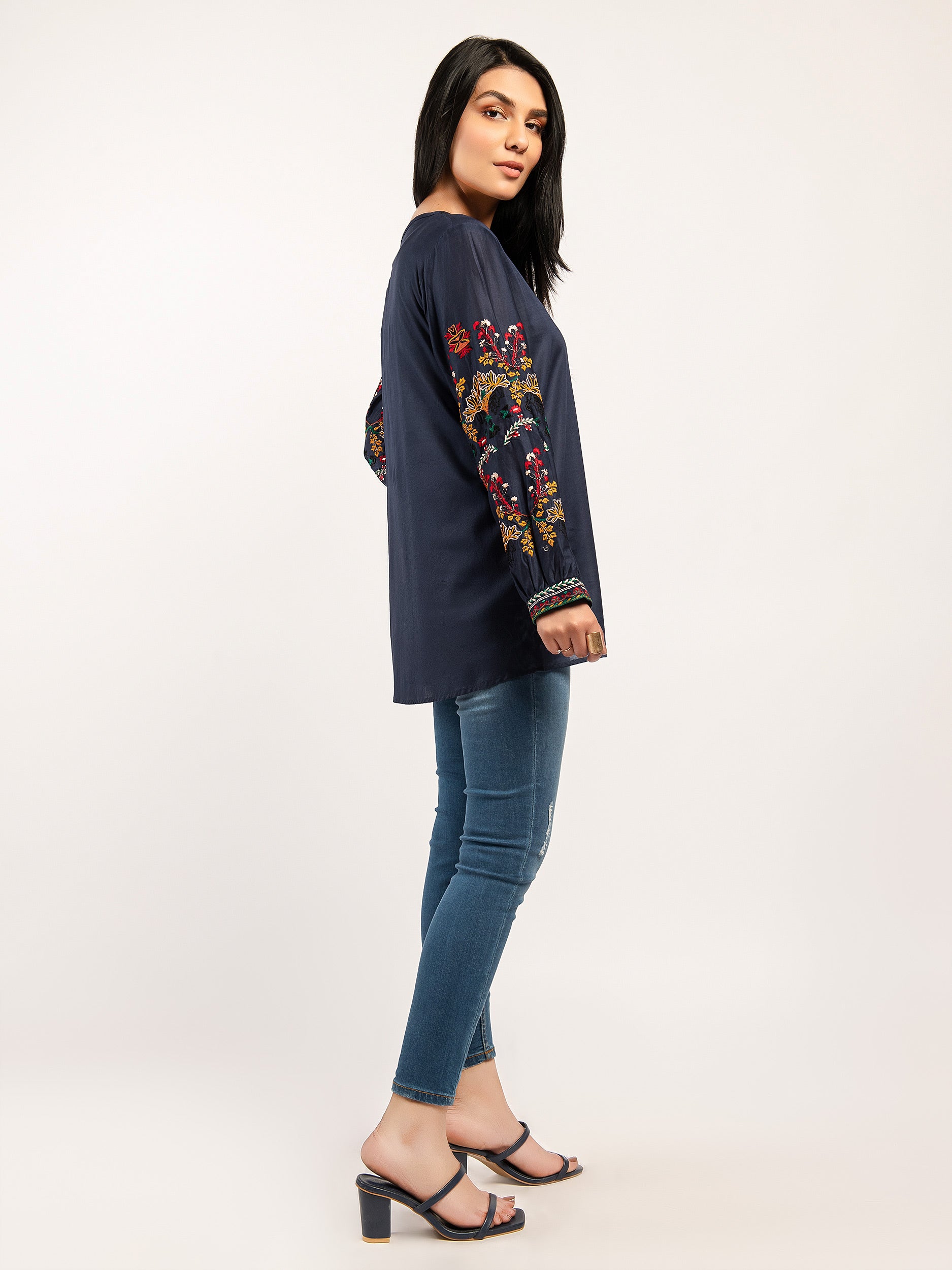 - Mutli-colored embroidery on pleated full sleeves and cuffs