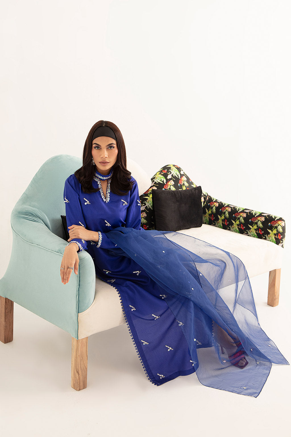 This moon blue outfit adorned with silver sequins beads is a feast for the eyesIt is paired with straight pants