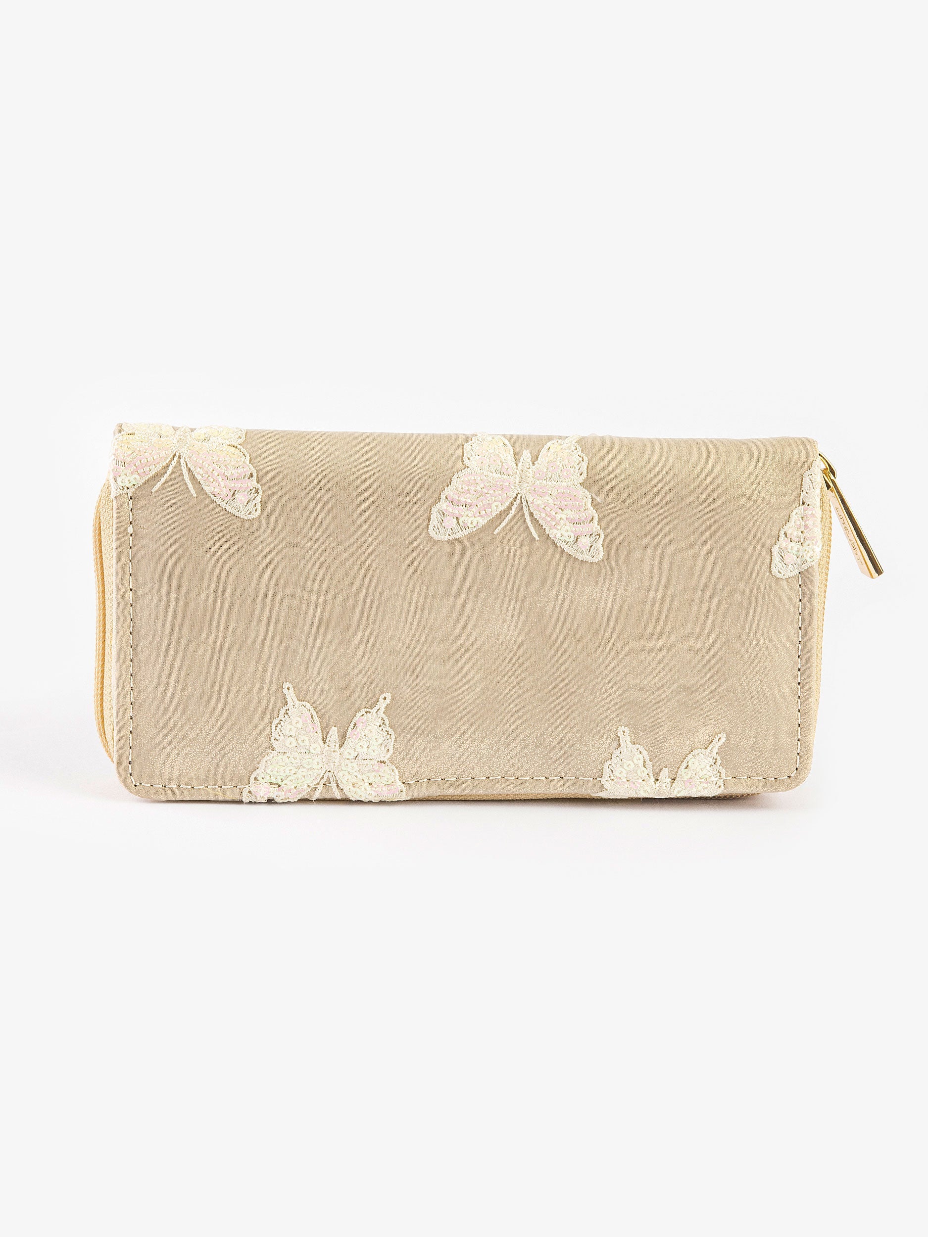 - Wallet embellished with embroidery in butterfly pattern with sequin detailing