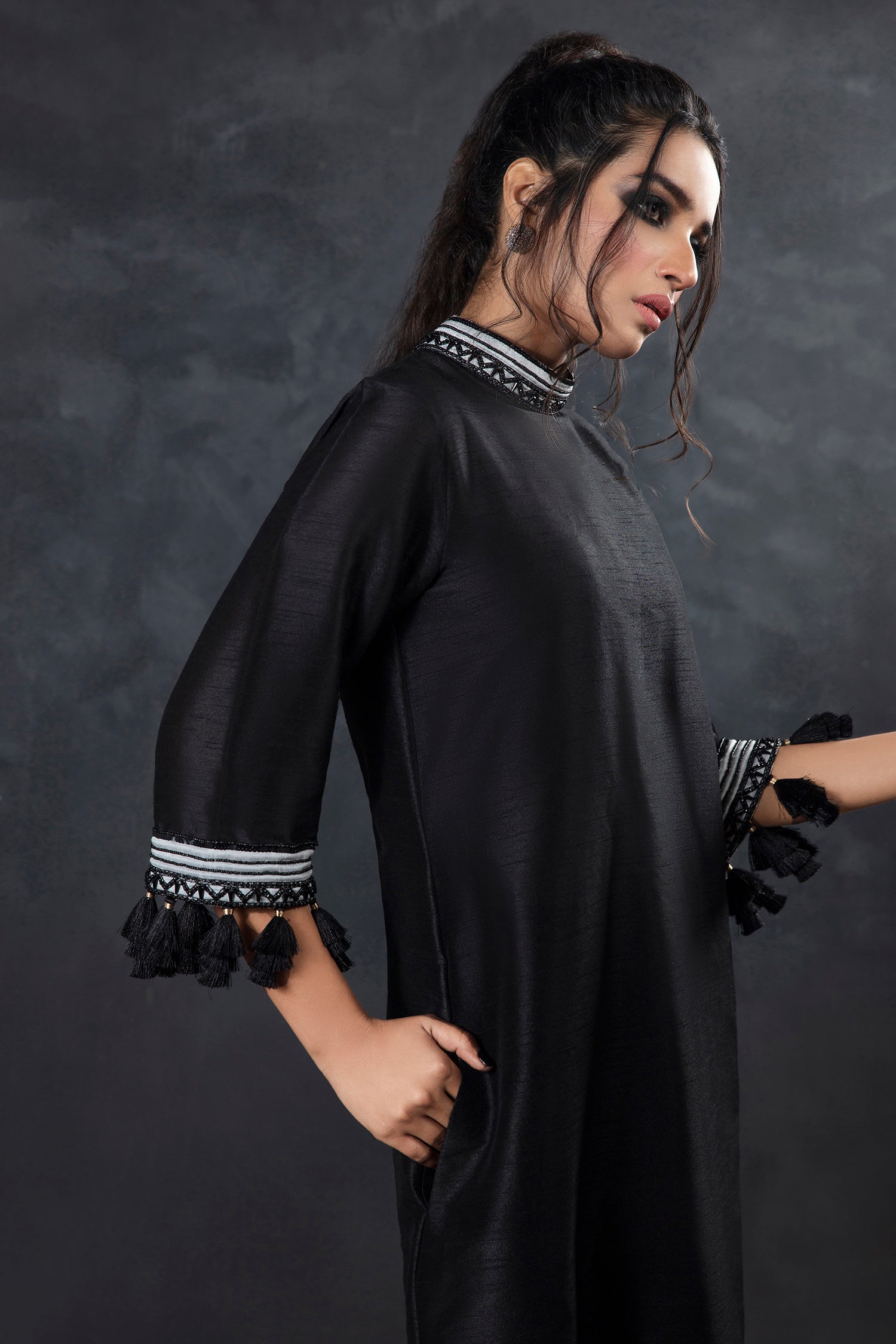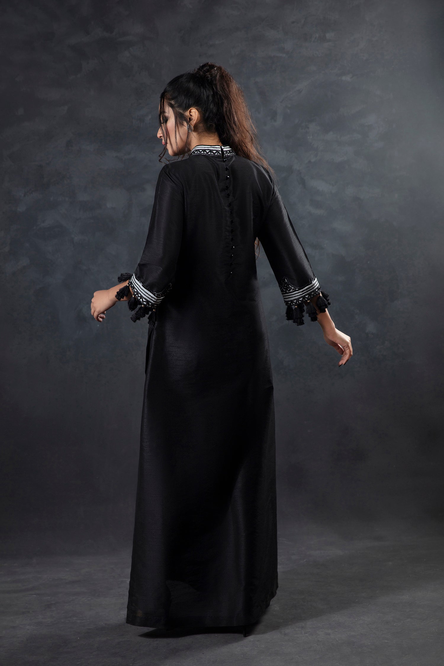 A FLOOR LENGTH KAFTAN WITH A HAND EMBELLISHED COLLAR AND SLEEVES. PERFECT FOR ANY FESTIVE EVENT. COMES WITH BACK BUTTON DETAILING AND LOW SLITS.