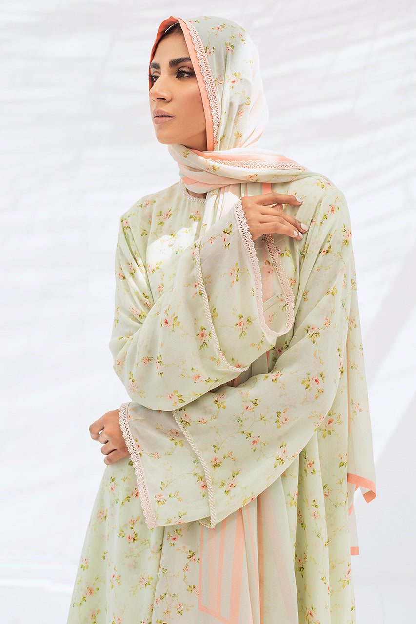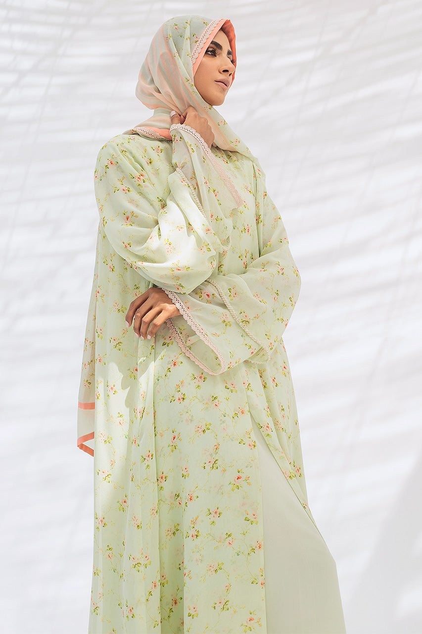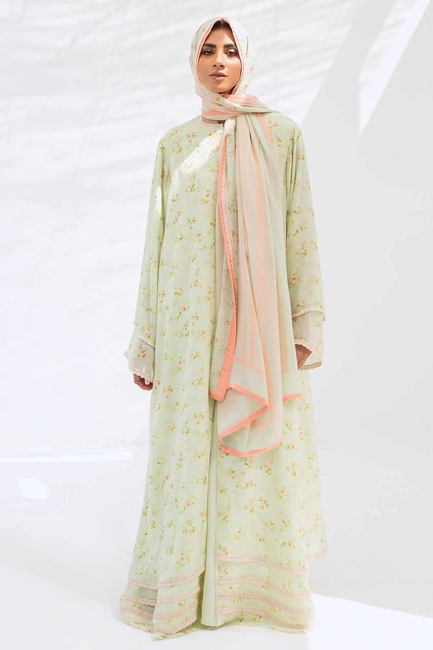 A dreamy shade of mint reminiscent of flower-filled meadows on a printed georgette abaya is an elegant and classy ensemble. Dainty lace on the sleeves and hemline and a matching georgette scarf finish the piece.