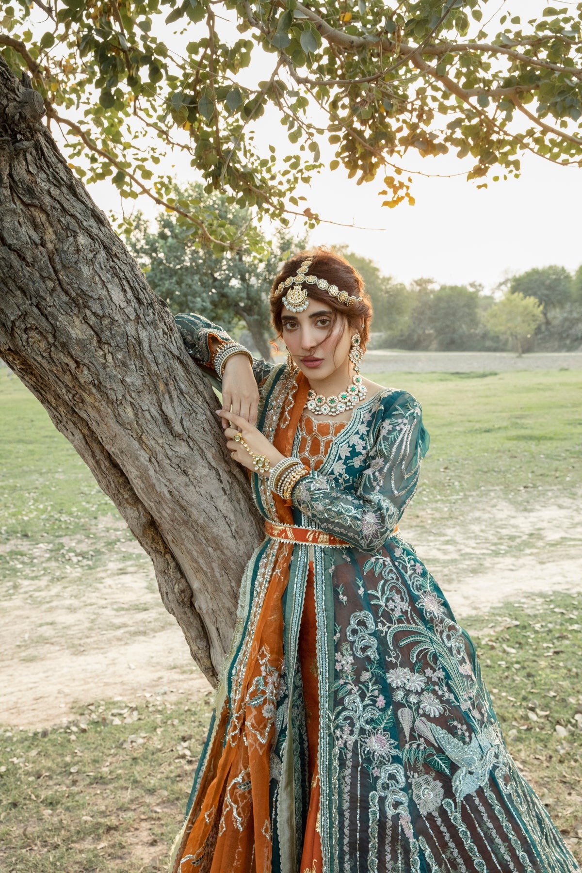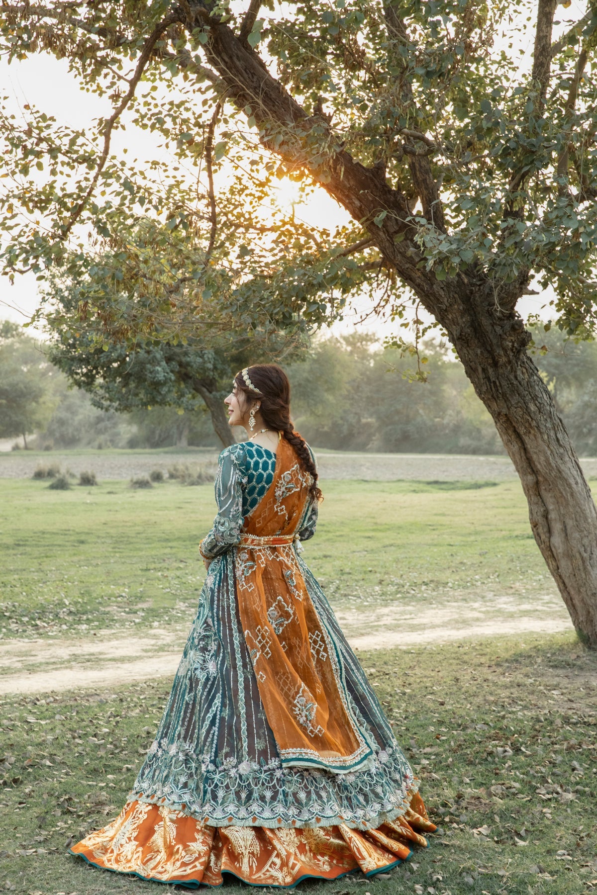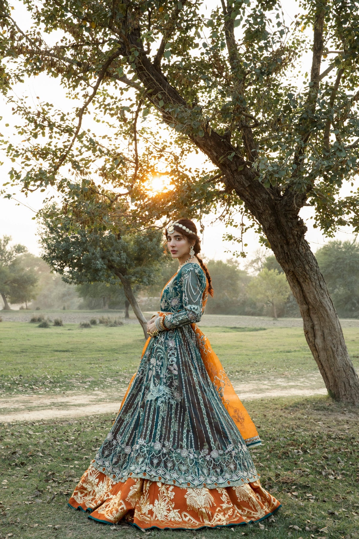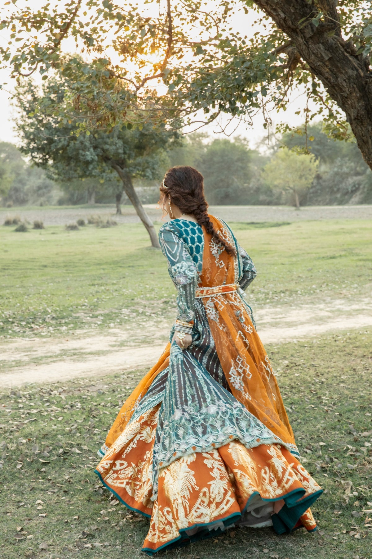 Mehrma features a composed story that is rendered in teal green organza with beige and pink resham threads along with gold tilla and sequins. The gown has seven different design panels that depict a story when joined together. The lehnga is the signature piece with foil-printed organza and a raw silk inner. The duppata is with traditional motif spray and border.
